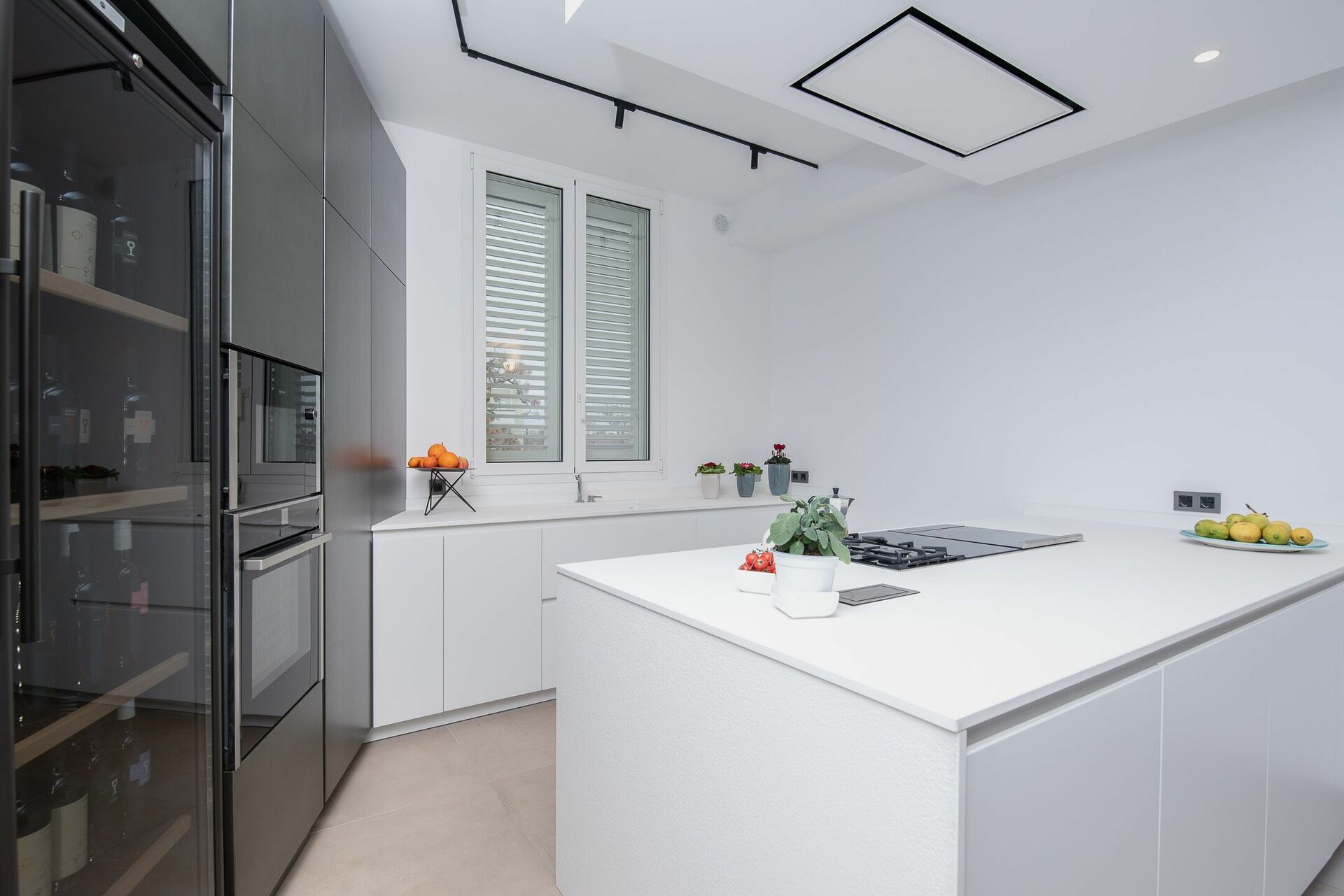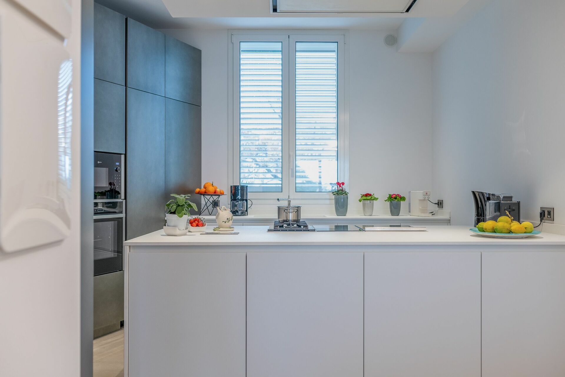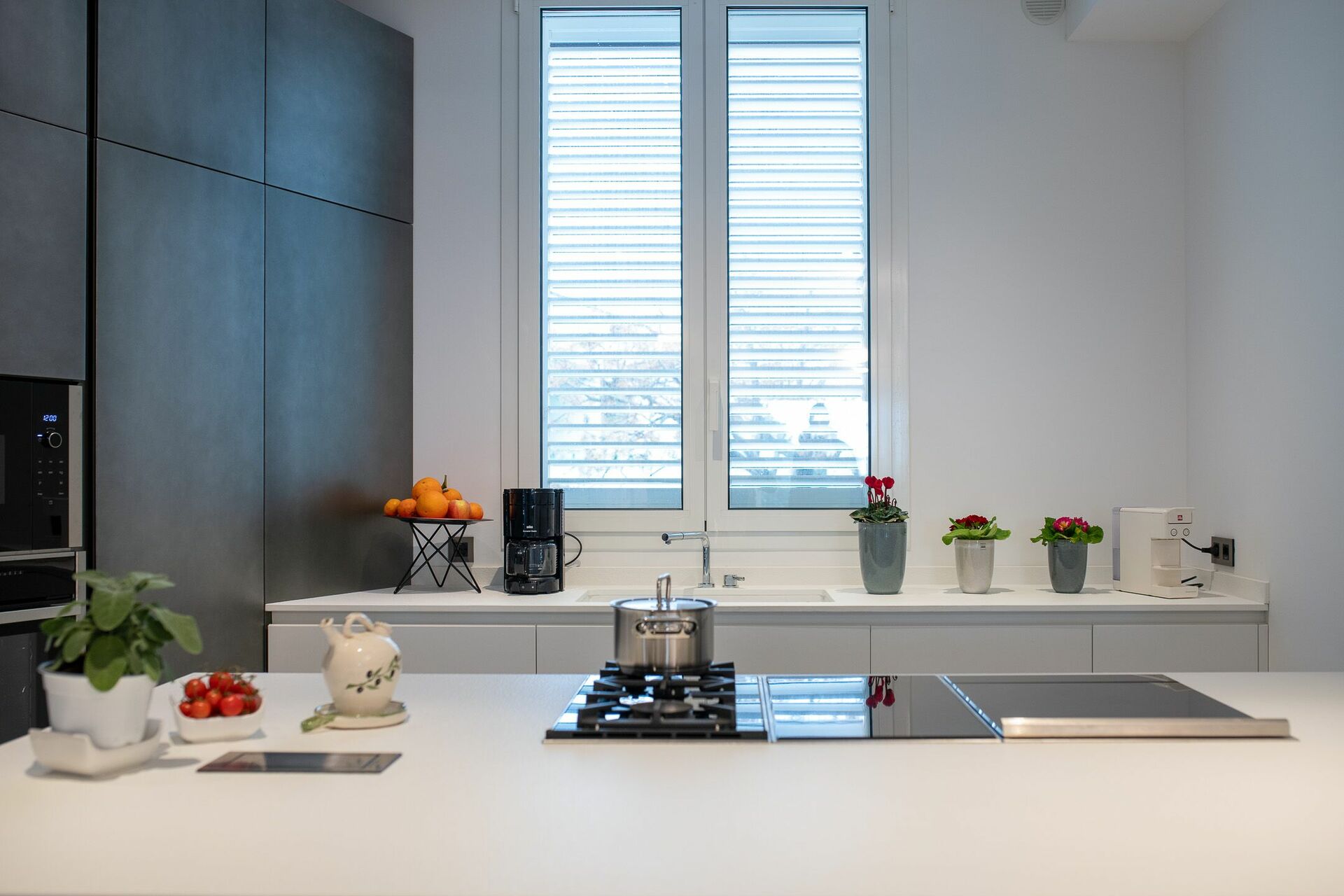 A vista sul soggiorno vedrai la cucina con piano cottura ad isola, con fornelli ad induzione e gas, e cappa aspirante.