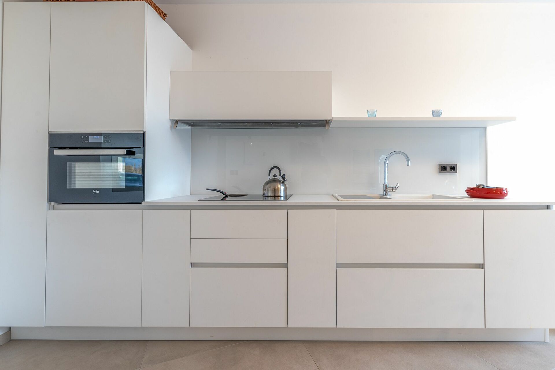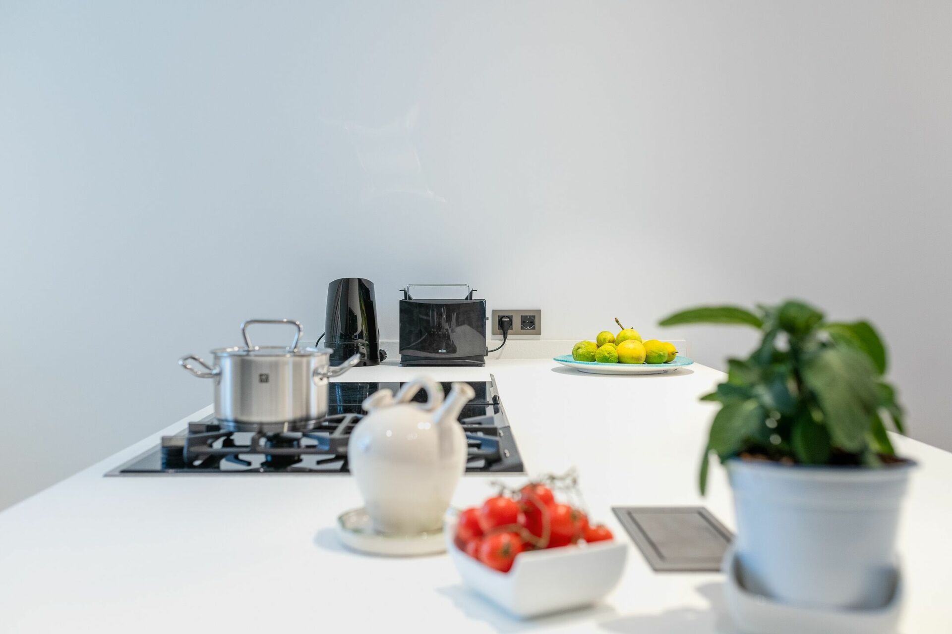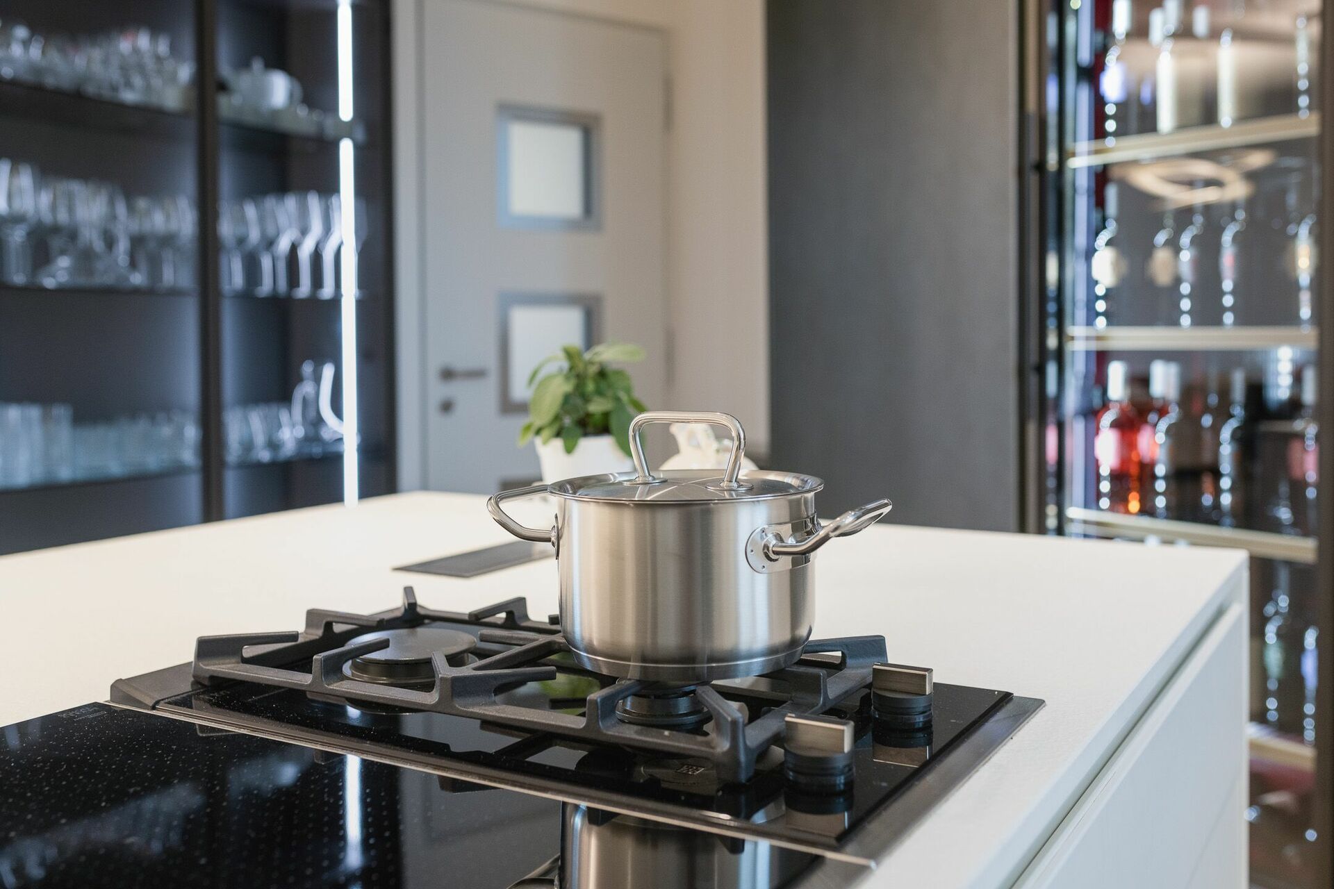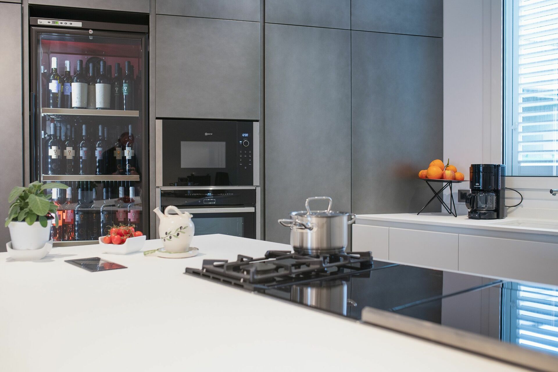 A vista sul soggiorno vedrai la cucina con piano cottura ad isola, con fornelli ad induzione e gas, e cappa aspirante.