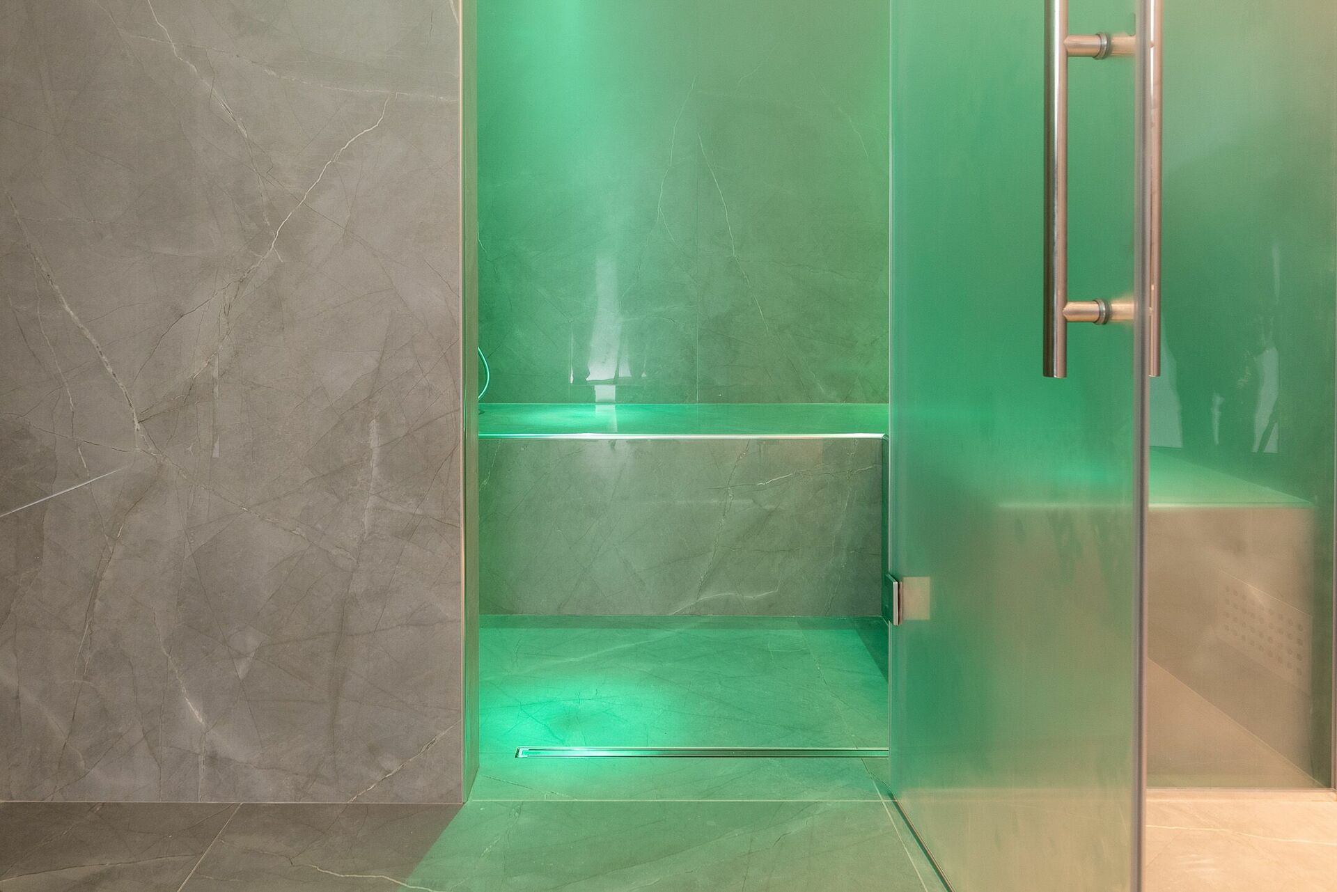 Le restanti tre camere da letto così come la sauna con percorso hammam, sono poste al piano inferiore, raggiungibili dal piano terra.