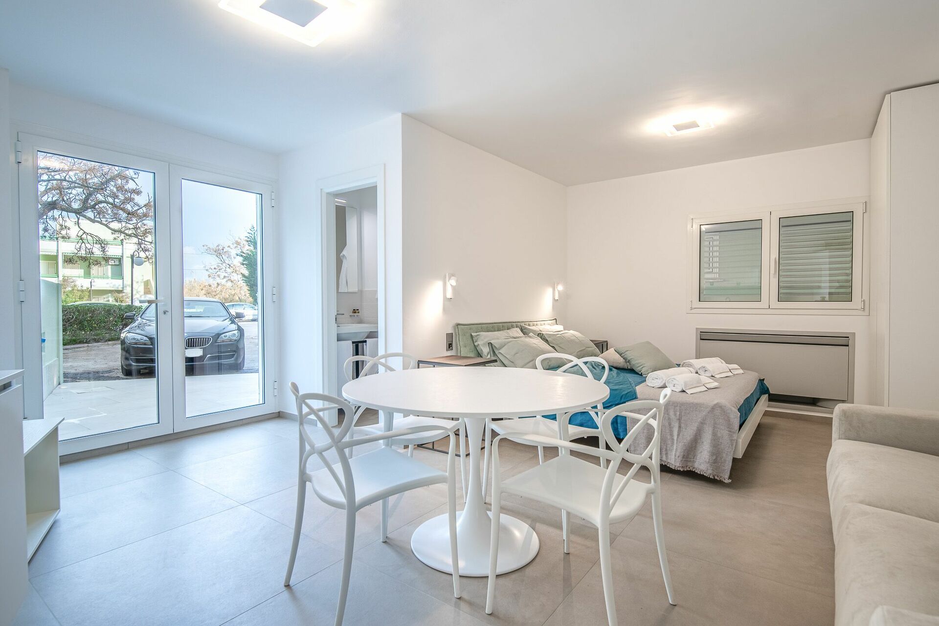 La camera più esterna è una suite con angolo cottura completo con tavolo da pranzo per 4 ospiti, TV e divano, il letto matrimoniale con i 4 cuscini e comodini ai lati, l’ampia porta finestra che permette l’accesso al retro con il posto auto, il bagno collegato completo di lavandino, WC, bidet e doccia.