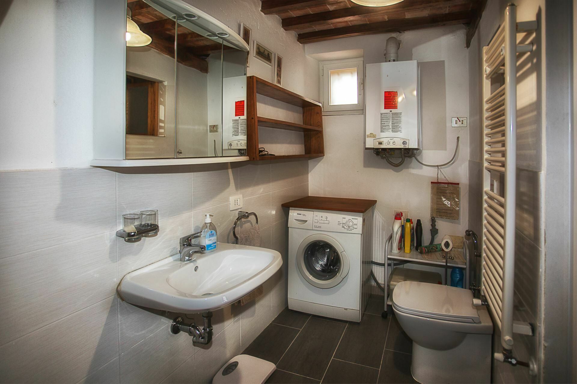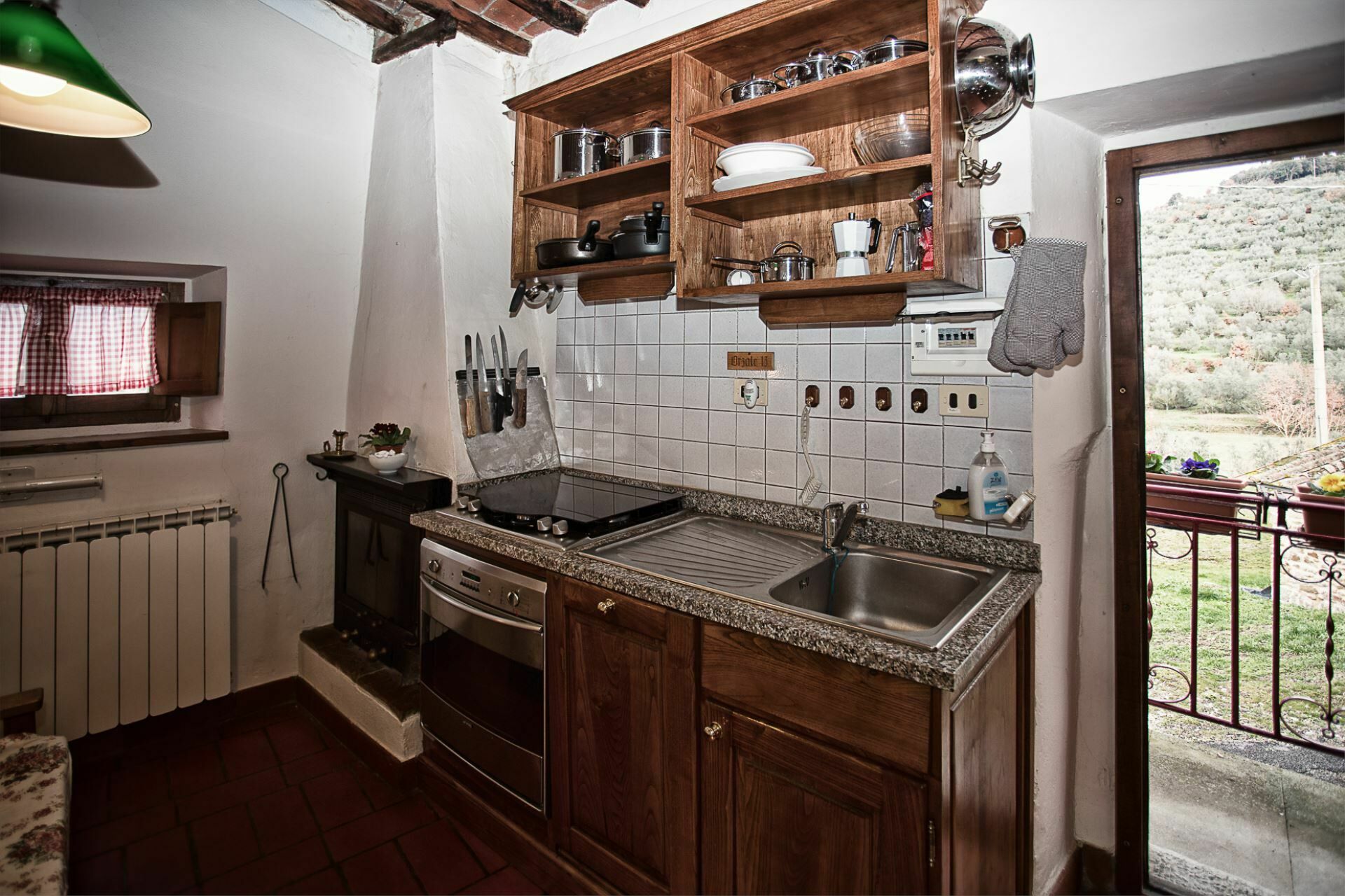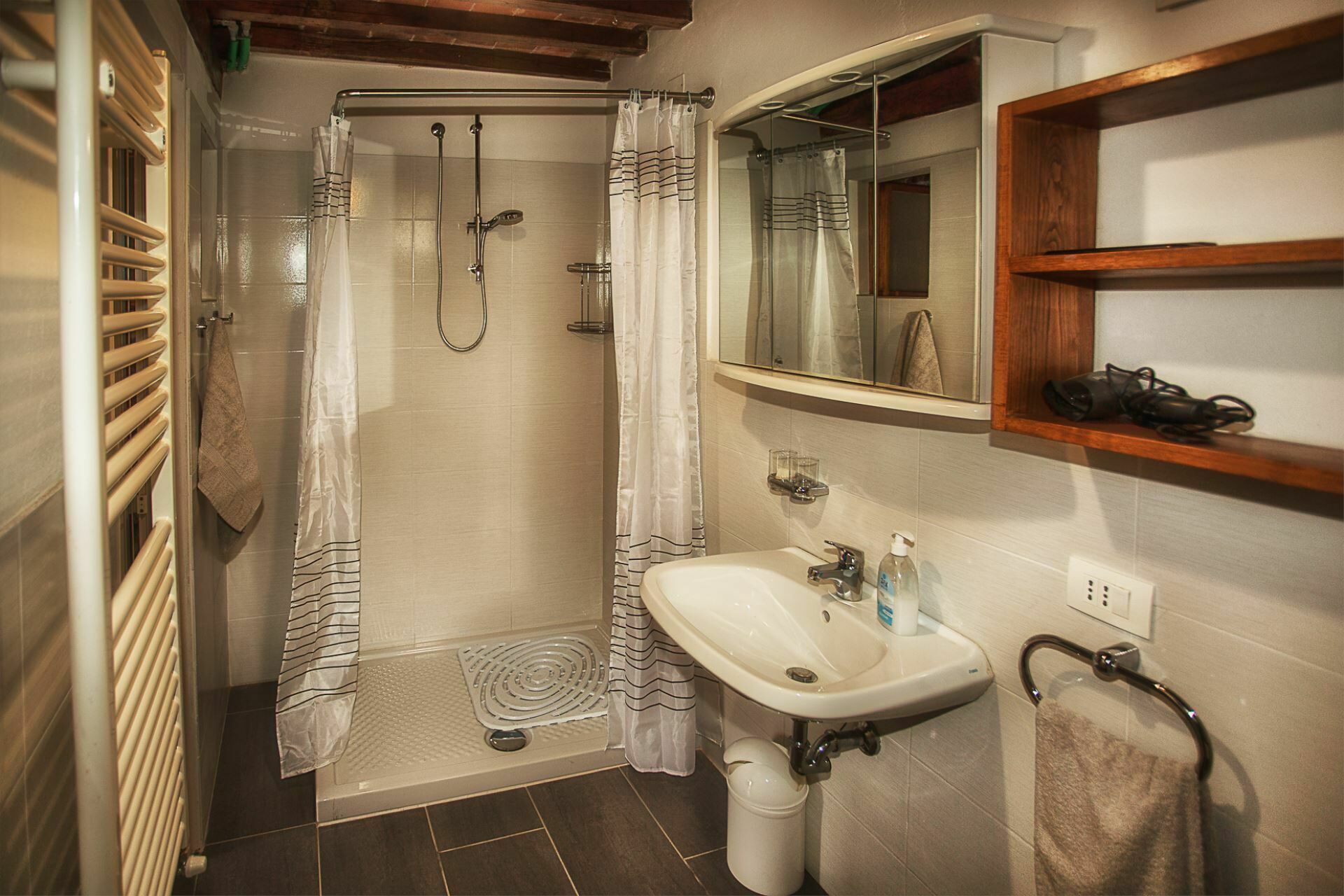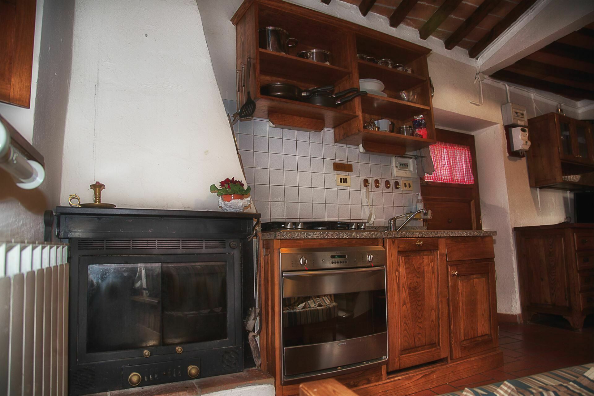 PIANO TERRA: bagno con doccia e lavatrice. PIANO RIALZATO: con accesso sia da scala interna che da scala esterna, si trovano soggiorno-pranzo con angolo cottura e camino, e una camera matrimoniale.