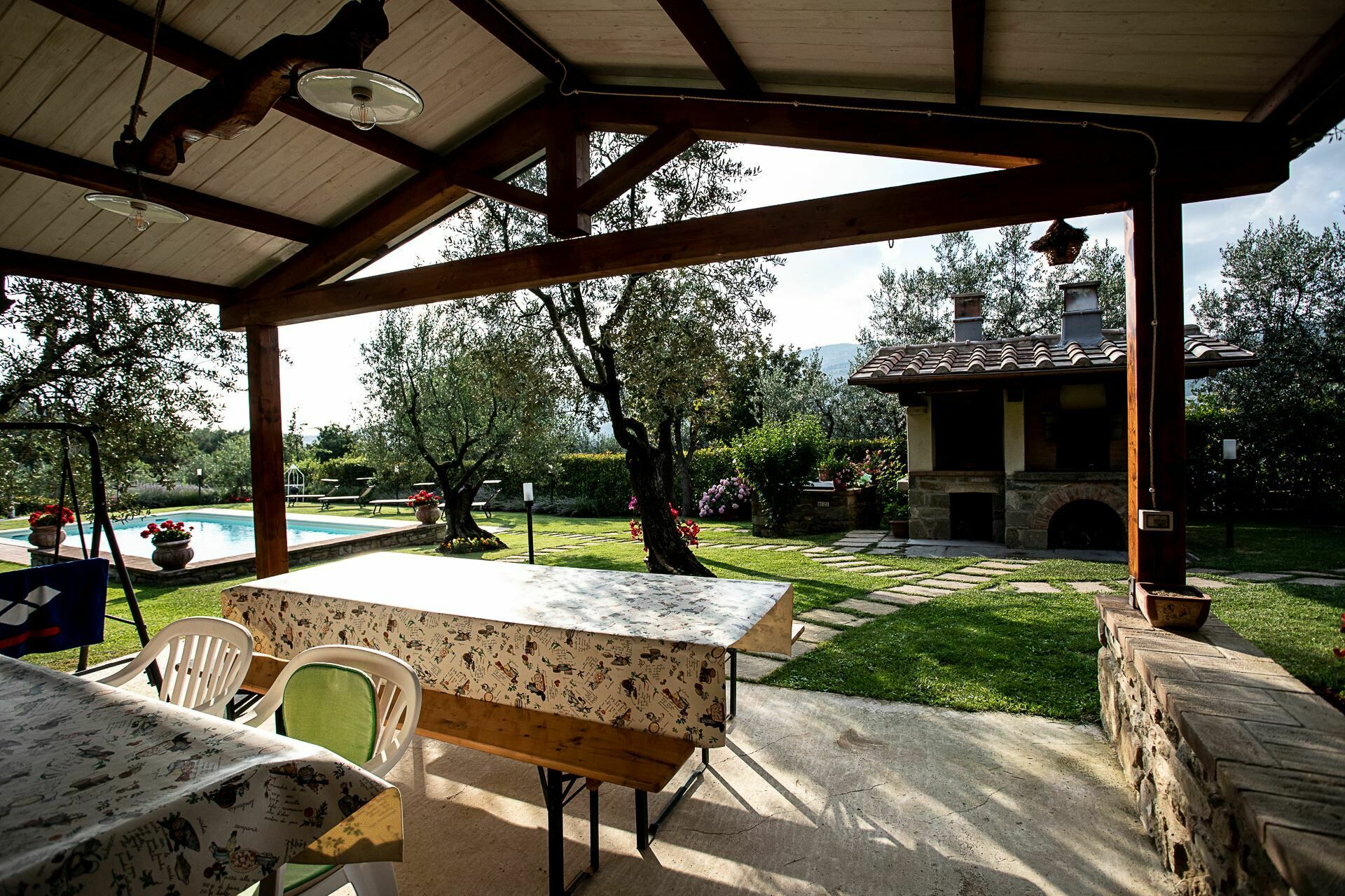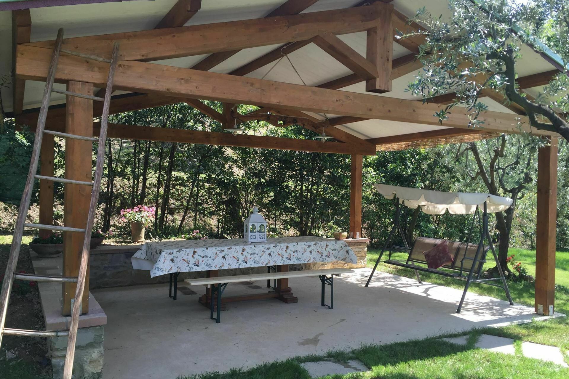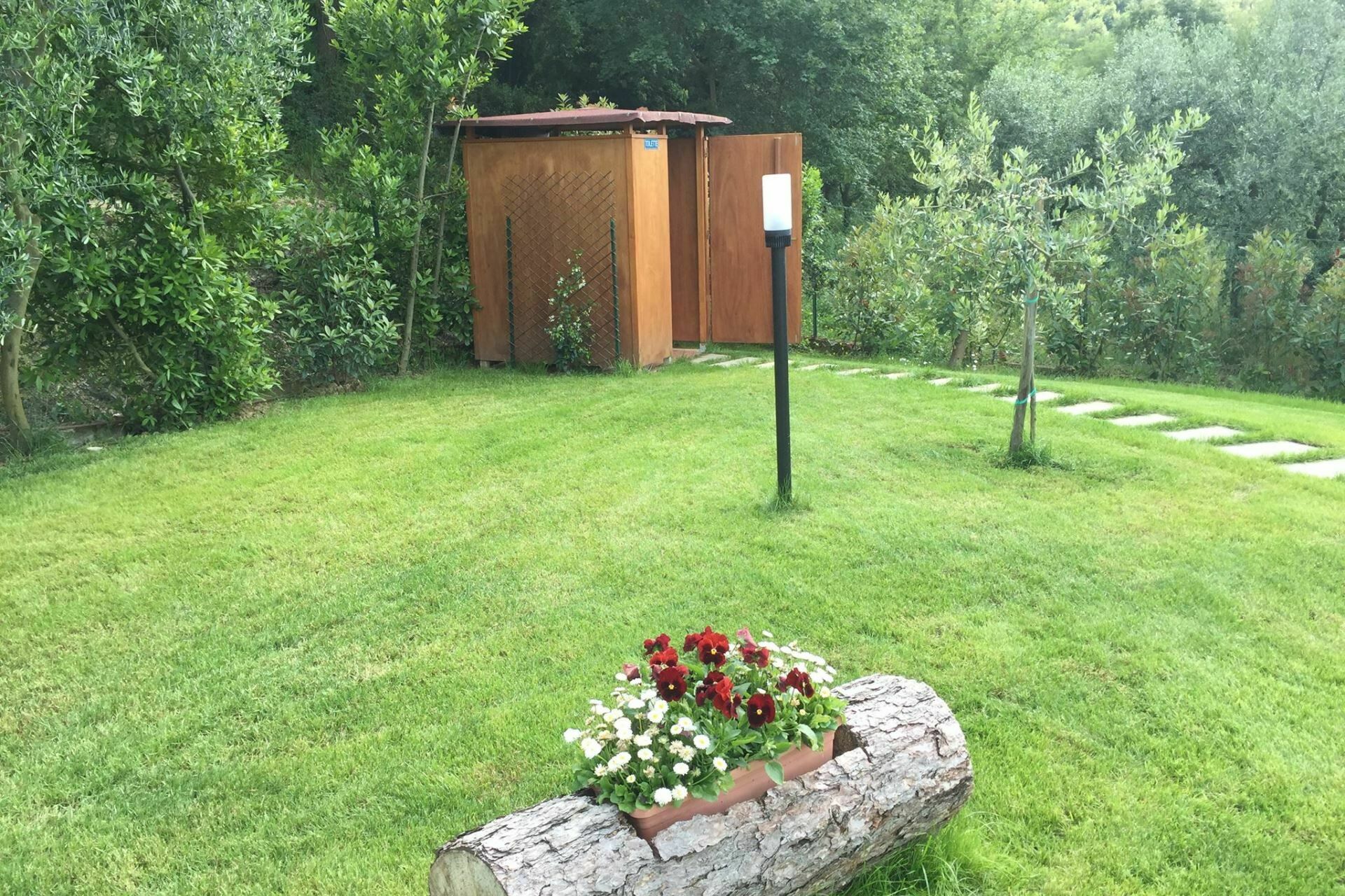 A circa 30 m dalla casetta si trova il giardino completamente recintato (circa 1250 m2) dove, per l’uso esclusivo degli ospiti, si trovano la piscina (dim. 5x12 m. – profondità 1,40 m.), un bagno (lavandino e wc), la doccia esterna, un grande gazebo in legno attrezzato con tavolo e sedie, il barbecue ed il forno a legna dove potersi divertire a preparare appetitosi pranzi e cene.
