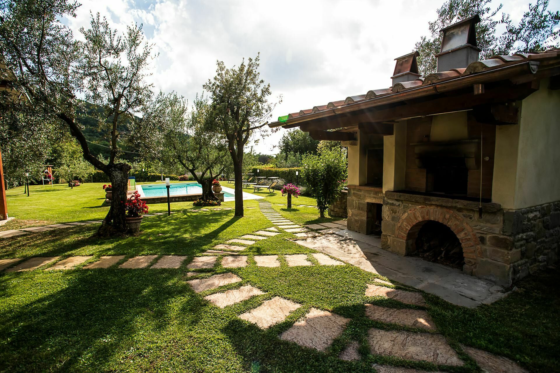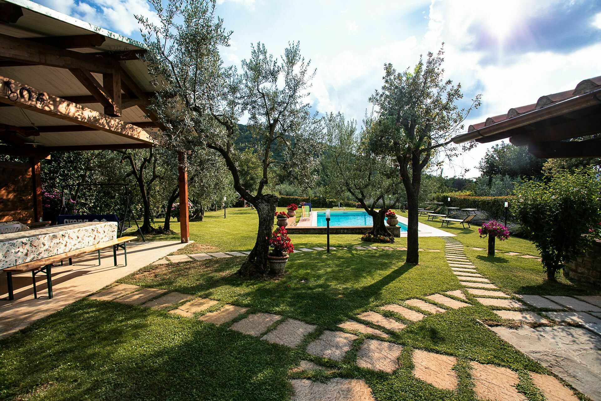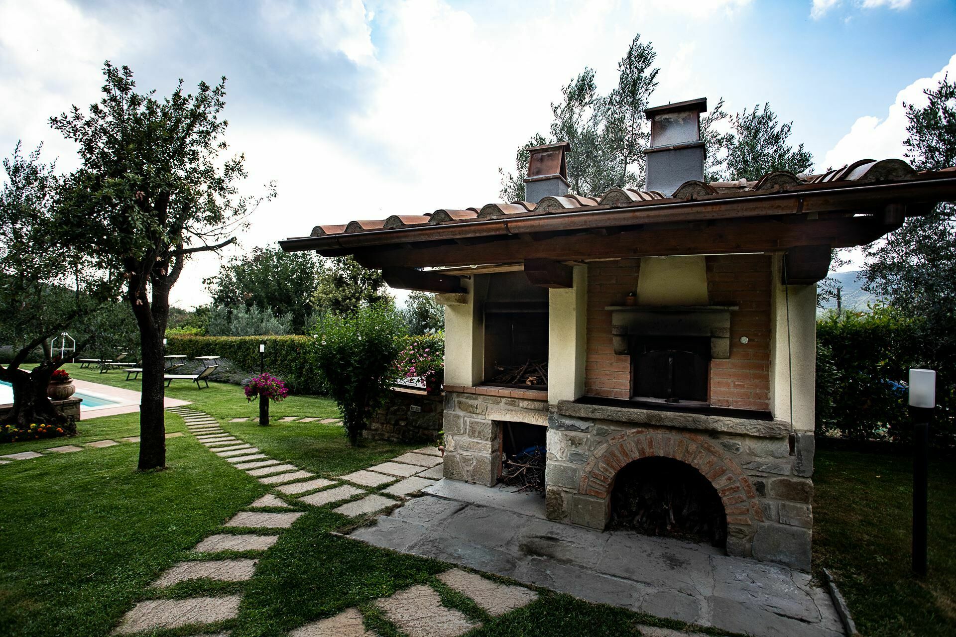 A circa 30 m dalla casetta si trova il giardino completamente recintato (circa 1250 m2) dove, per l’uso esclusivo degli ospiti, si trovano la piscina (dim. 5x12 m. – profondità 1,40 m.), un bagno (lavandino e wc), la doccia esterna, un grande gazebo in legno attrezzato con tavolo e sedie, il barbecue ed il forno a legna dove potersi divertire a preparare appetitosi pranzi e cene.