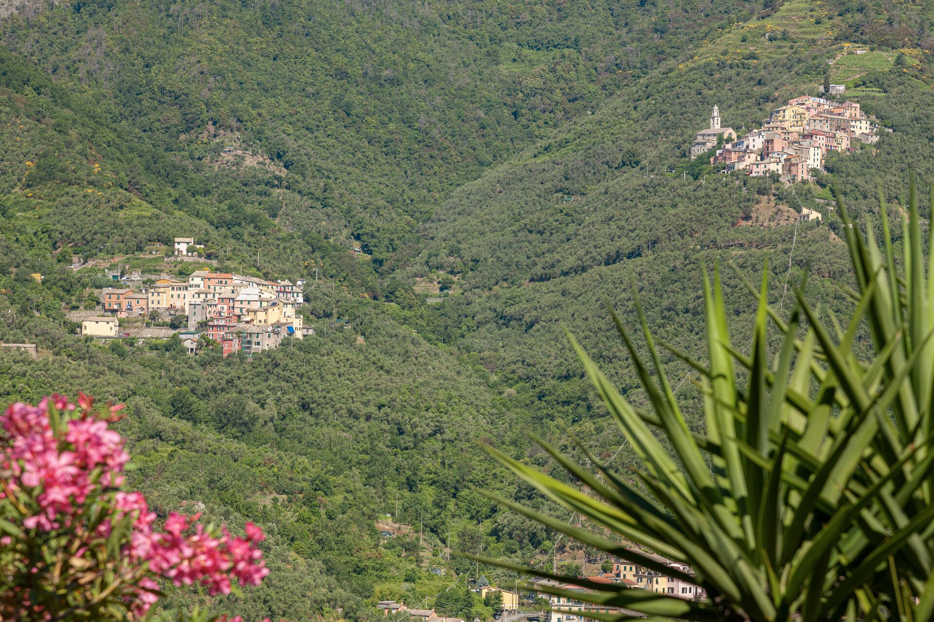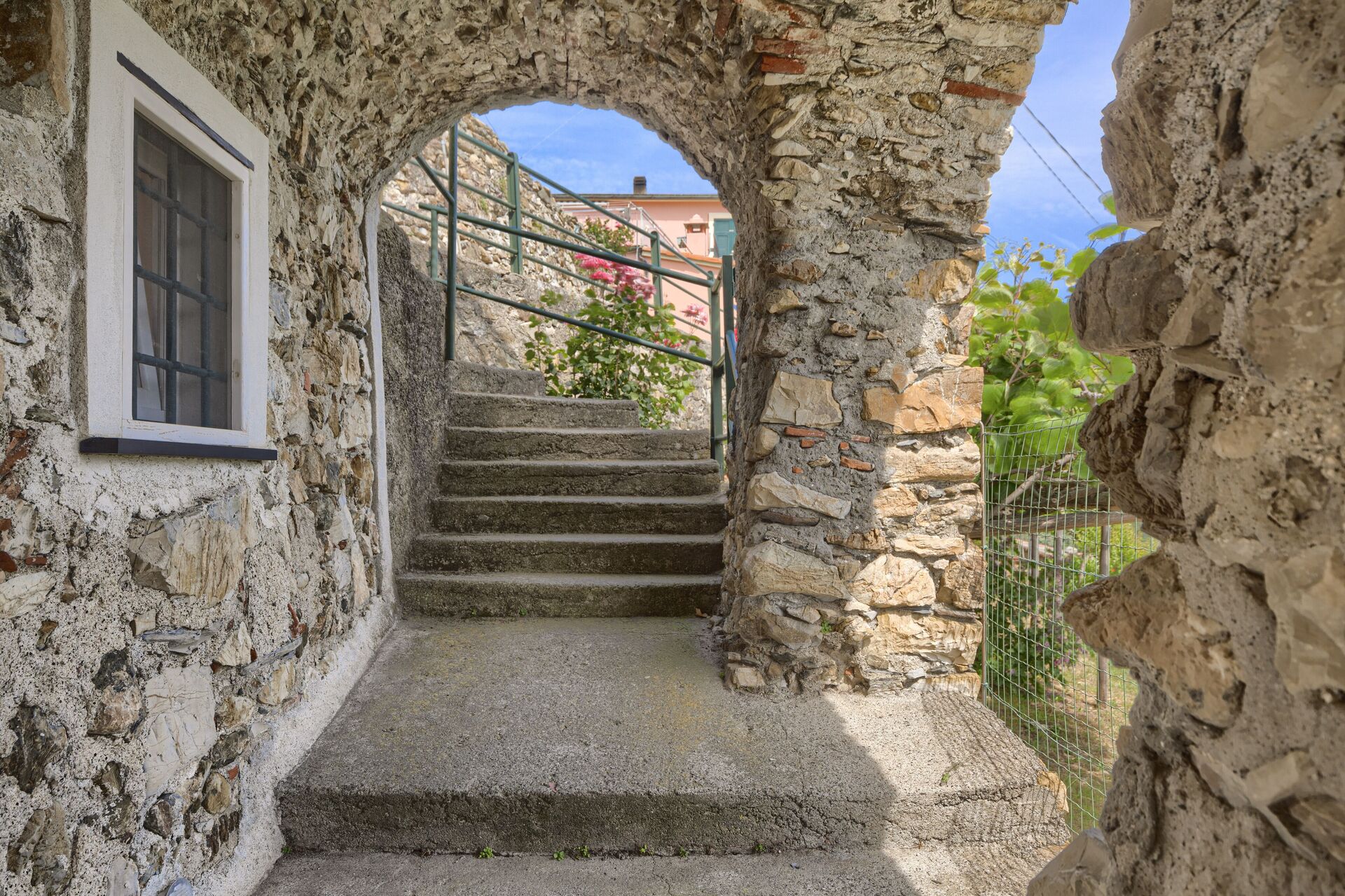 La camera da letto ha un’uscita in un tipico caruggio Ligure, sotto un antico portico in pietra, con vista panoramica.