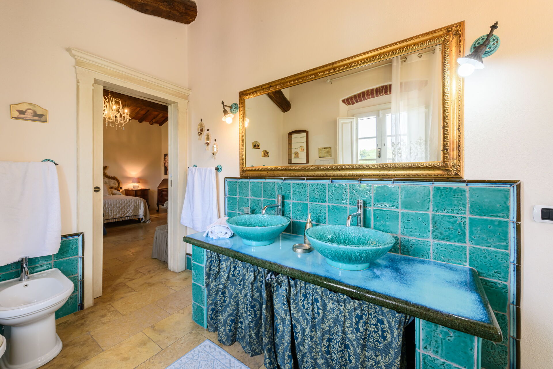 Camera da letto con bagno: letto matrimoniale, internet WIFI, aria condizionata, vasca da bagno idromassaggio, lavandino, wc, bidet.
