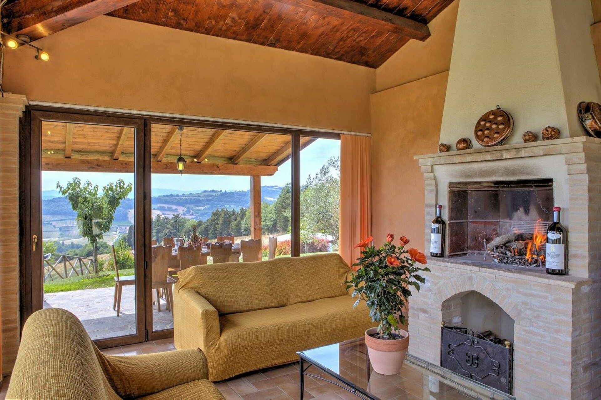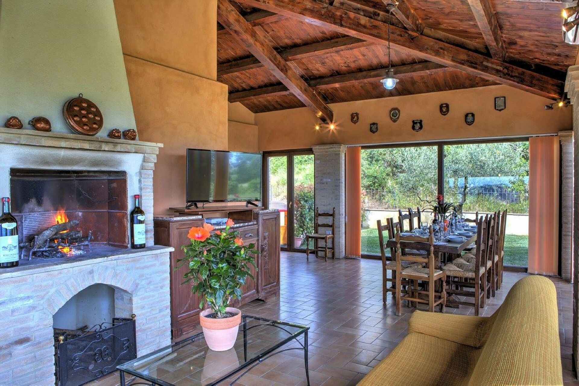 Soggiorno 1: due divani, caminetto, tavolo da pranzo (persone: 10), internet WIFI, aria condizionata, televisione, uscita sul giardino, uscita sul patio.