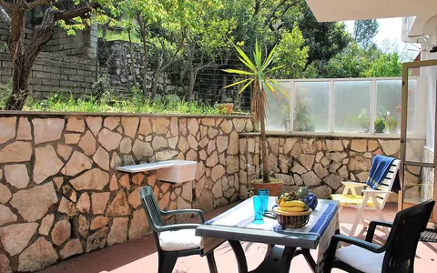Al piano superiore ci sono due camere da letto matrimoniali, ciascuna con aria condizionata e un'uscita sul balcone. Inoltre, c'è una stanza con tre letti e aria condizionata, anch'essa con un'uscita sul balcone. Avrai accesso a una vasca, un bidet e un WC a questo livello. L'appartamento vanta un balcone di 30 metri quadrati e un giardino di 30 metri quadrati, offrendo una parziale vista sul mare. I servizi inclusi nel tuo affitto vacanza sono una lavatrice, zanzariere, un asciugacapelli e internet (WiFi). È ammesso un piccolo animale domestico o un cane.