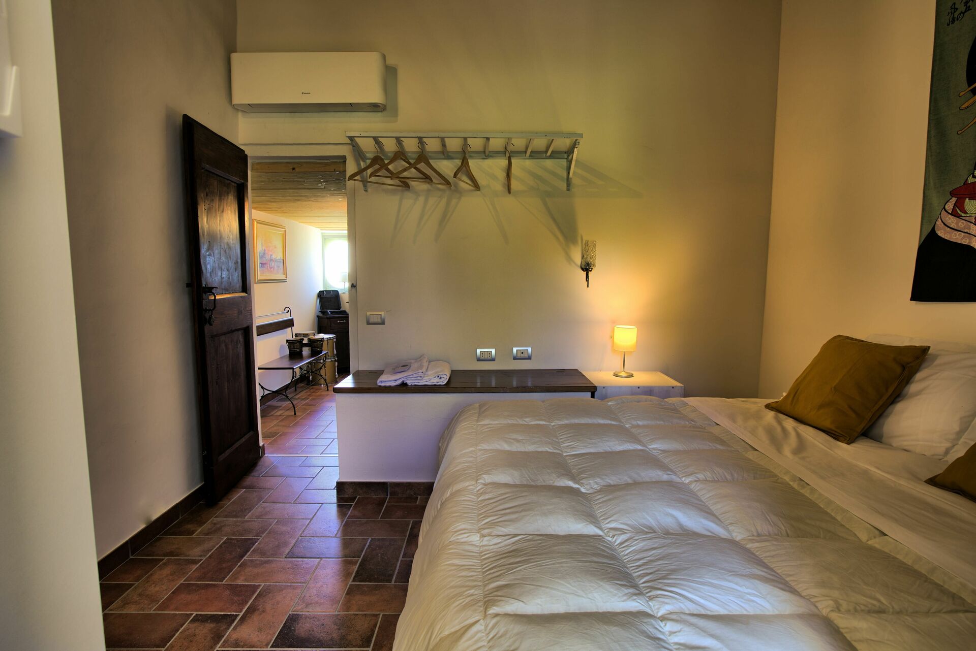 Camera da letto con bagno: letto matrimoniale, internet WIFI, poltrona, scrivania, lavandino, wc, bidet, doccia, asciugacapelli, uscita sul giardino.