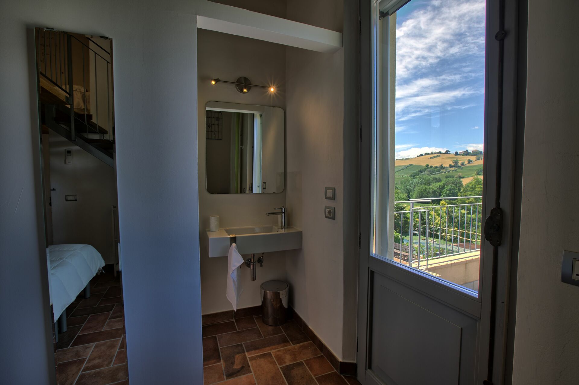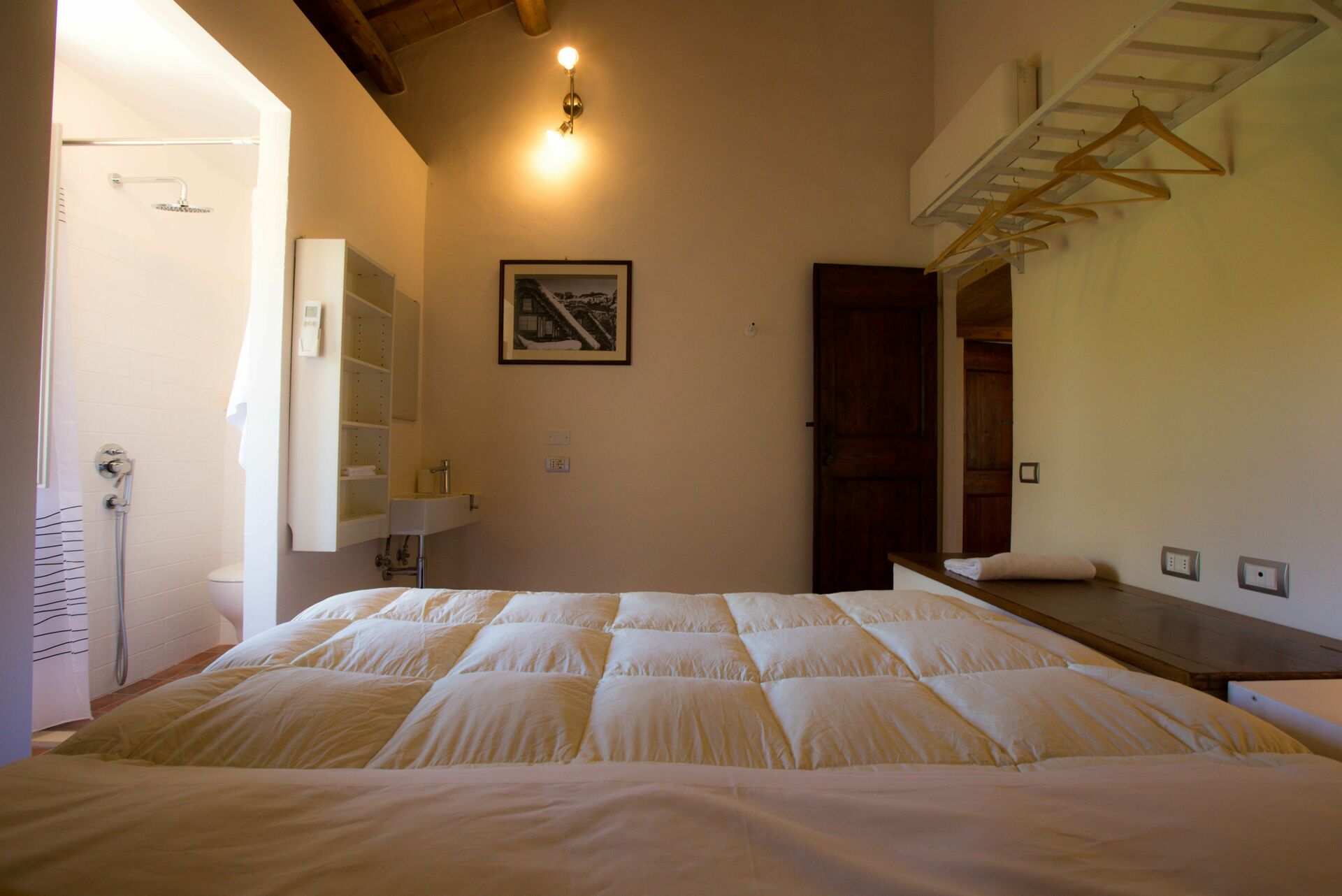 Camera da letto con bagno 1: letto matrimoniale, internet WIFI, poltrona, scrivania, lavandino, wc, bidet, doccia, asciugacapelli.