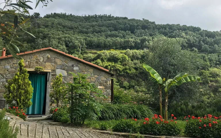 Casa piccola, circondata da alberi, prati e campi. Sotto Pietrabruna, a 1 km dal centro, posizione isolata, a 10 km dal mare, in una strada senza uscita, immerso nel verde. In comune: terreno allo stato naturale 3'000 m2 con giardino naturale. Per uso privato: piccolo giardino. Mobili da giardino, barbecue. Accesso 200 m di strada molto sterrata, ripida (strada non asfaltata). Parcheggio (per 2 auto) presso la casa, parcheggio pubblico 200 m.