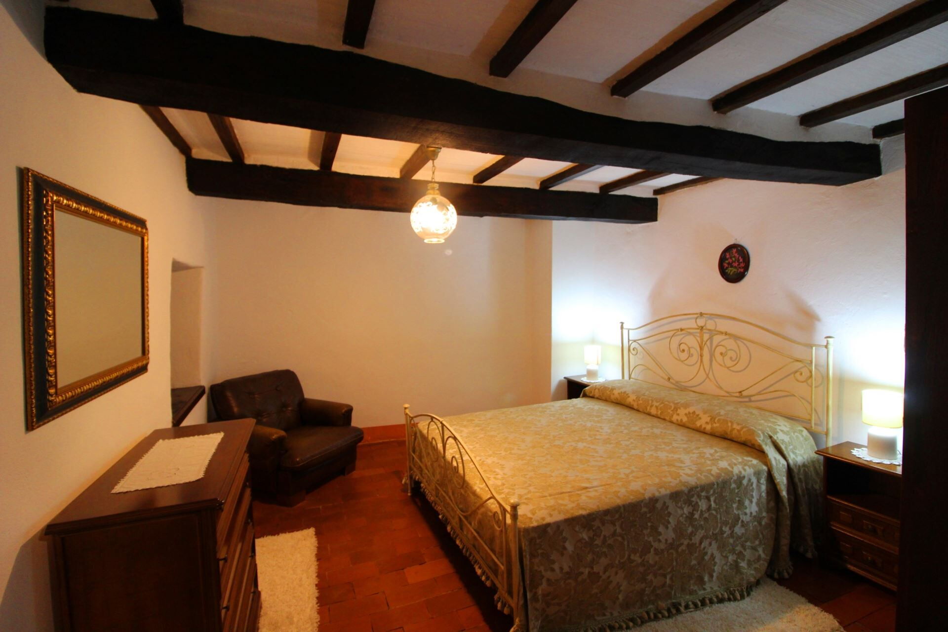 PIANO PRIMO: raggiungibile da scala esterna con terrazzino panoramico, ingresso su ampio soggiorno-pranzo con angolo cottura e antico camino. Salendo alcuni gradini si accede a due camere matrimoniali e ad un bagno con doccia. Possibilità di aggiungere un letto singolo in una delle camere al piano primo.