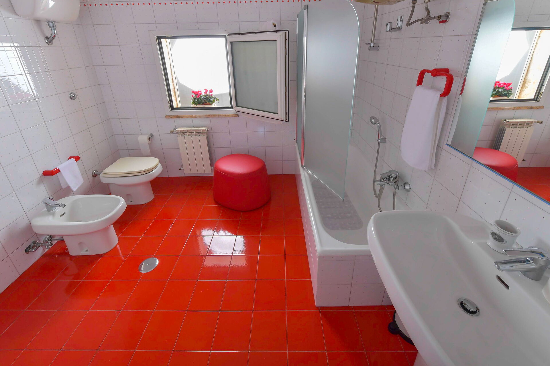 Bagno: lavandino, wc, bidet, vasca da bagno, ferro da stiro, asciugacapelli, zanzariere.
