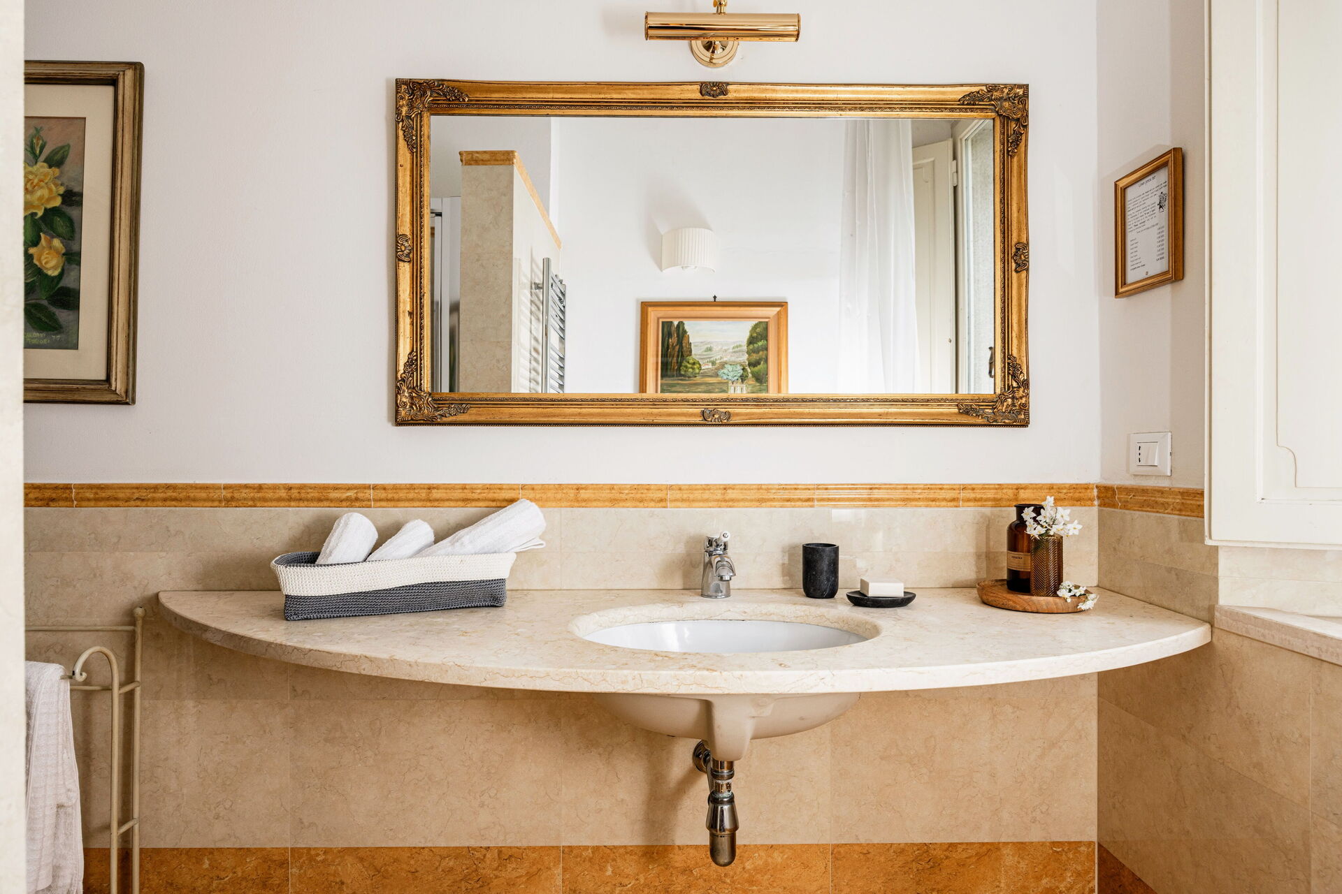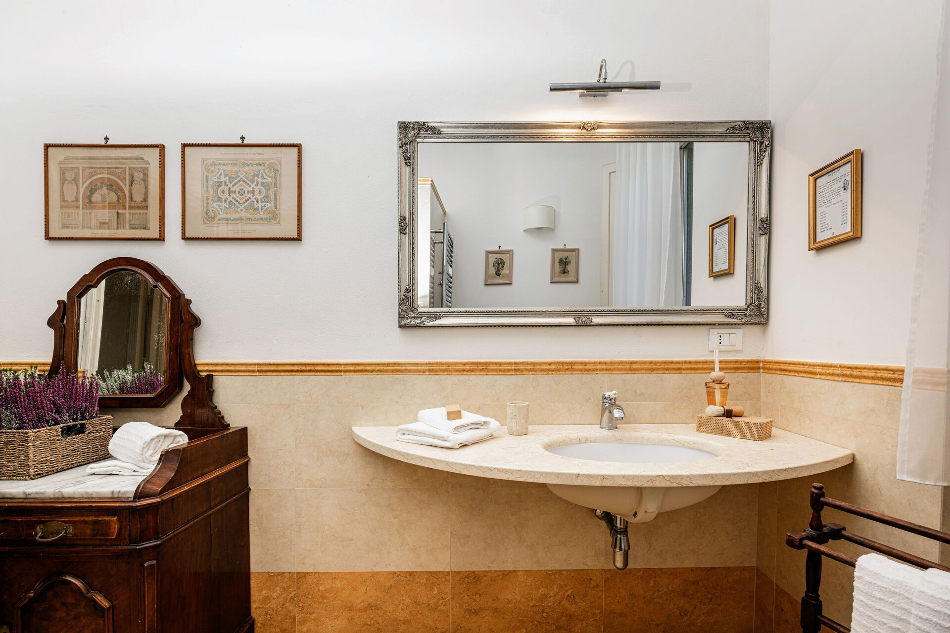 Camera da letto con bagno 4: letto matrimoniale (larghezza: 160m, lunghezza: 190m), internet WIFI, aria condizionata, lavandino, wc, asciugacapelli, bagno senza finestra.
