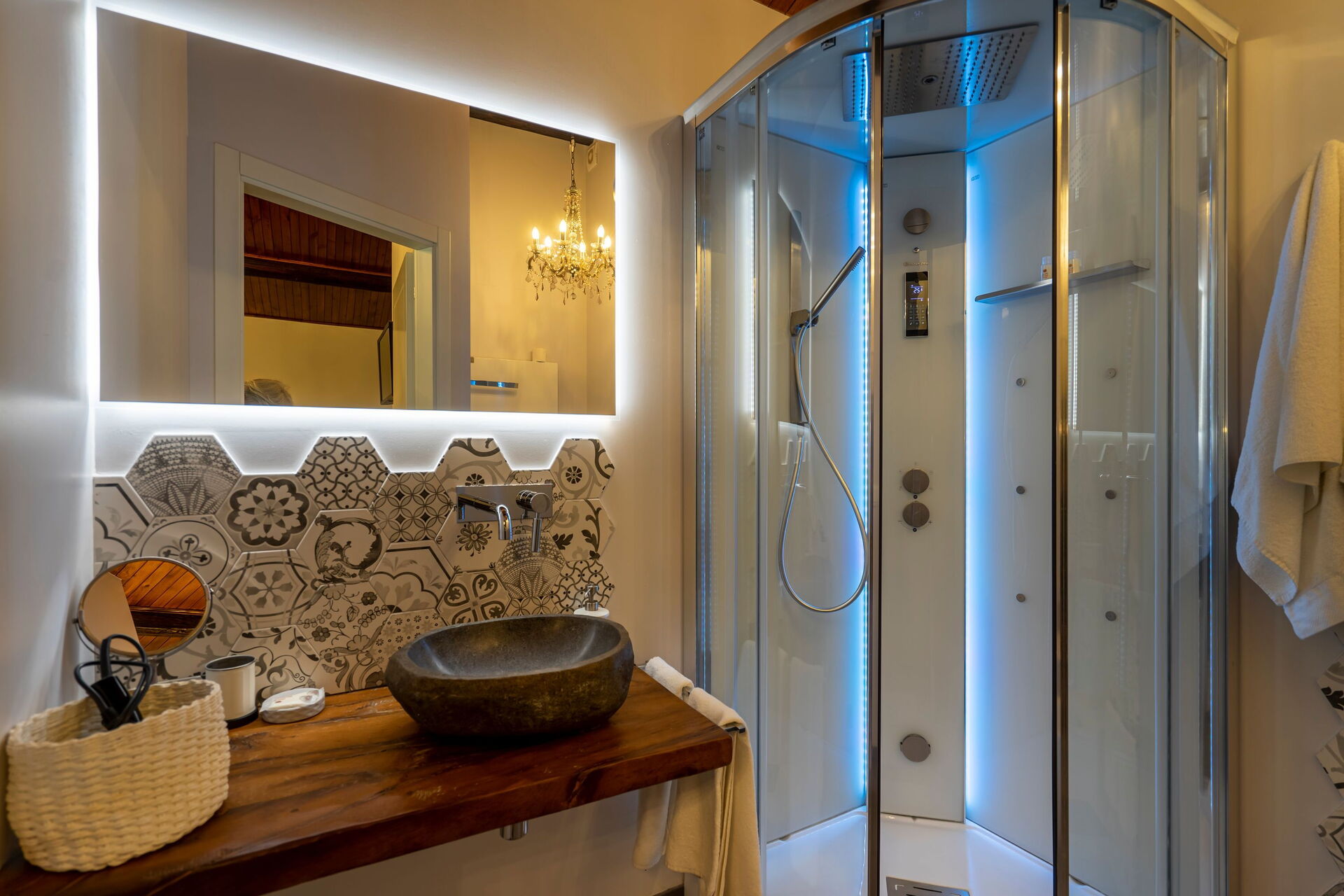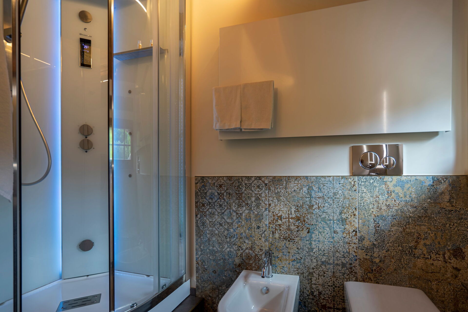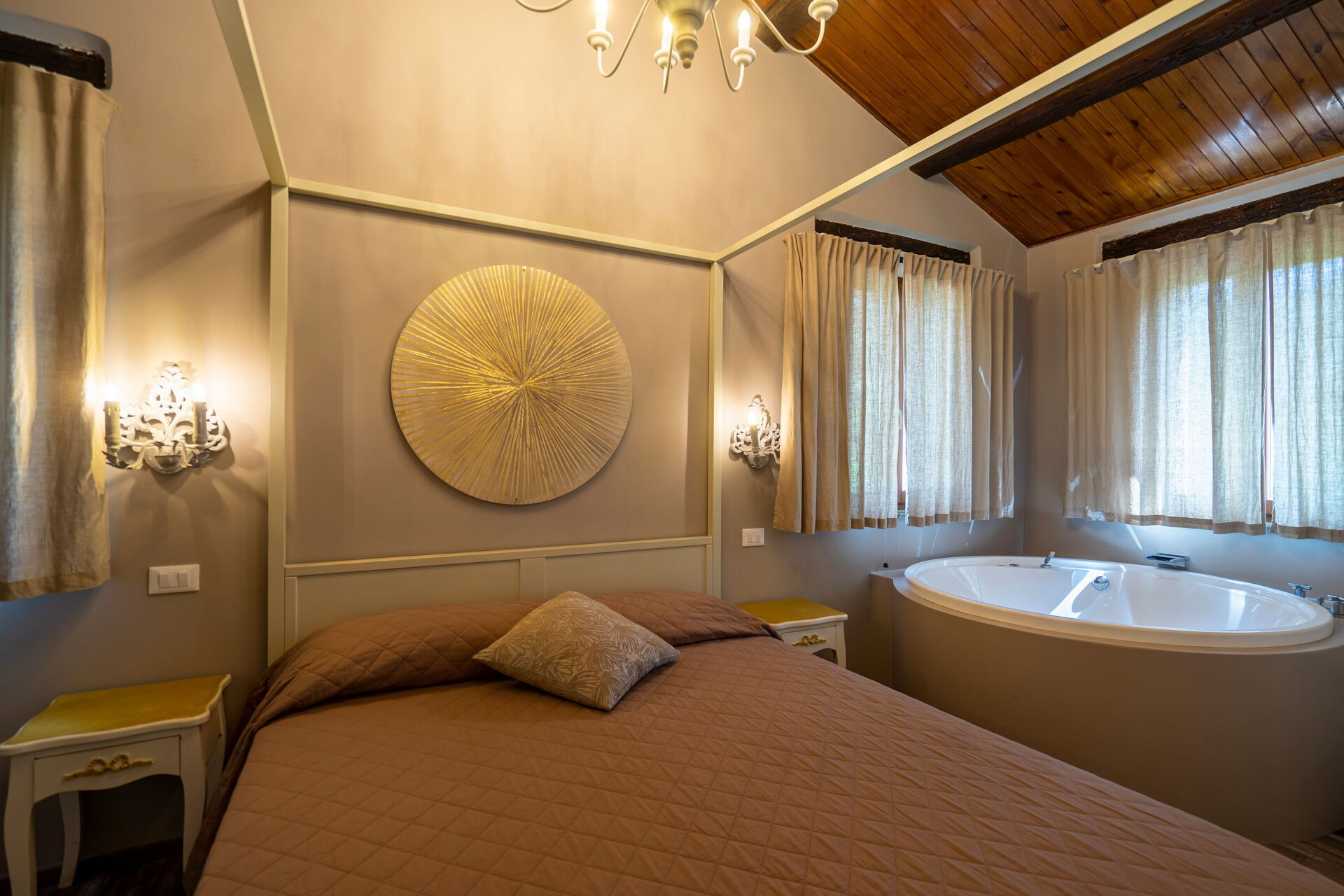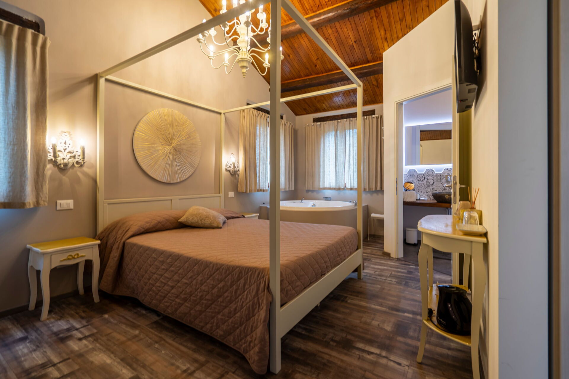 Primo piano: camera matrimoniale (aria condizionata, televisione, frigo bar) con bagno privato con doccia multifunzione con cromoterapia e bagno turco; camera matrimoniale (aria condizionata, televisione, frigo bar) con divano letto singolo, vasca idromassaggio e cromoterapia e bagno privato con doccia multifunzione con cromoterapia e bagno turco.
