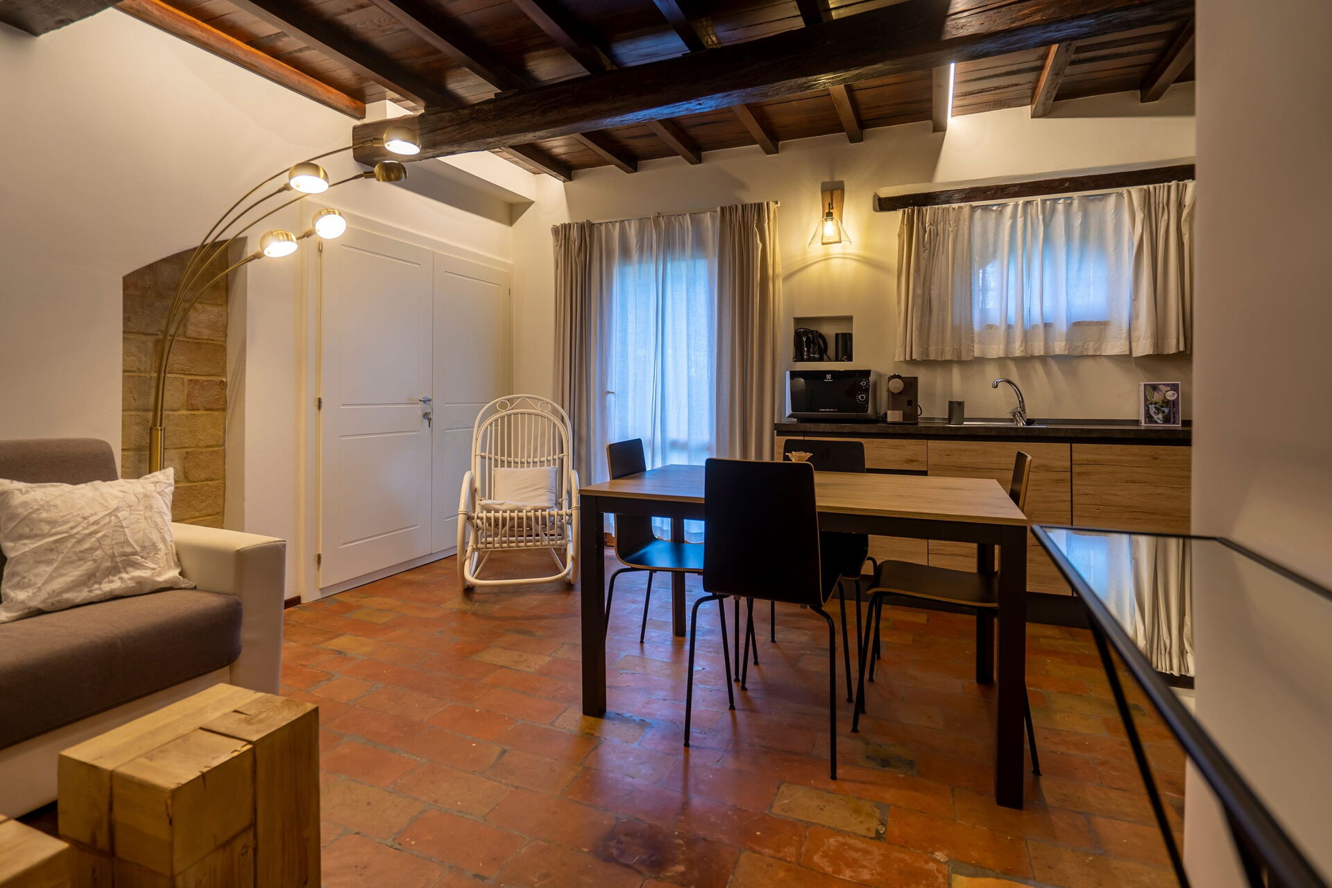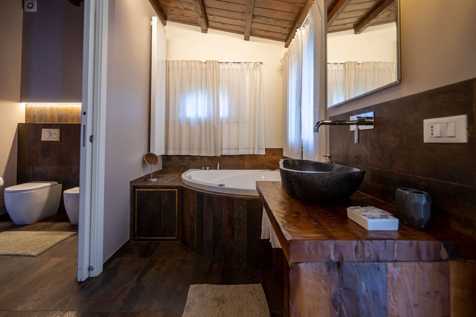 Piano terreno: soggiorno (aria condizionata, tv) con zona pranzo e cucina (piano cottura, forno, freezer, frigorifero, lavastoviglie, macchina per il caffe); suite con soggiorno con camino, divano letto matrimoniale, tv, camera matrimoniale (aria condizionata, televisione, frigo bar) con vasca idromassaggio e cromoterapia con bagno privato con doccia a filo pavimento (ideale per persone con ridotta mobilità), accesso a patio privato con vista sul parco; suite con soggiorno con camino, angolo cottura (piano cottura, frigorifero), divano letto singolo, tv, camera matrimoniale (aria condizionata, televisione, frigo bar) con vasca idromassaggio e cromoterapia ad angolo e bagno privato con doccia multifunzione con cromoterapia e bagno turco.