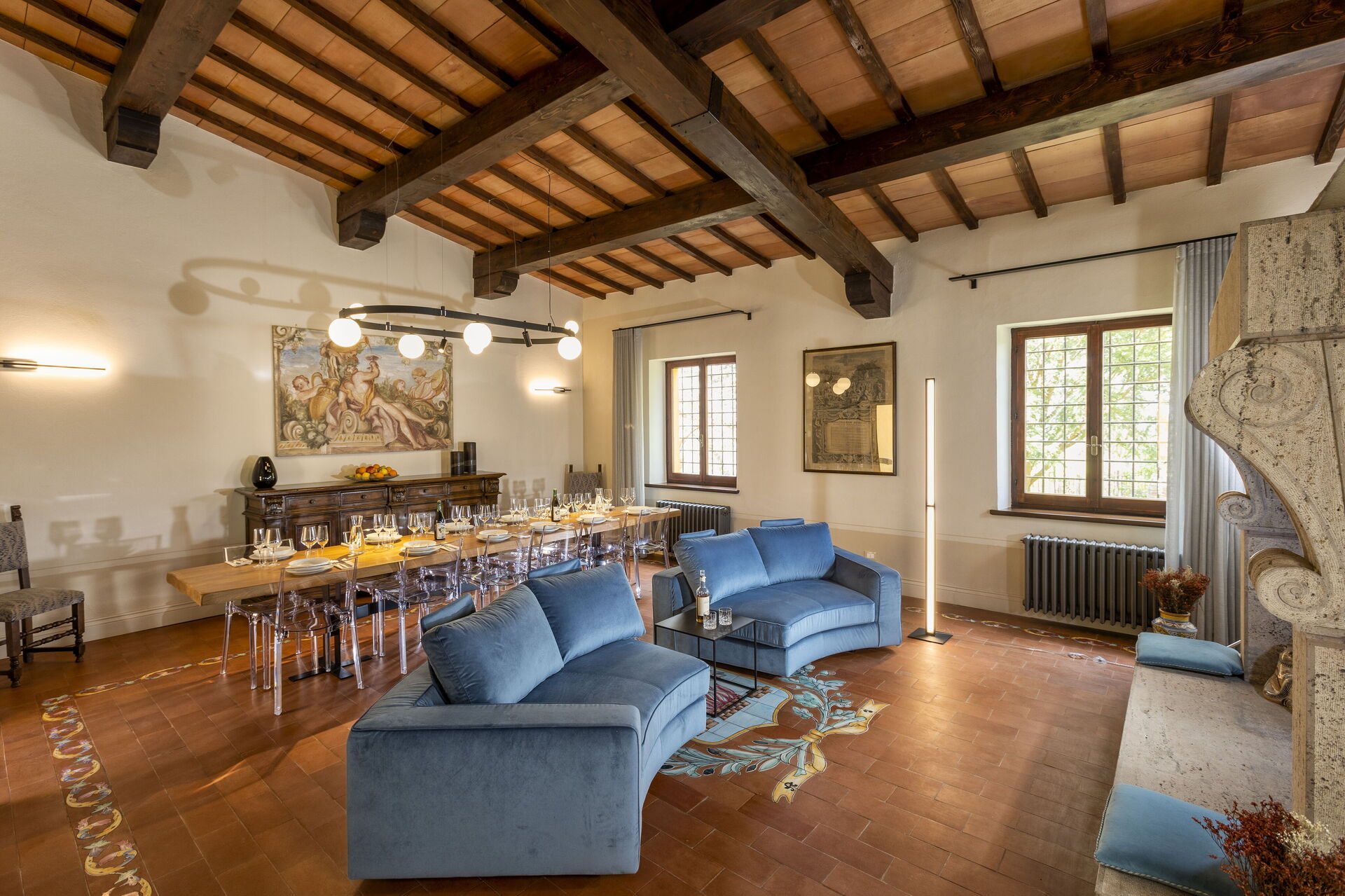 Soggiorno 2: due divani, caminetto, tavolo da pranzo (persone: 16), internet WIFI, uscita sul patio.