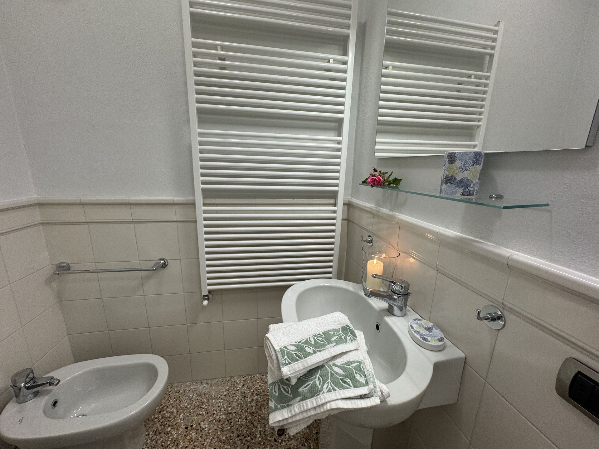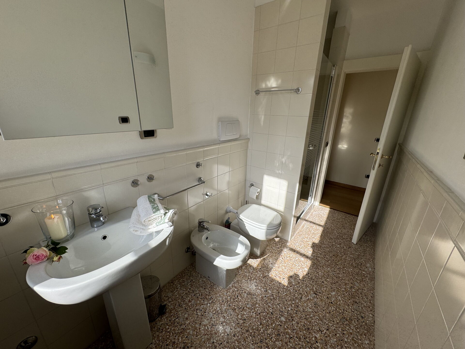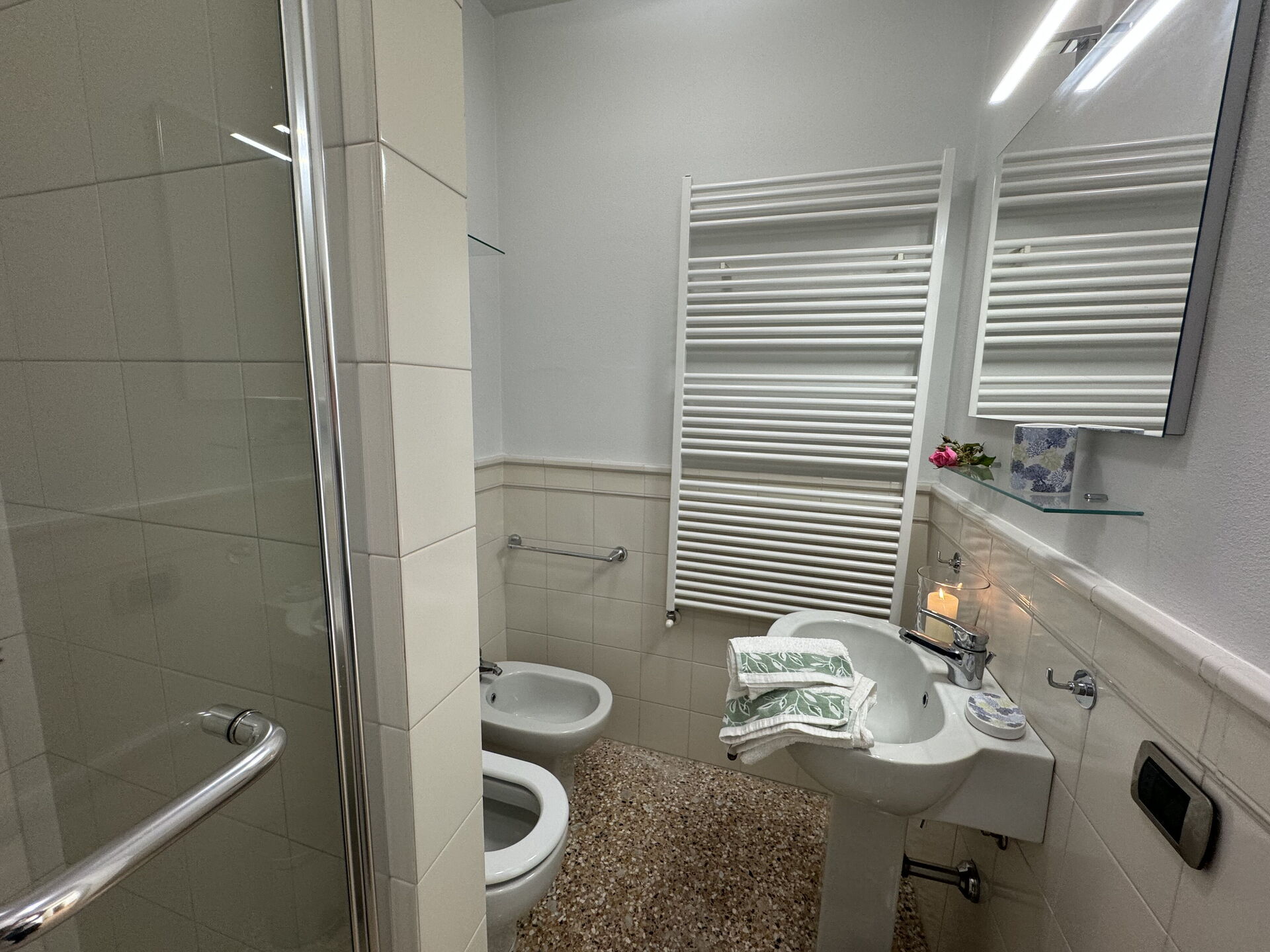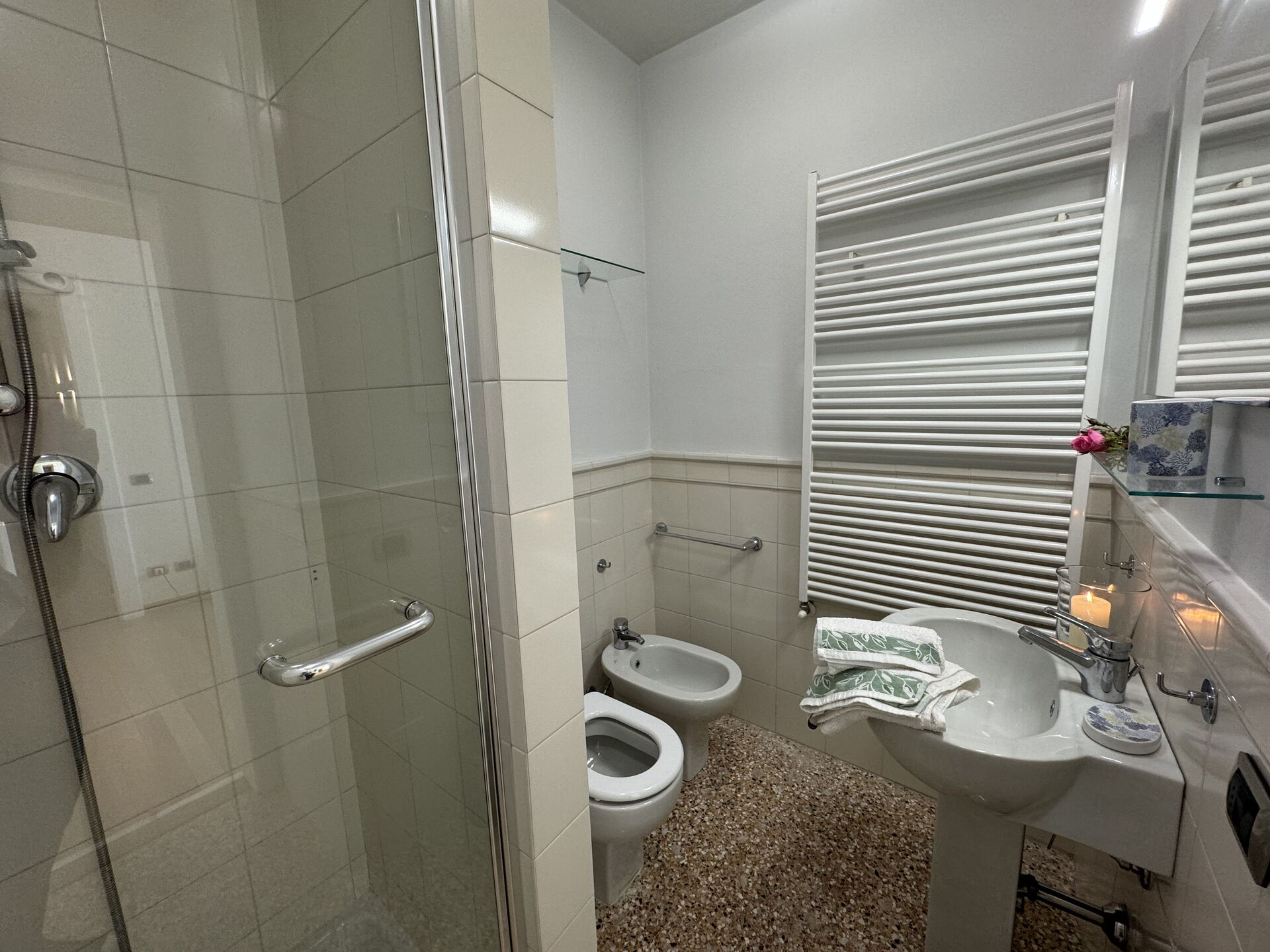 Camera da letto con bagno: letto matrimoniale, lavandino, wc, bidet, doccia.