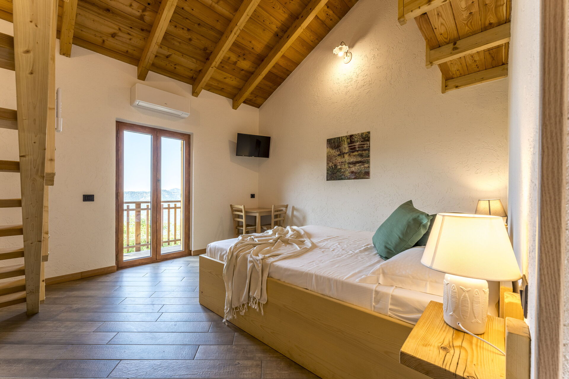Camera da letto con bagno 3: letto matrimoniale, due letti singoli, internet WIFI, aria condizionata, televisione, lavandino, wc, bidet, doccia, asciugacapelli, uscita sul balcone, soppalco.