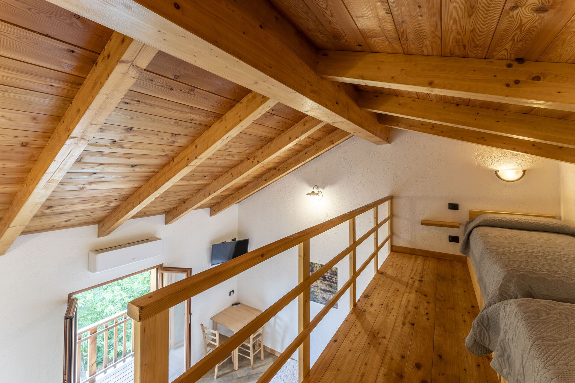 Camera da letto con bagno 4: letto matrimoniale, due letti singoli, internet WIFI, aria condizionata, televisione, lavandino, wc, bidet, doccia, asciugacapelli, uscita sul balcone, soppalco.