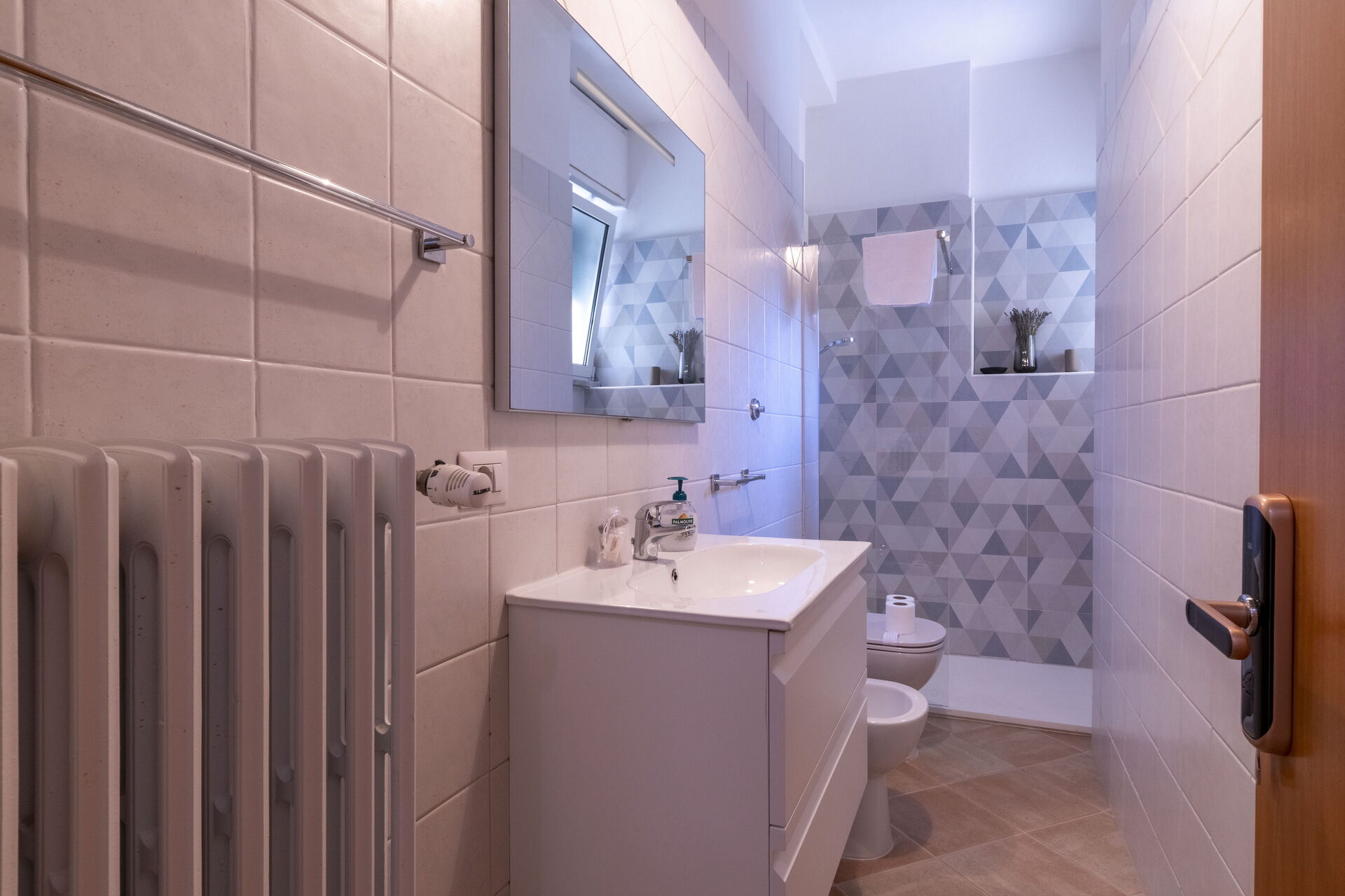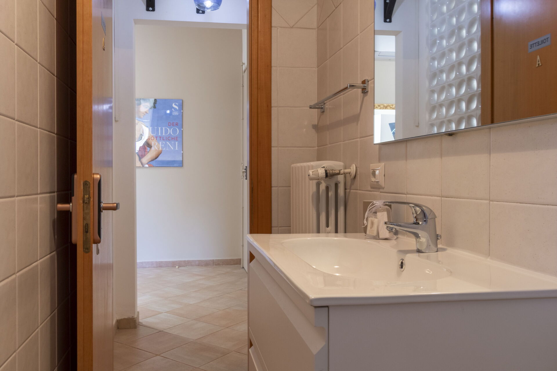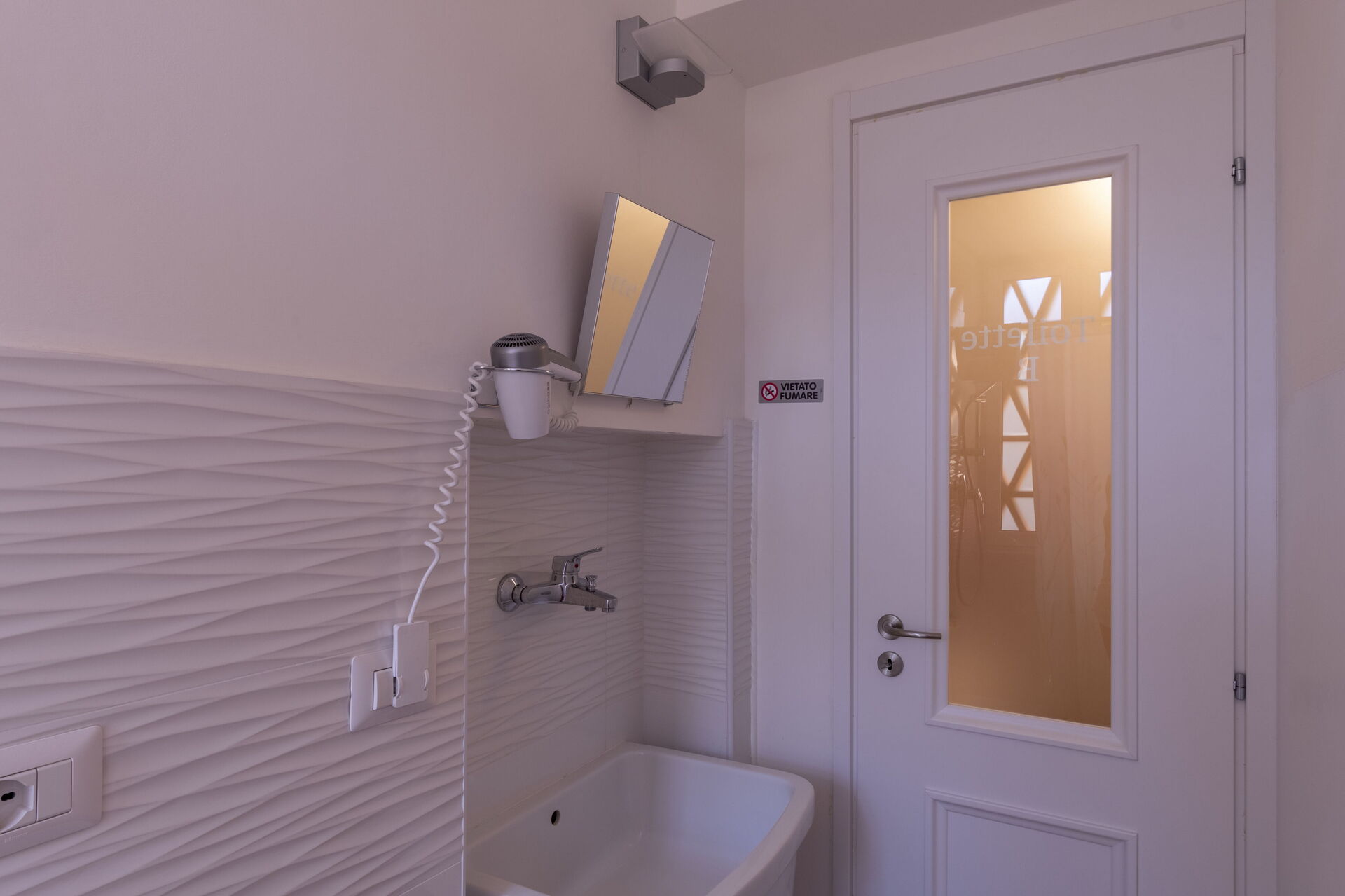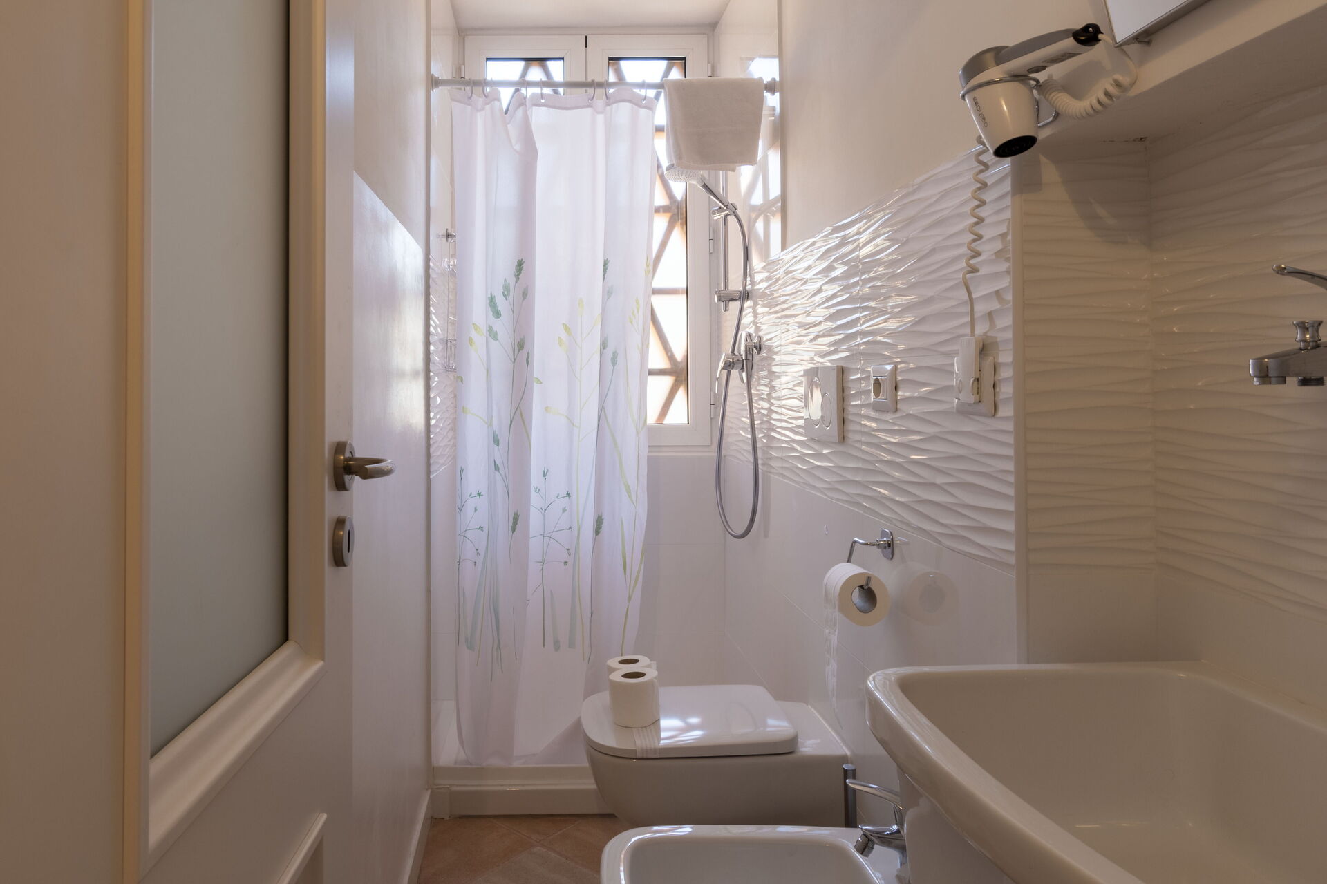Bagno 1: lavandino, wc, doccia, asciugacapelli.