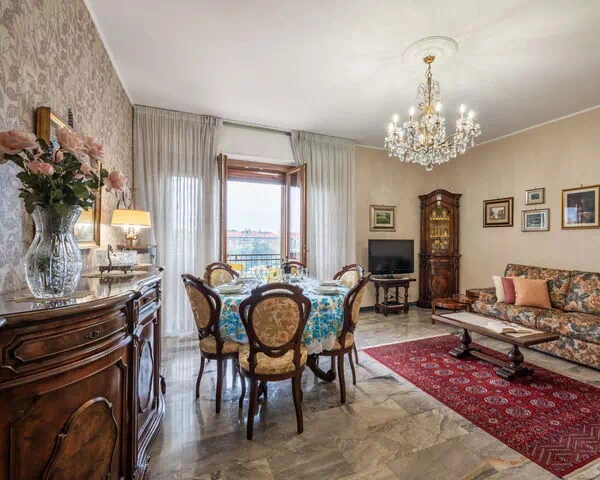 L'appartamento si estende su 135 metri quadri, situato al quinto piano, e accoglie fino a 6 ospiti distribuiti in 3 camere da letto e 2 bagni. L'ingresso ampio introduce a uno spazio luminoso e confortevole. Il soggiorno e la sala da pranzo, di generose dimensioni, sono dotati di tavolo da pranzo e televisore, e si aprono su un balcone con vista panoramica sul giardino e sulla città. L'appartamento comprende 2 camere da letto matrimoniali, una delle quali equipaggiata con televisore, e una terza camera da letto con 2 letti singoli e una radio. La cucina è ampiamente fornita, include un tavolo da pranzo e un televisore, con accesso diretto a un secondo balcone. Entrambi i balconi, uno orientato a est e l'altro a ovest, sono arredati per l'uso esterno. Il primo bagno è dotato di vasca, bidet e WC; il secondo bagno è equipaggiato con doccia e WC. I pavimenti alternano parquet caldo e pietra naturale elegante in tutti gli ambienti.