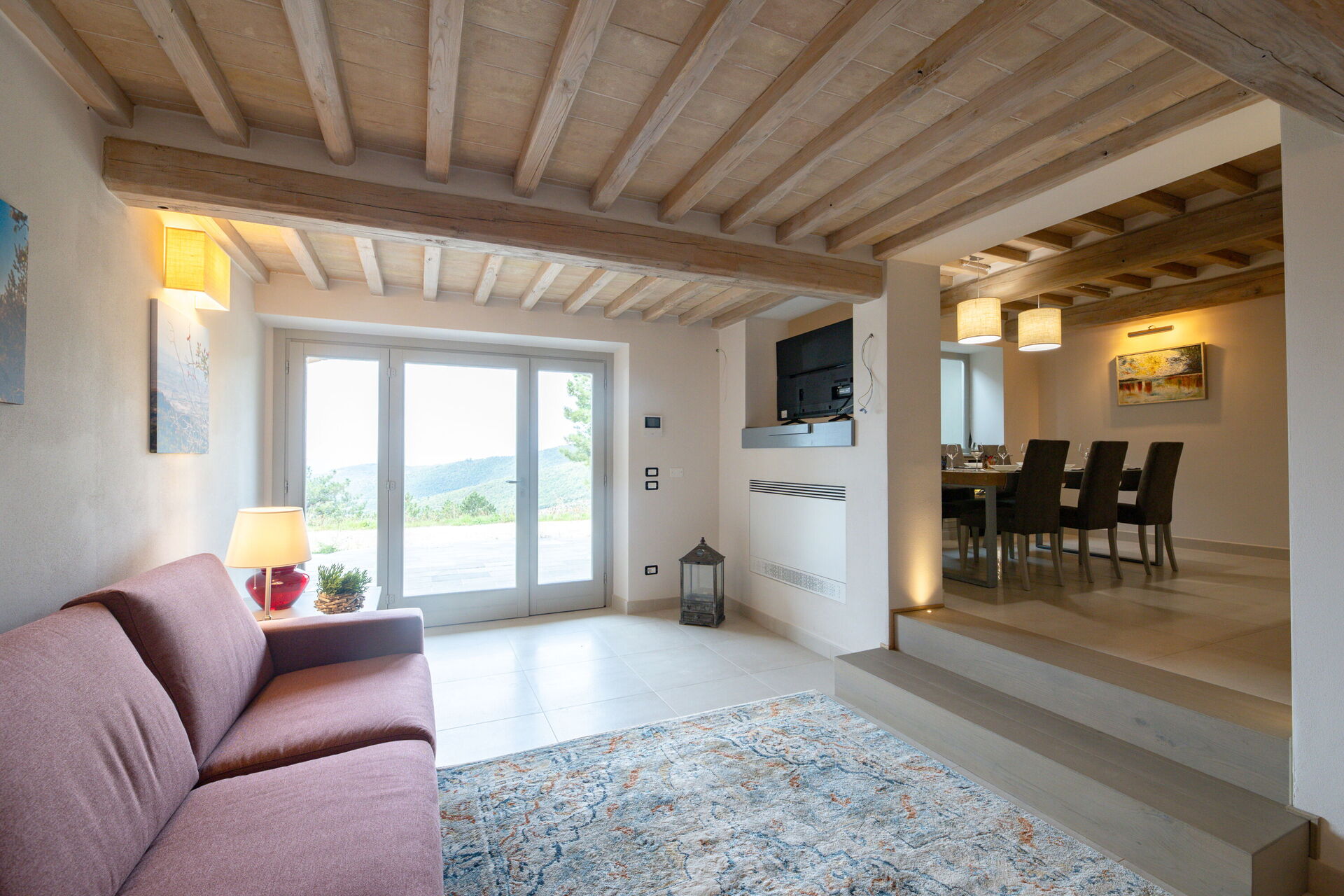 Soggiorno: divano letto matrimoniale, internet WIFI, aria condizionata, zanzariere, uscita sul giardino, uscita sulla veranda.