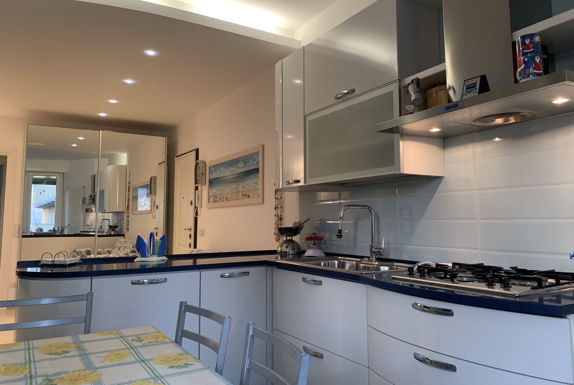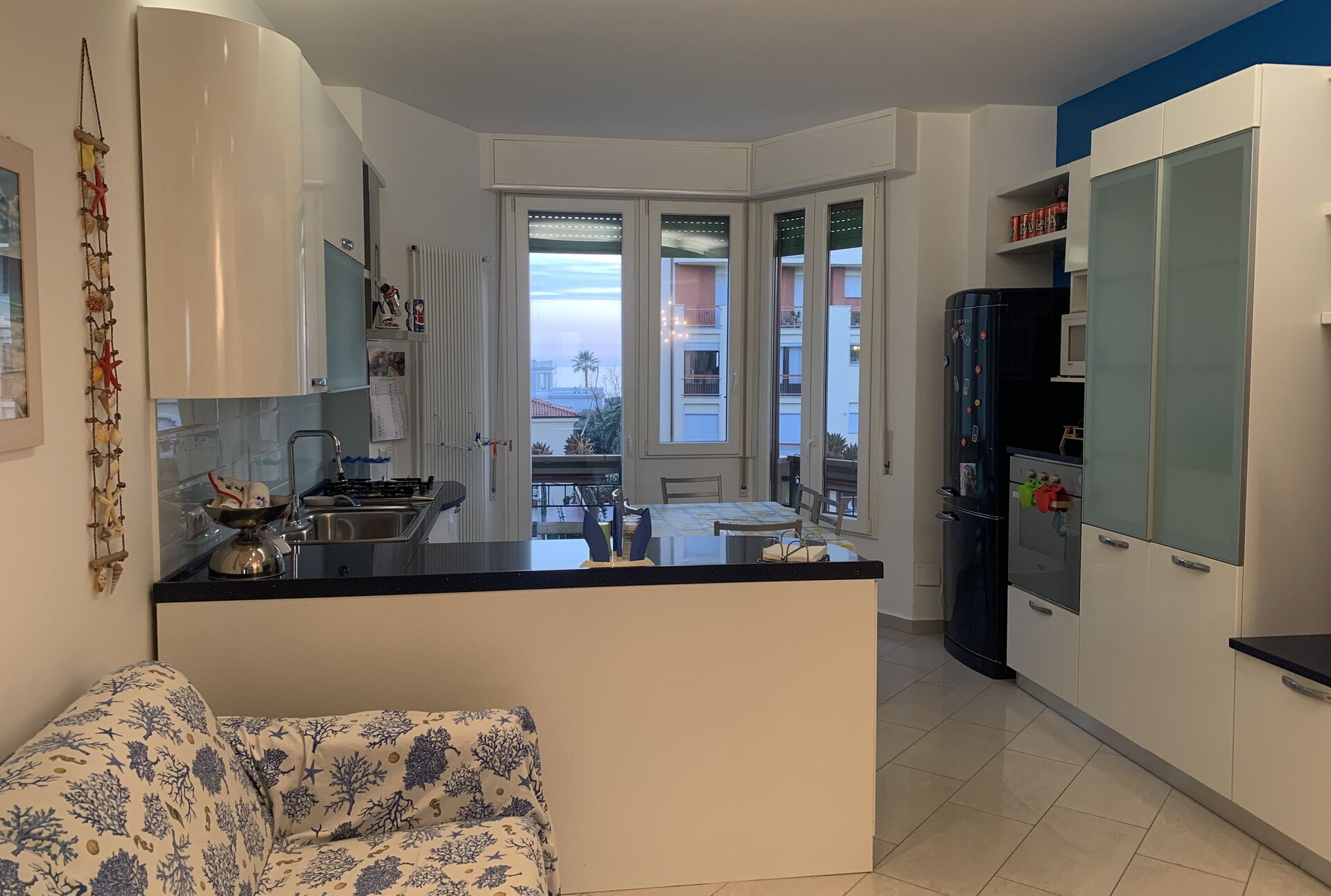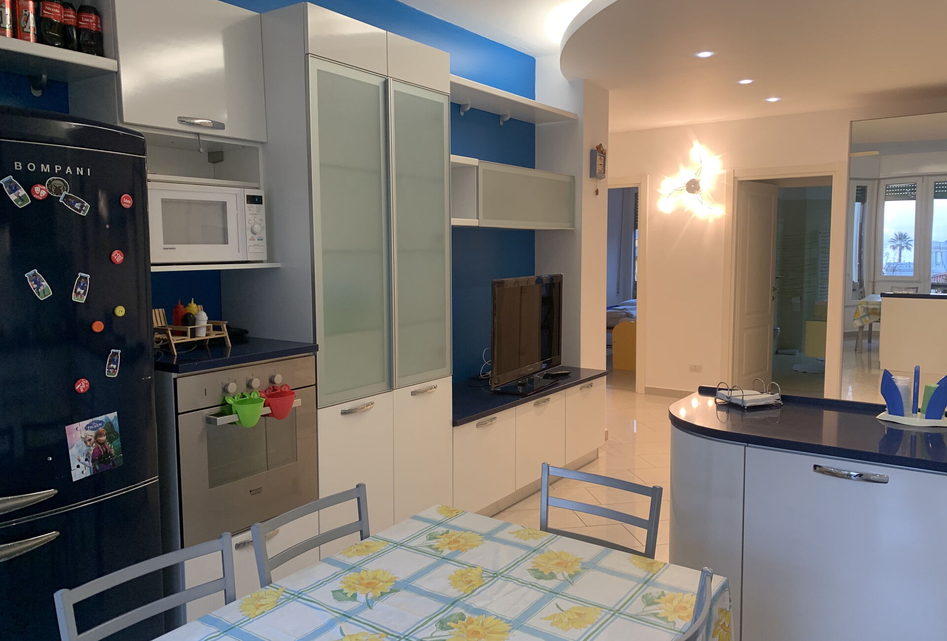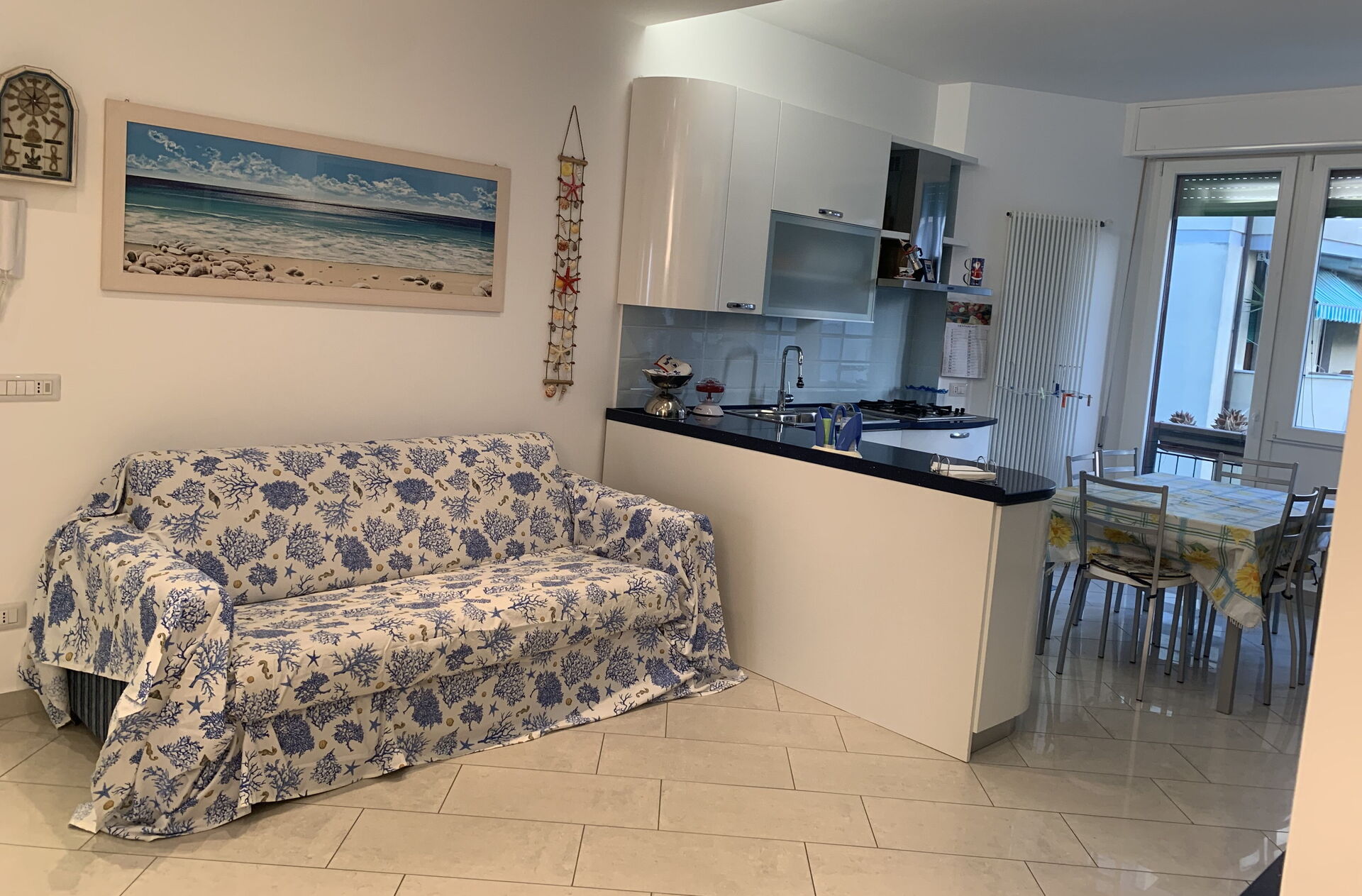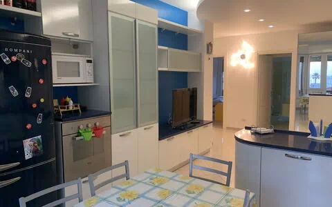 Cucina - soggiorno: cucina ben attrezzata, tavolo da pranzo, lavastoviglie, frigo, freezer, microonde, quattro piani cottura, forno, macchina da caffè (italiana), divano, internet WIFI, televisione.