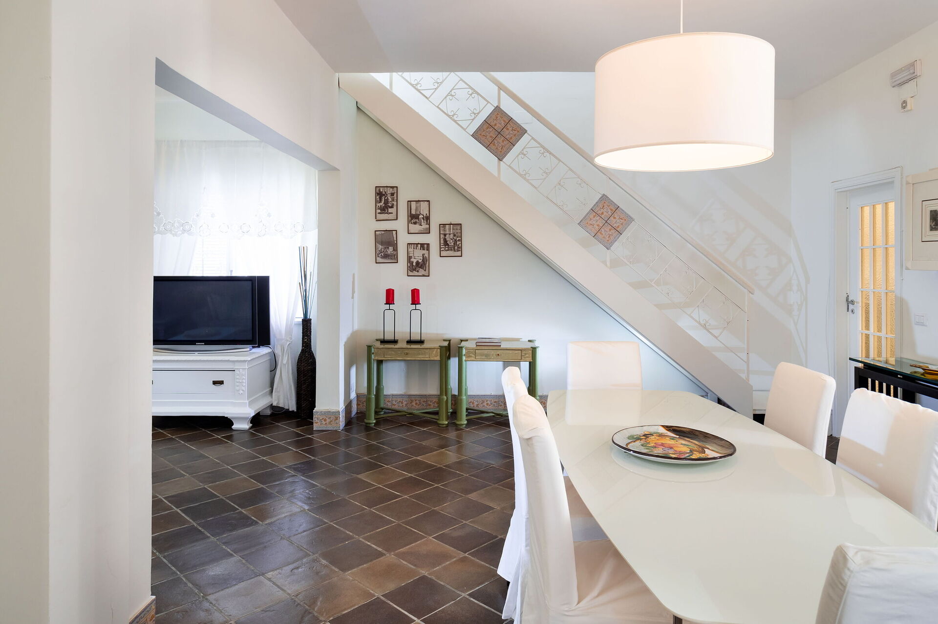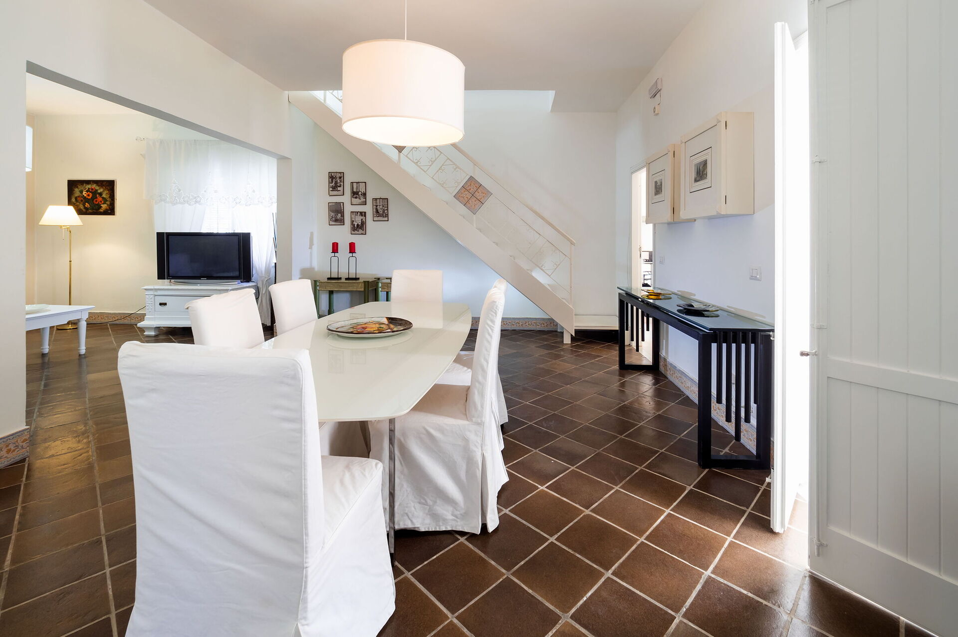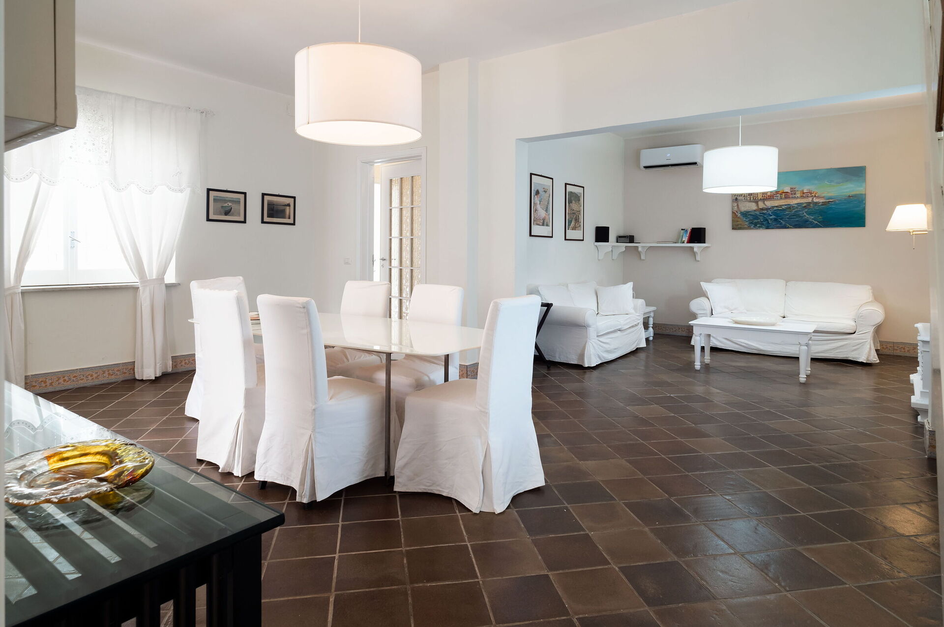 Cucina - soggiorno: cucina ben attrezzata, tavolo da pranzo, lavastoviglie, frigo, freezer, microonde, forno, tostapane, macchina da caffè americano, divano, internet WIFI, aria condizionata, seggiolone, tv satellitare, rilevatore di fumo, uscita sulla terrazza.