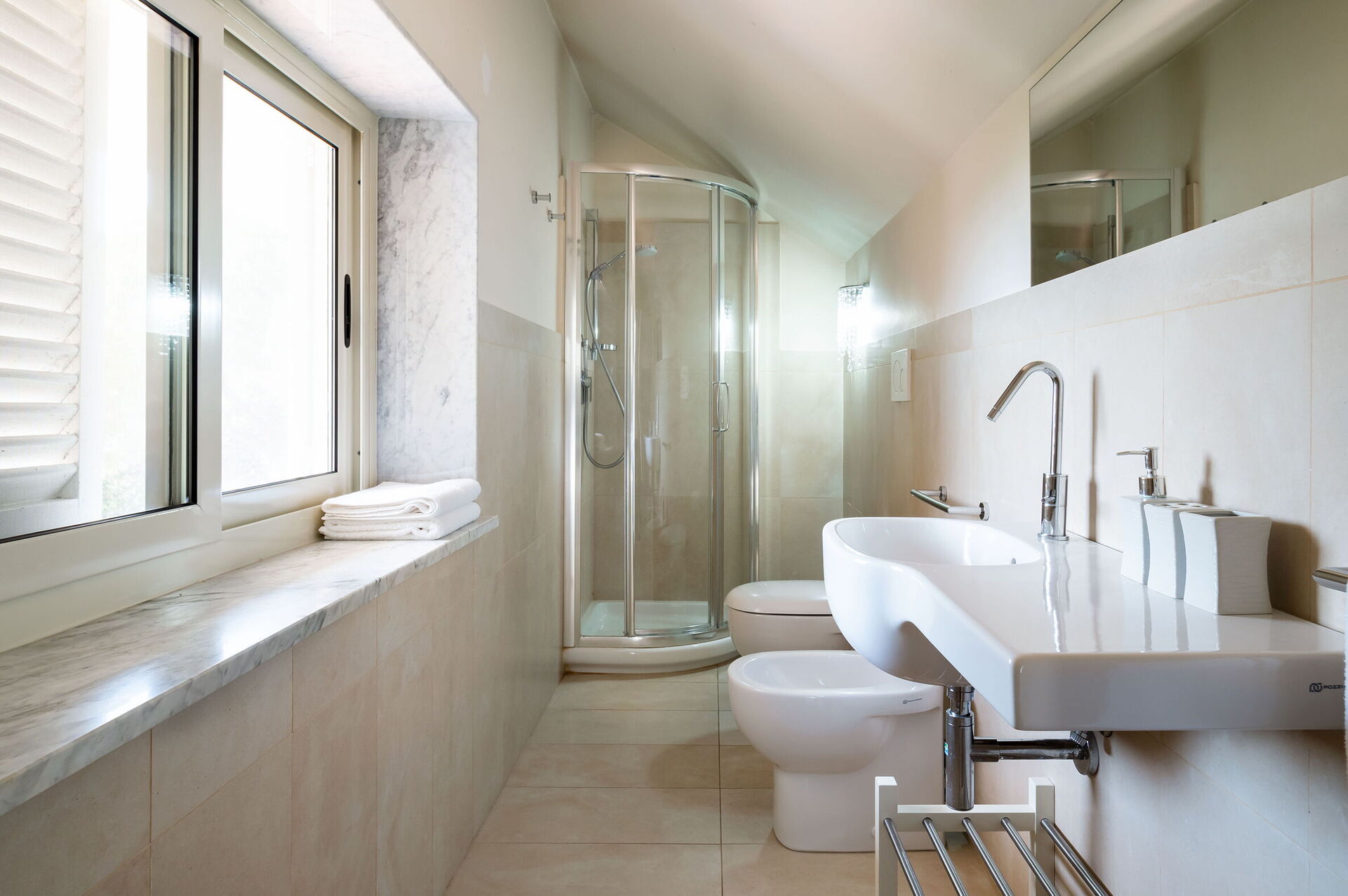 Camera da letto con bagno 1: letto matrimoniale, internet WIFI, internet, zanzariere, poltrona, lavandino, wc, bidet, doccia, uscita sulla terrazza.