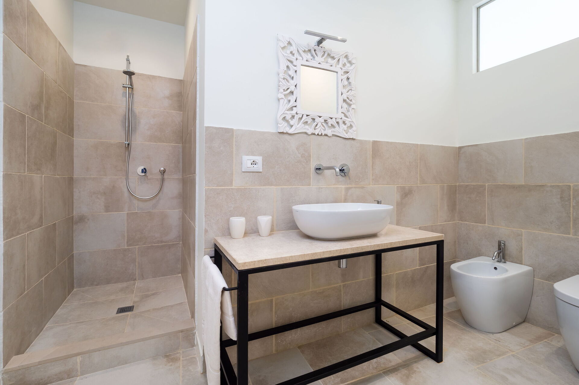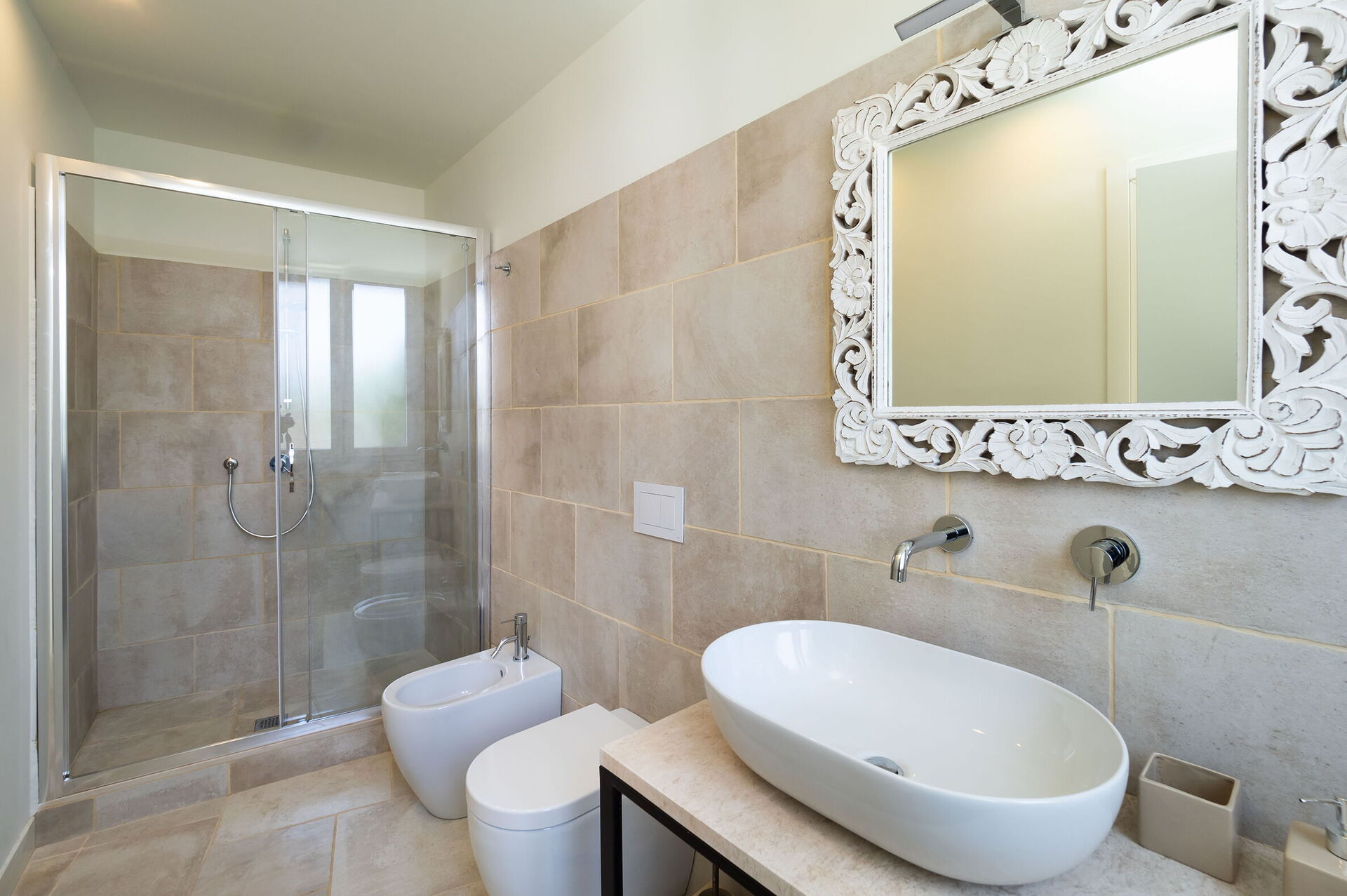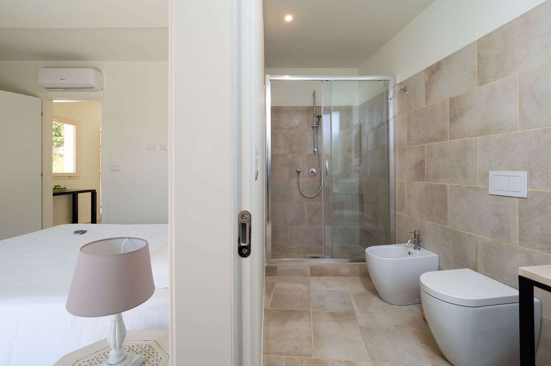 Camera da letto con bagno 2: letto matrimoniale, internet WIFI, internet, aria condizionata, poltrona, lavandino, wc, bidet, doccia, uscita sul patio.