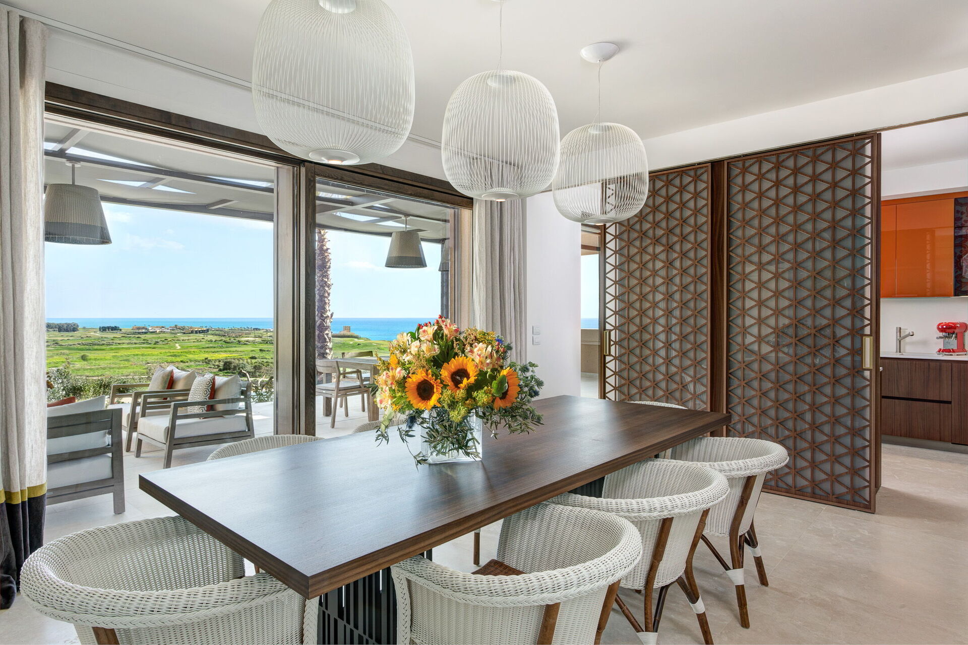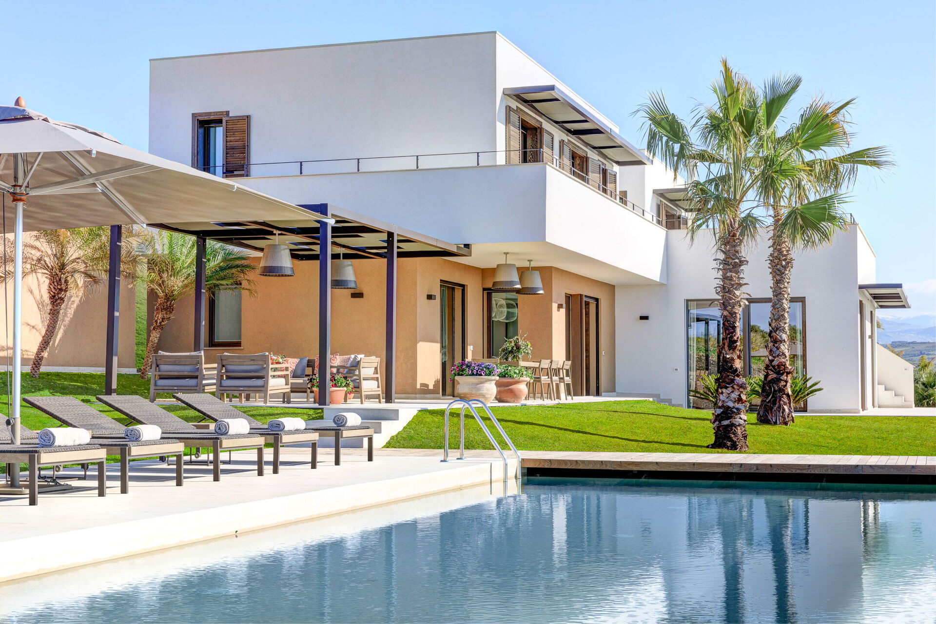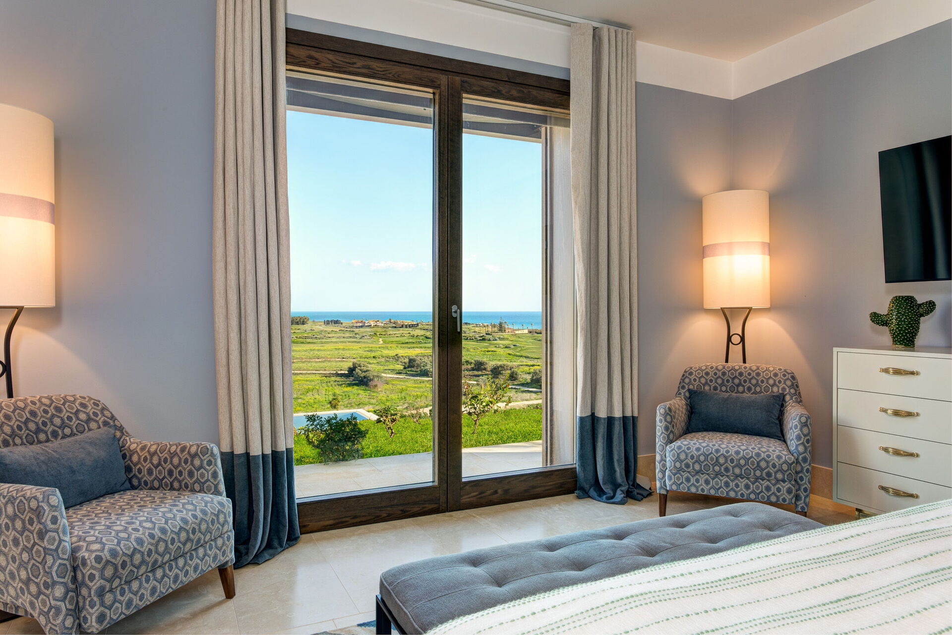 Con tre camere da letto con bagno privato al primo piano e la quarta camera da letto situata in una dependance esterna, ogni camera è dotata di un letto king-size e di una terrazza privata che offre splendide viste sui verdeggianti campi da golf e sul Mar Mediterraneo. Svegliati con la dolce carezza del sole siciliano e goditi il tuo caffè mattutino mentre ammiri uno scenario mozzafiato.