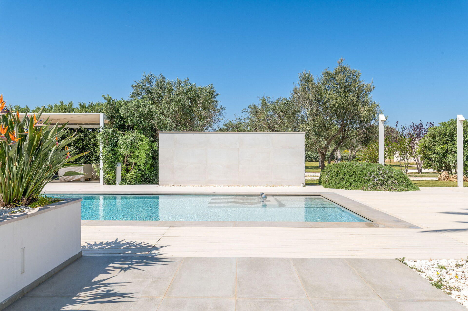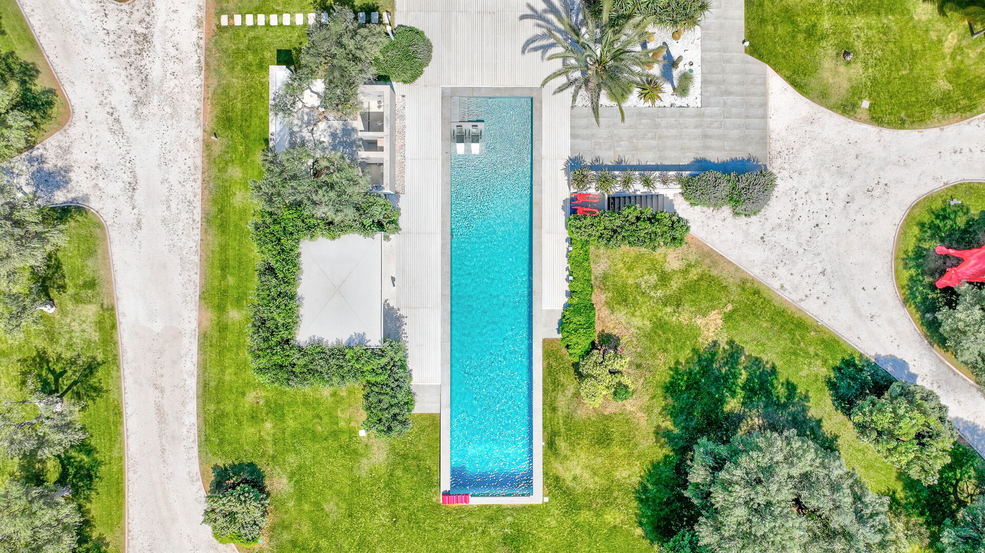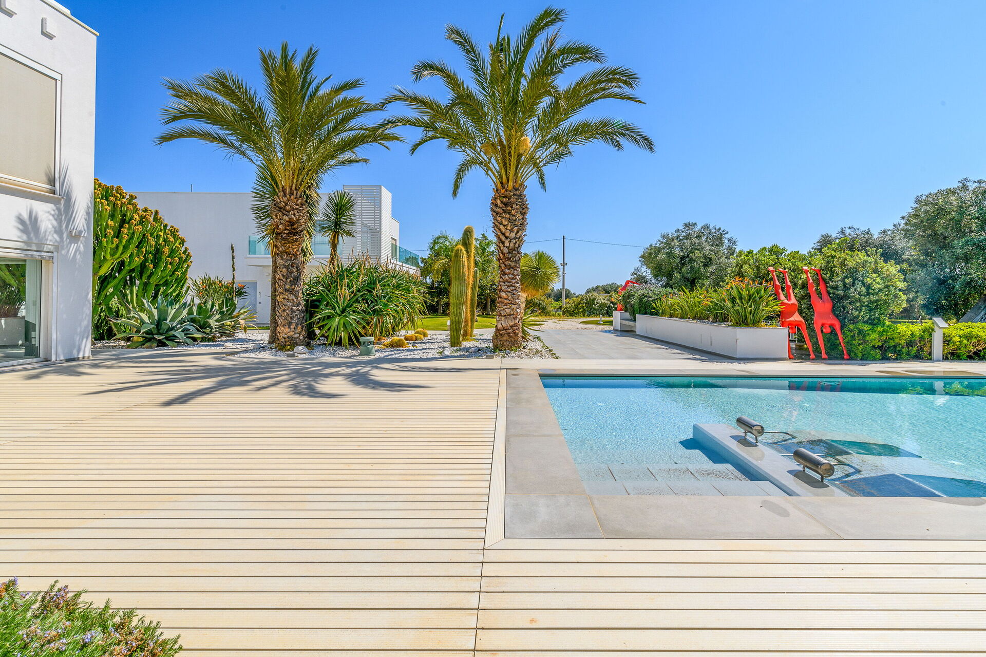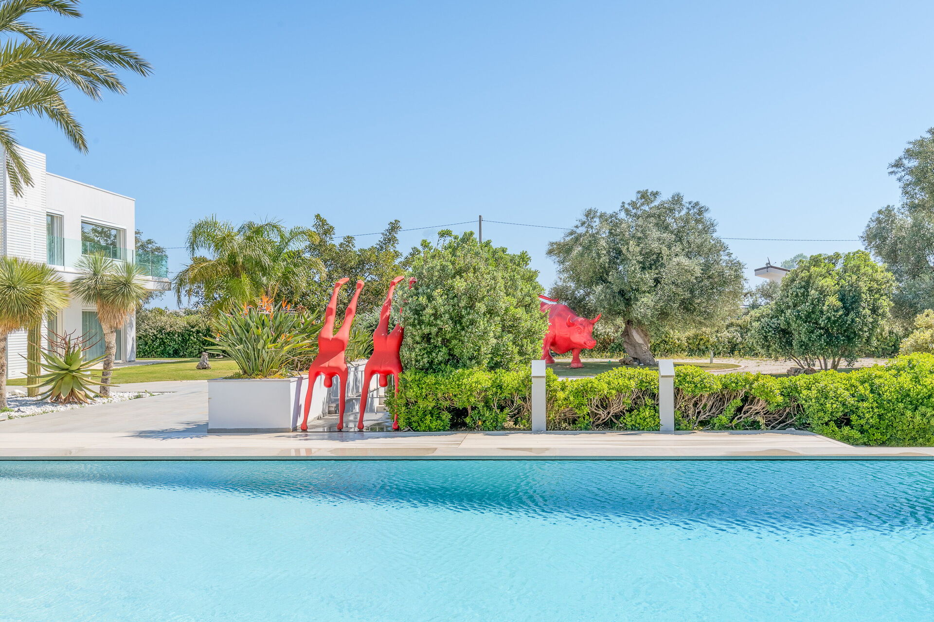 Il vasto giardino privato, esteso su 10.000 mq, ospita una piscina a sfioro di 28 mq con pareti in cristallo, un autentico gioiello che sfida la legge di gravità. Completano l'atmosfera magica dell'ambiente un'area solarium e un gazebo, perfetti per rilassarsi e godersi il panorama