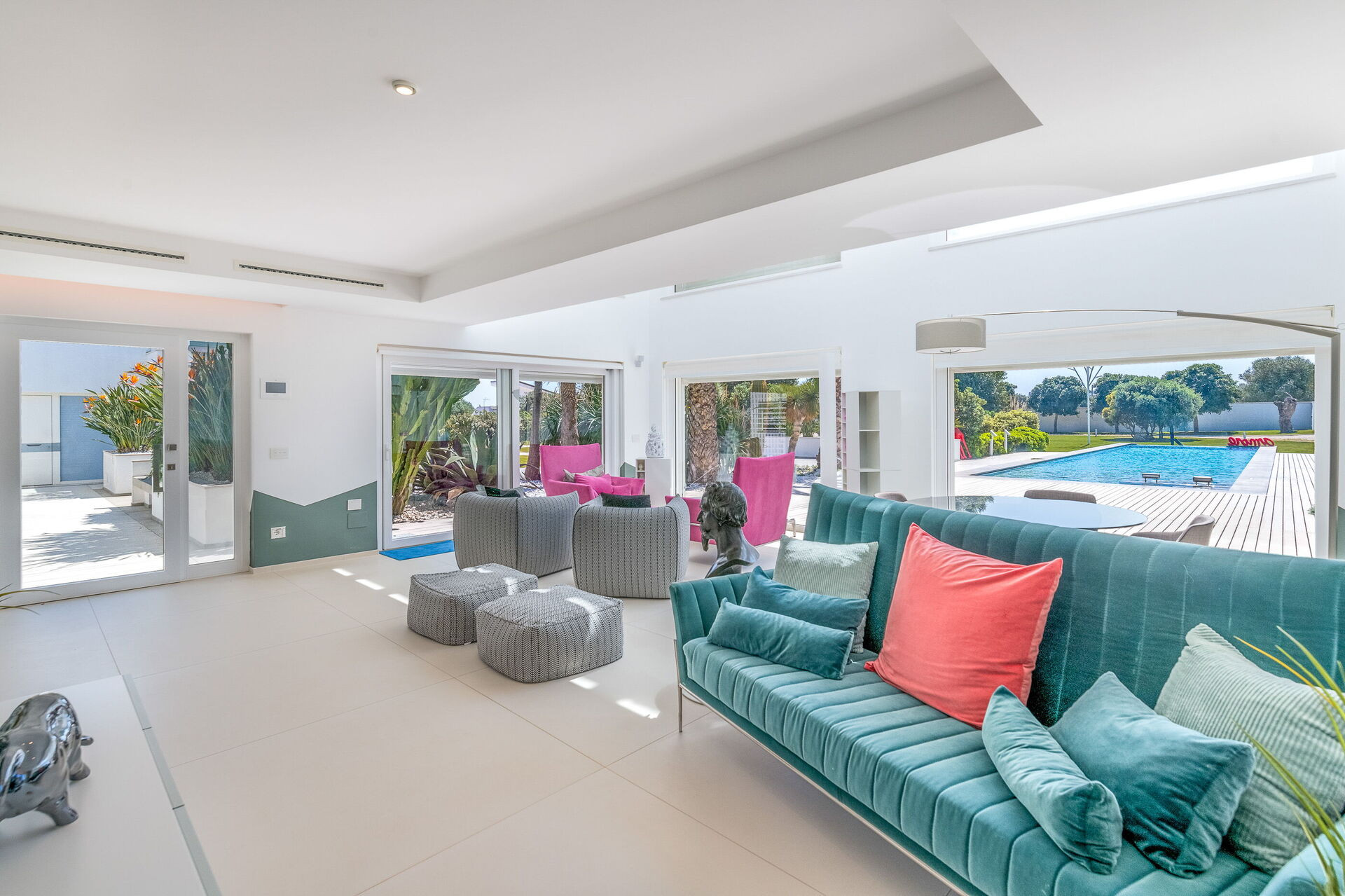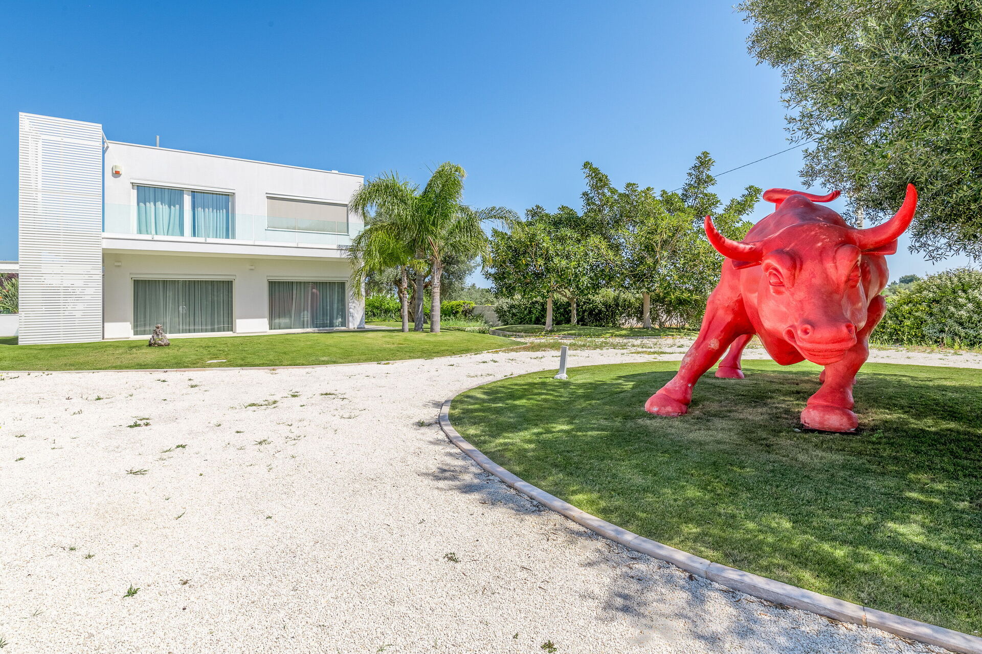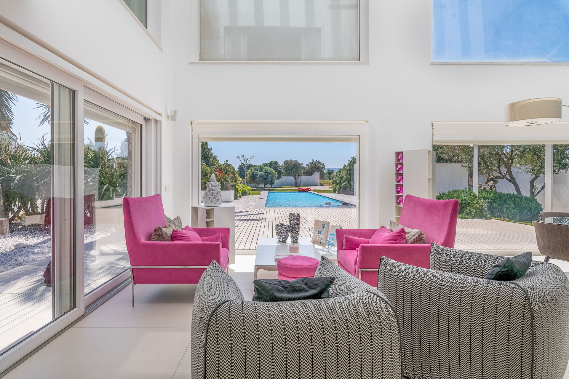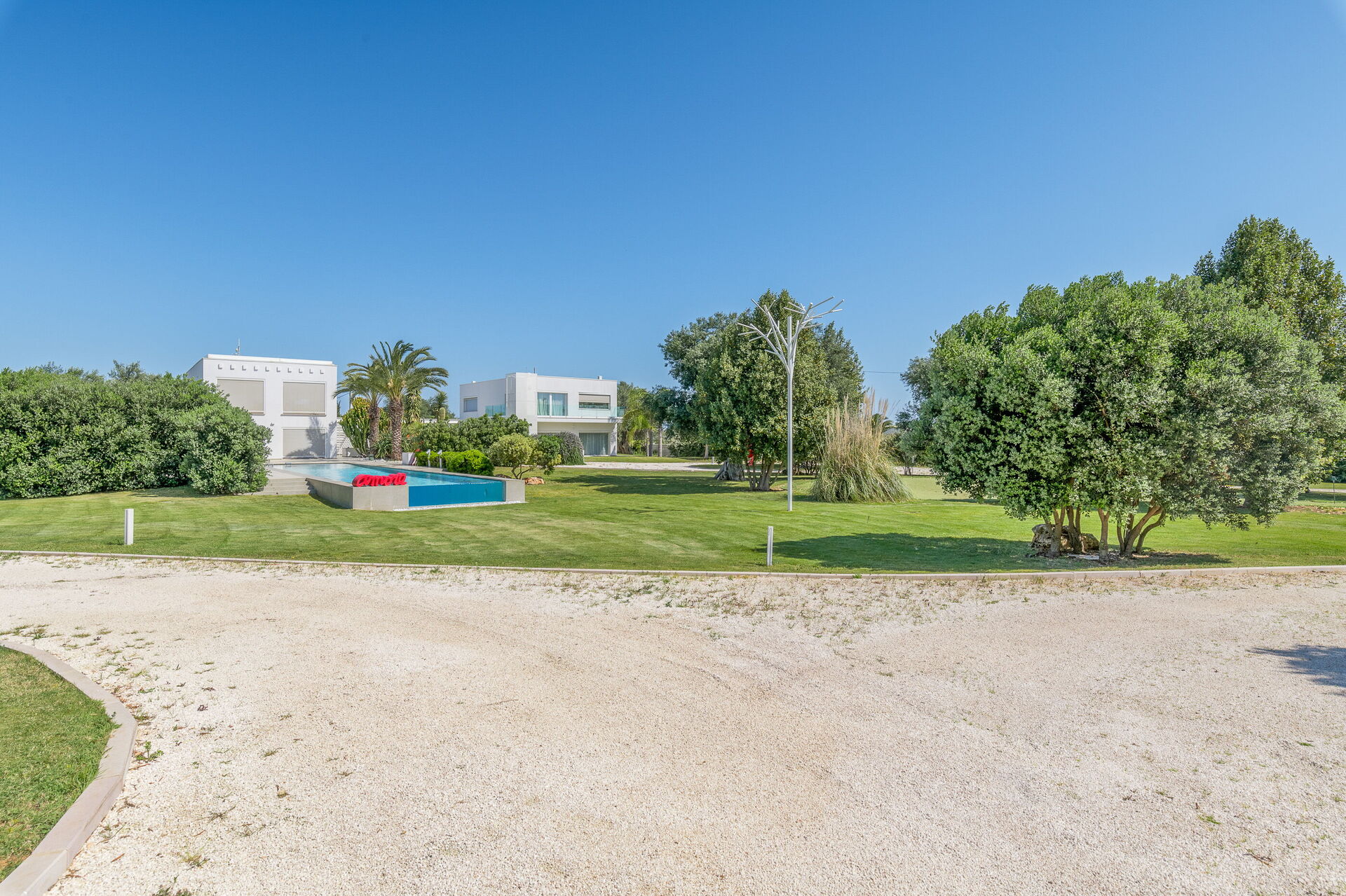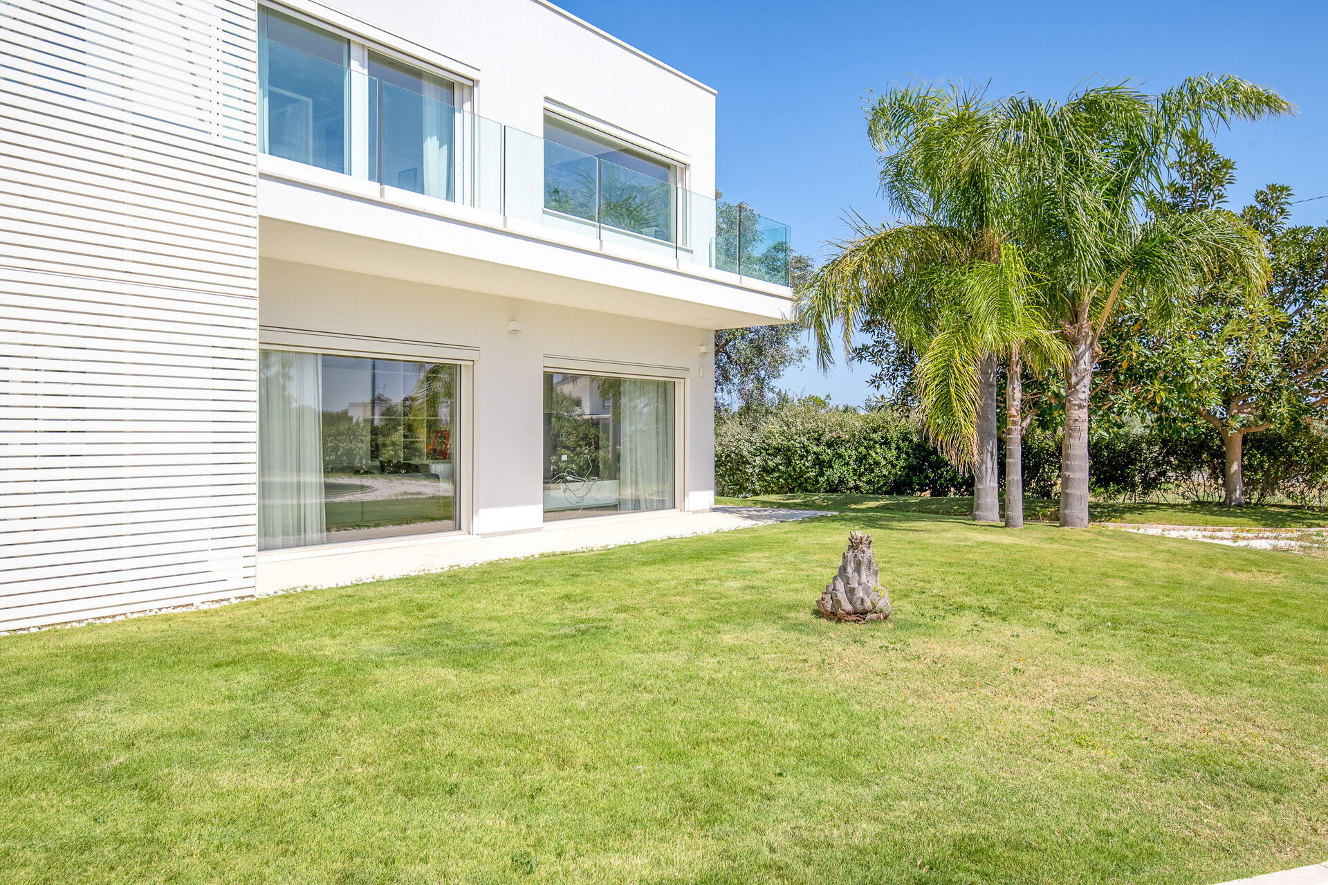 Il vasto giardino privato, esteso su 10.000 mq, ospita una piscina a sfioro di 28 mq con pareti in cristallo, un autentico gioiello che sfida la legge di gravità. Completano l'atmosfera magica dell'ambiente un'area solarium e un gazebo, perfetti per rilassarsi e godersi il panorama
