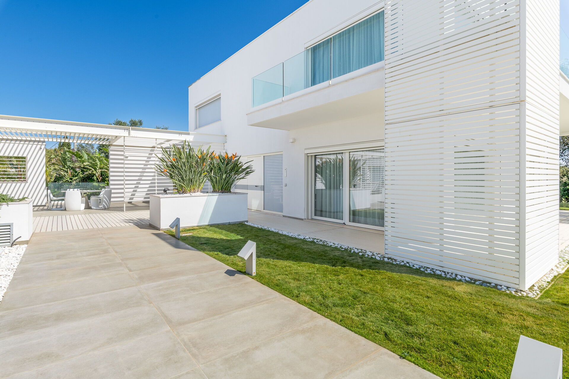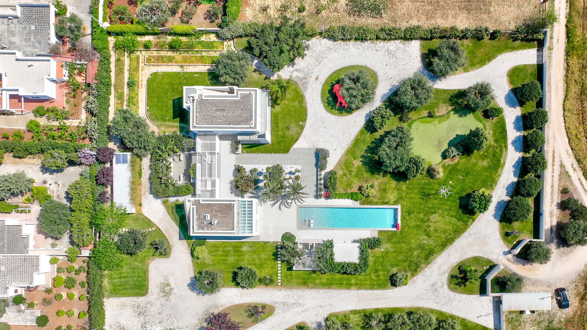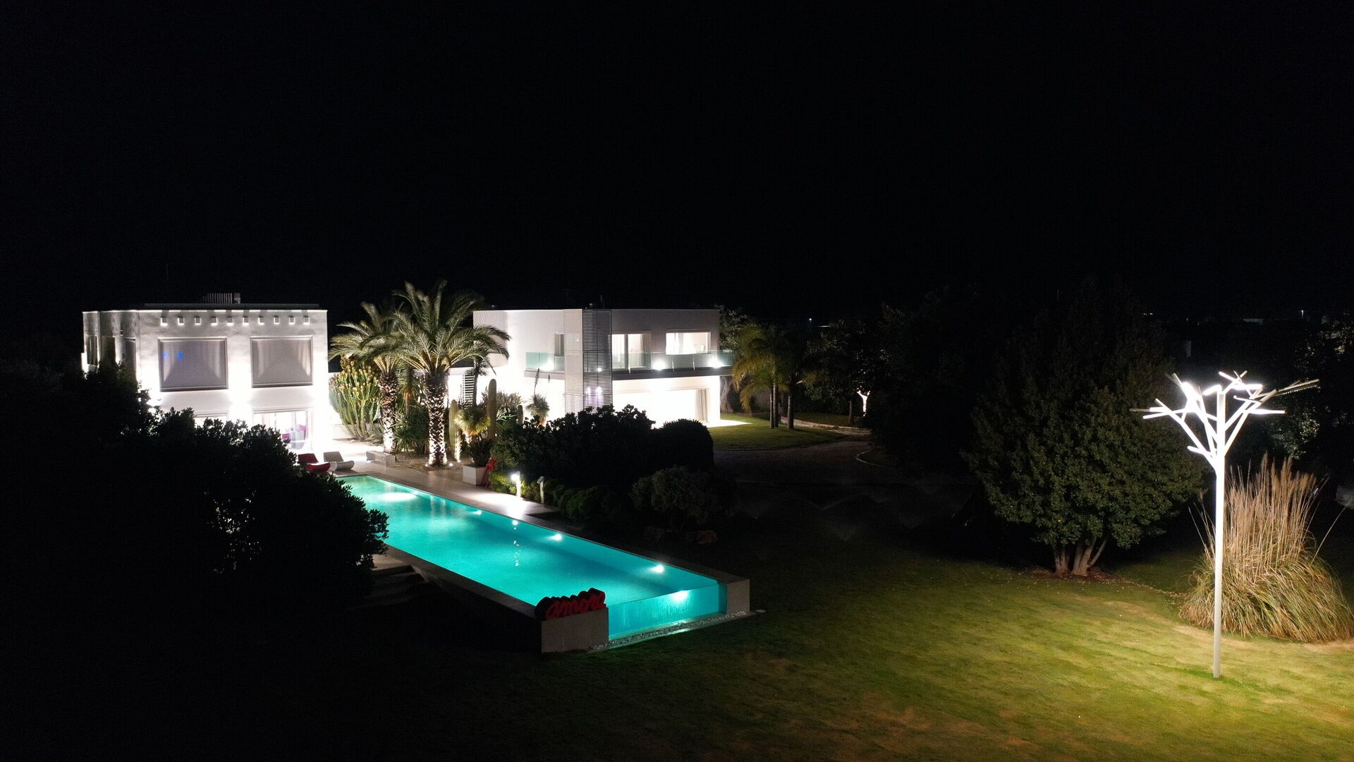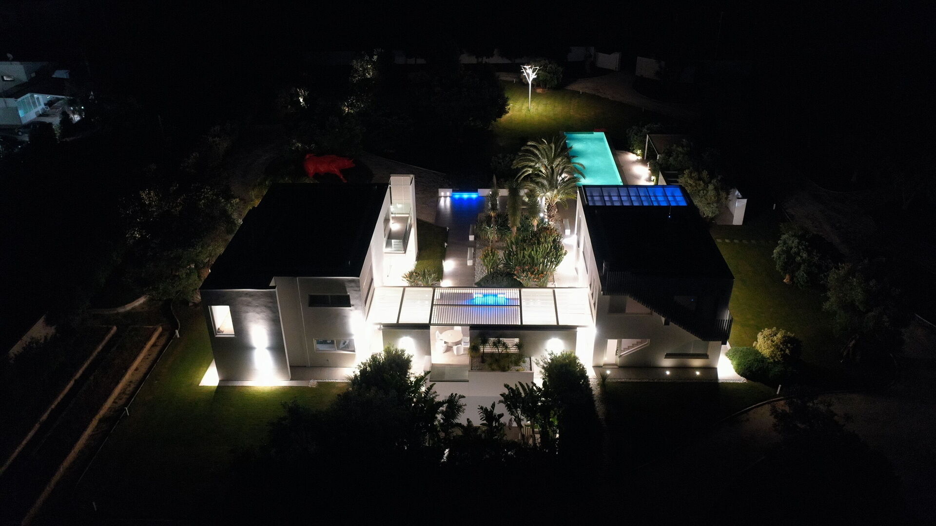 Con una superficie totale di 500 mq, la residenza è composta da due corpi distinti, con ampie vetrate che integrano armoniosamente gli spazi interni ed esterni.