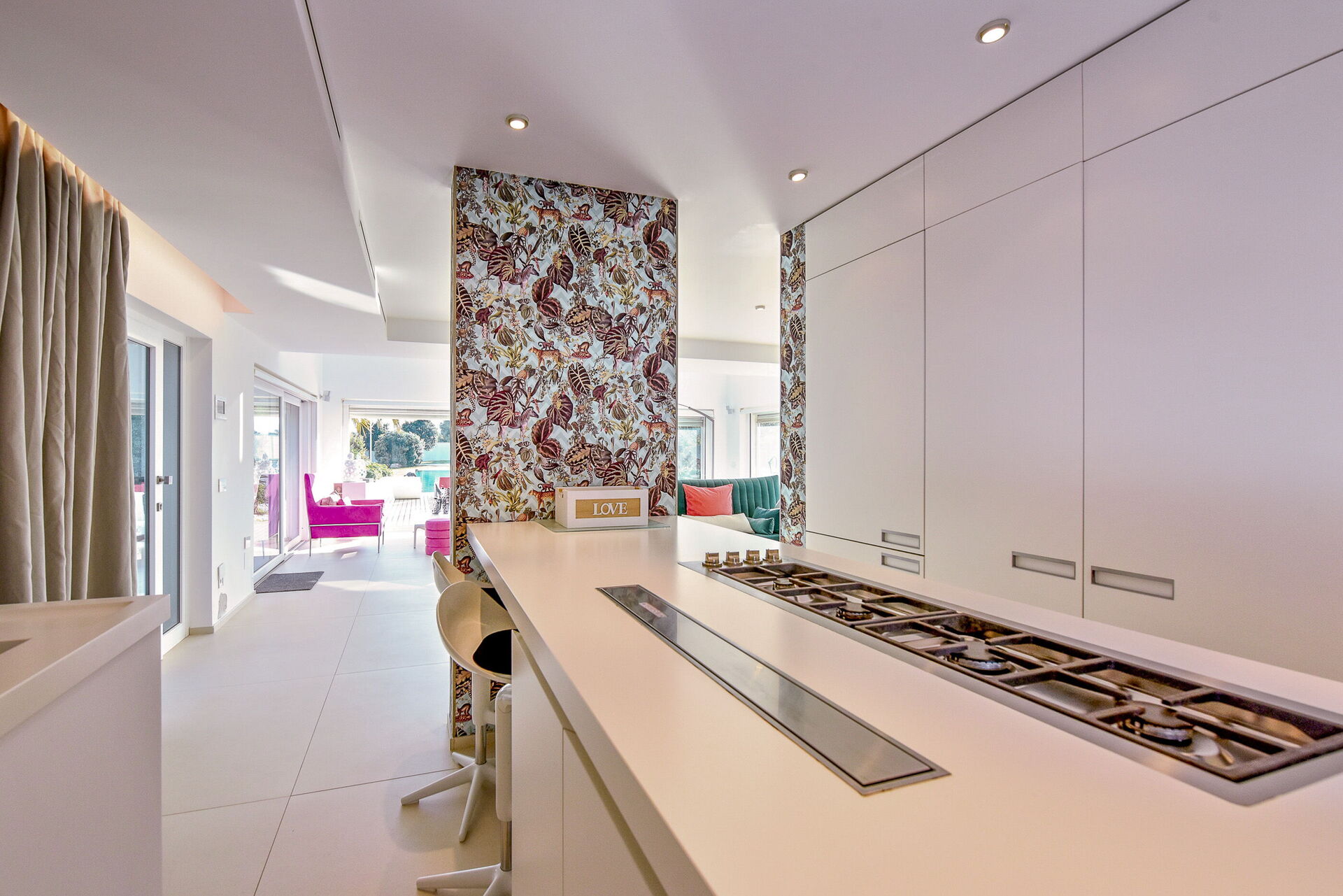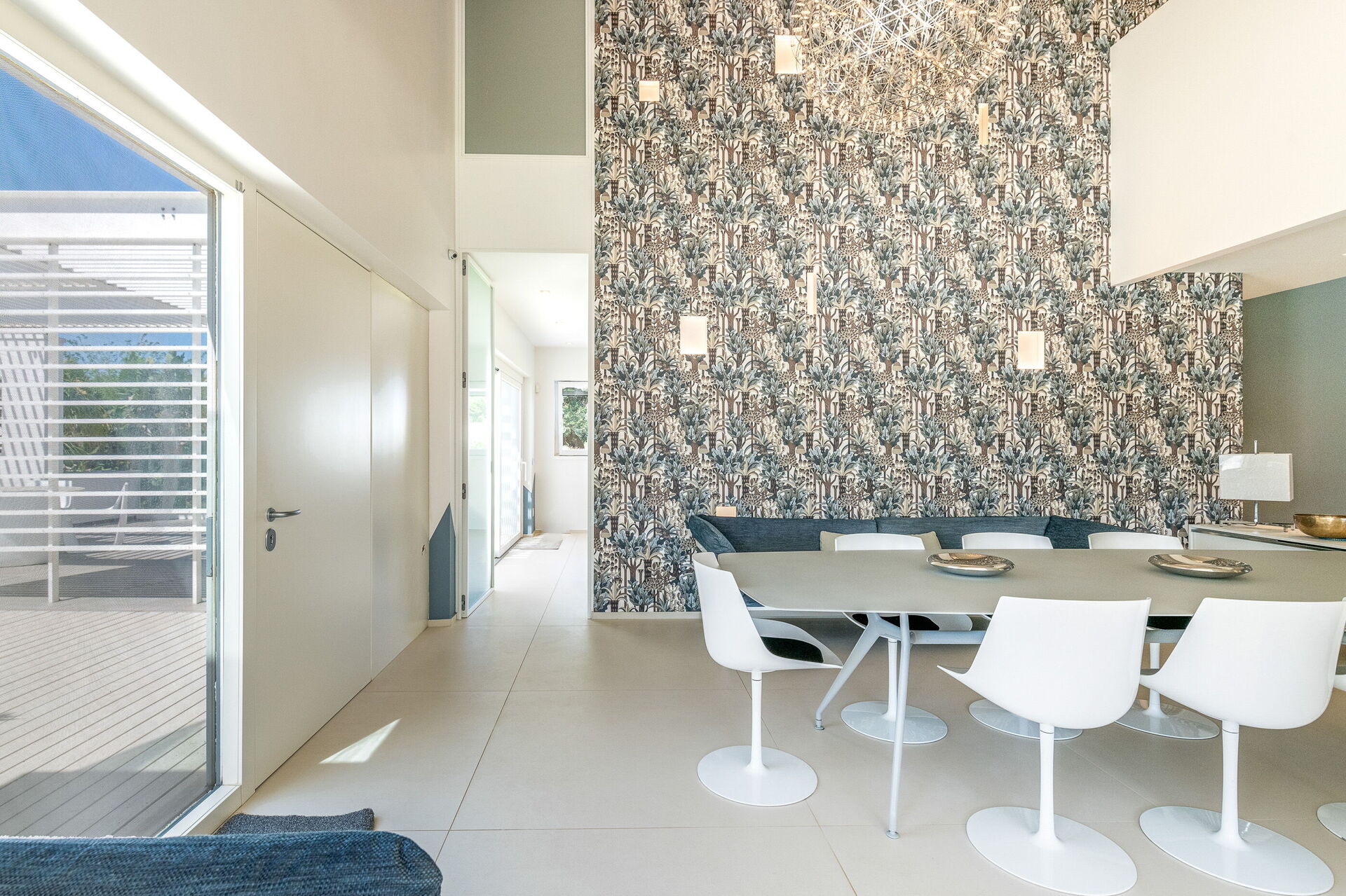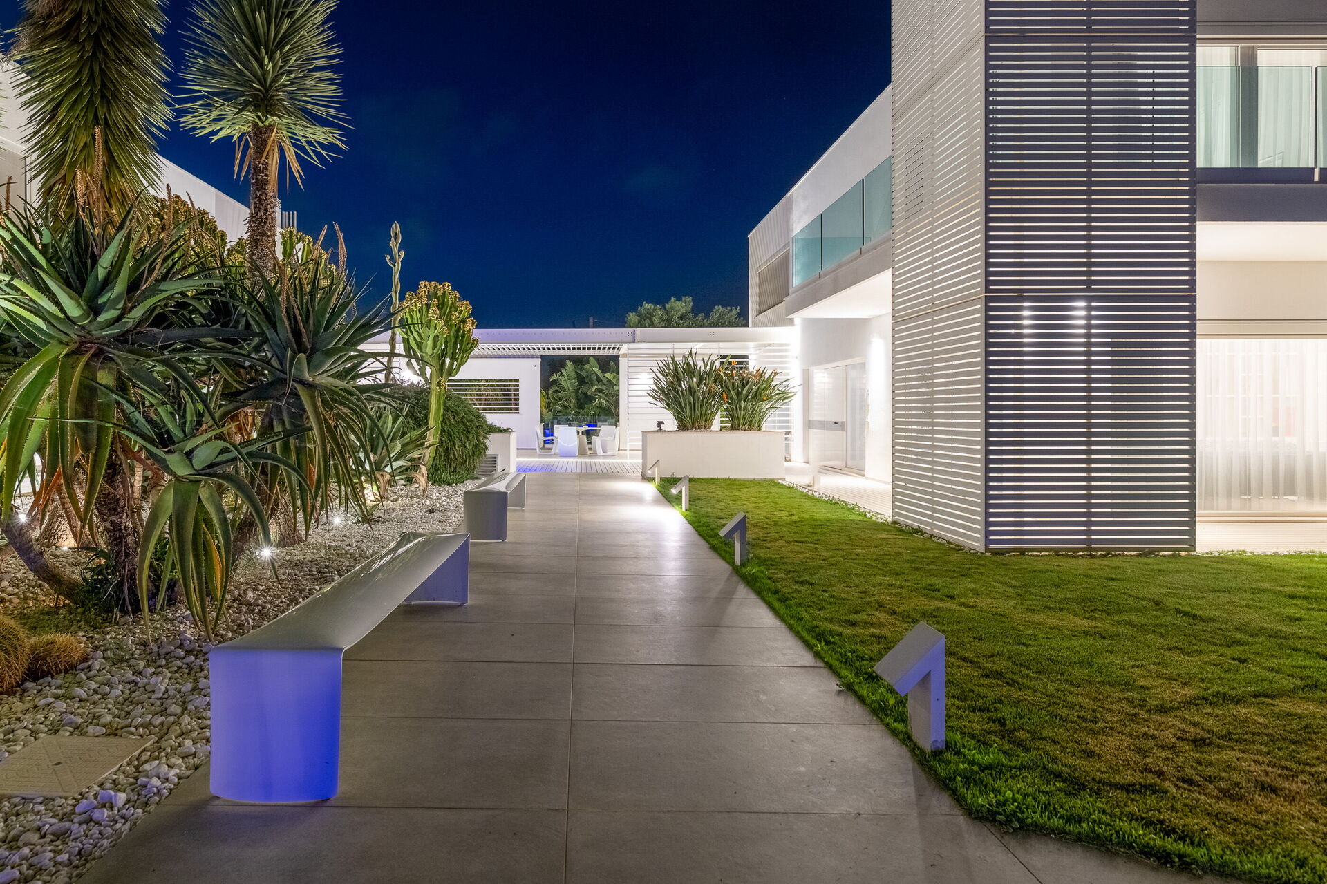 Con una superficie totale di 500 mq, la residenza è composta da due corpi distinti, con ampie vetrate che integrano armoniosamente gli spazi interni ed esterni.
