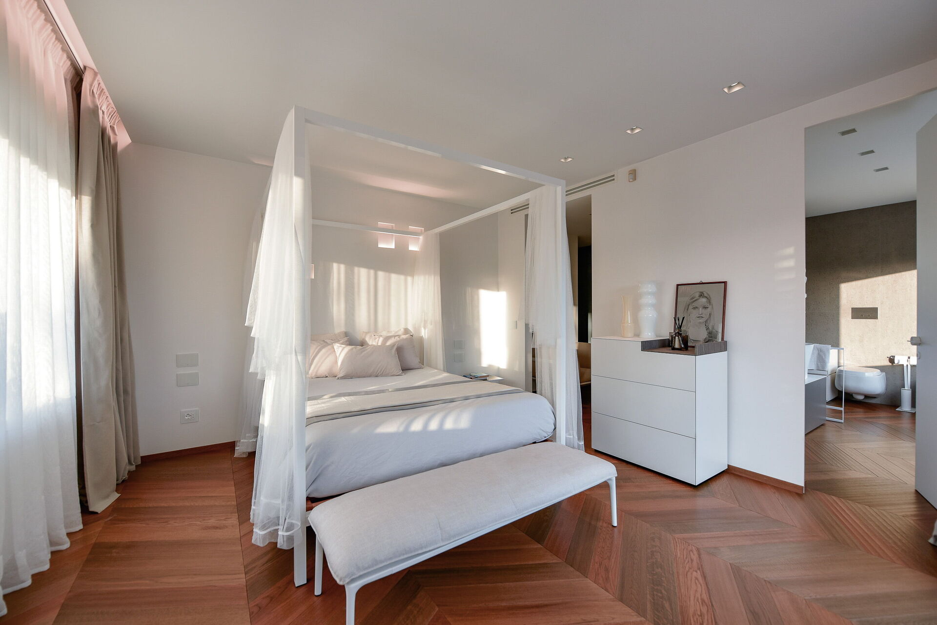 Camera da letto con bagno 1: aria condizionata, asciugacapelli, bidet, doccia, internet WIFI, lavandino, letto matrimoniale, tv satellitare, uscita sul balcone, wc.