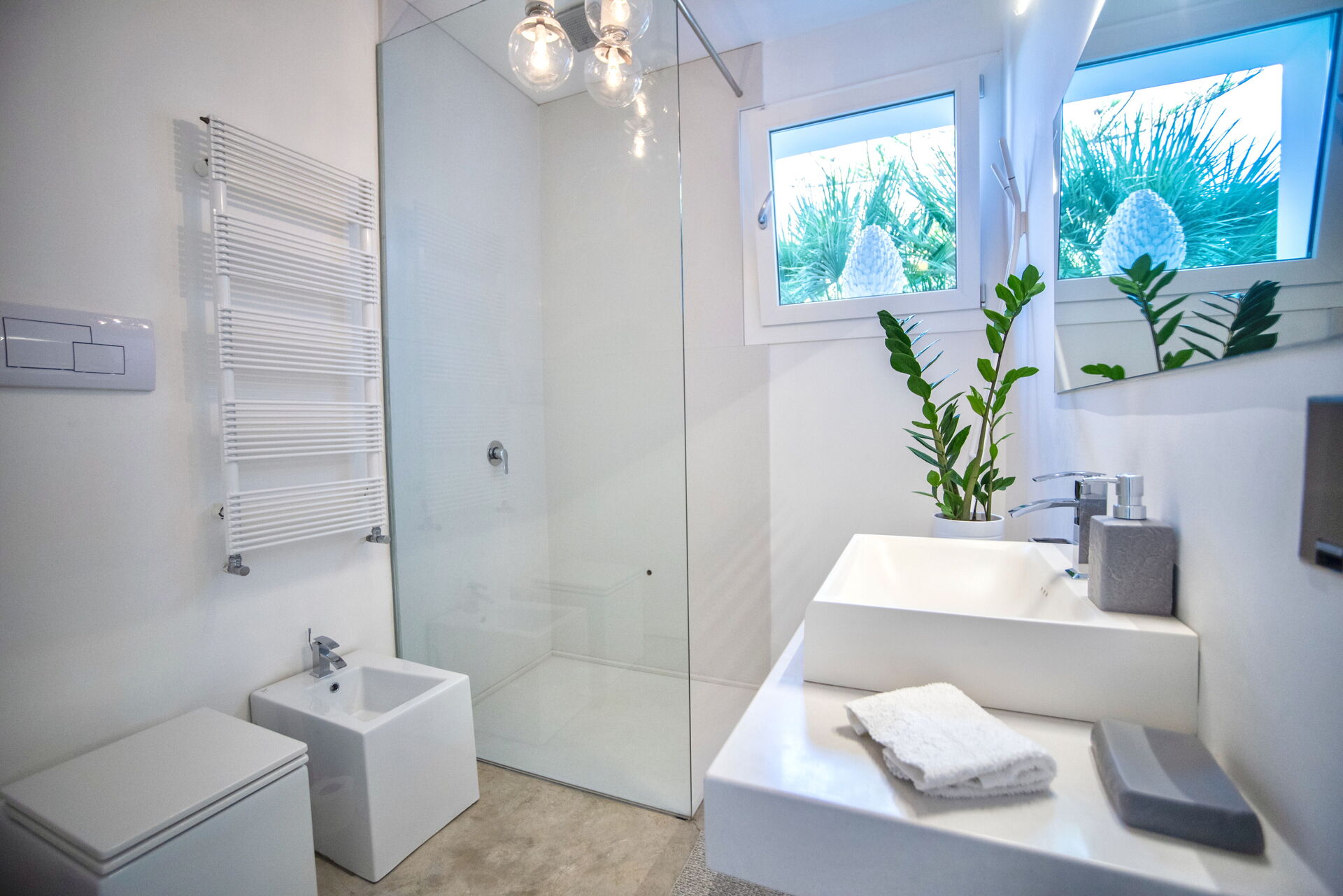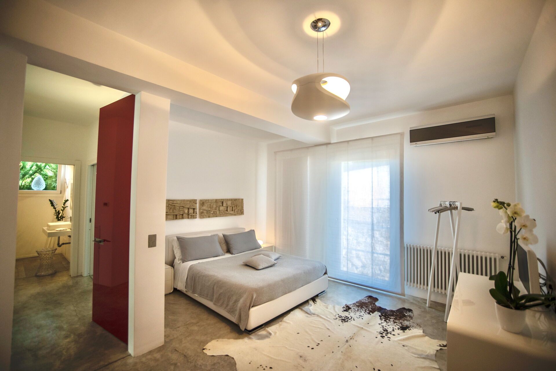 La villa dispone di due camere da letto matrimoniali e due bagni. La camera padronale con bagno in camera riprende lo stile essenziale e raffinato che contraddistingue tutti gli ambienti. Il bagno dispone di una particolare doccia/vasca, realizzata sempre con le tecniche del cemento naturale e ciò conferisce all’ambiente una nota esotica ed elegante nel contempo.