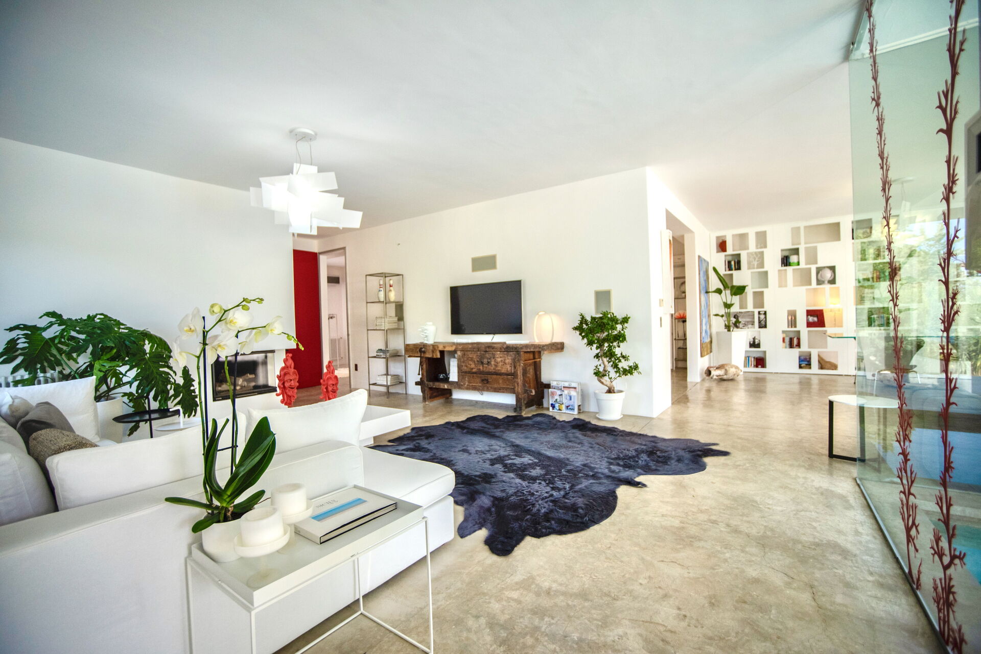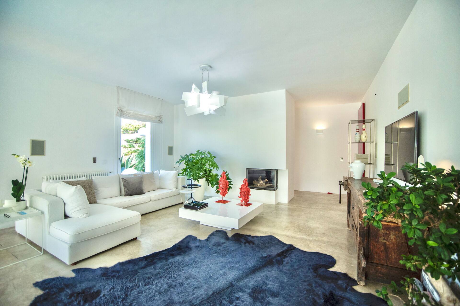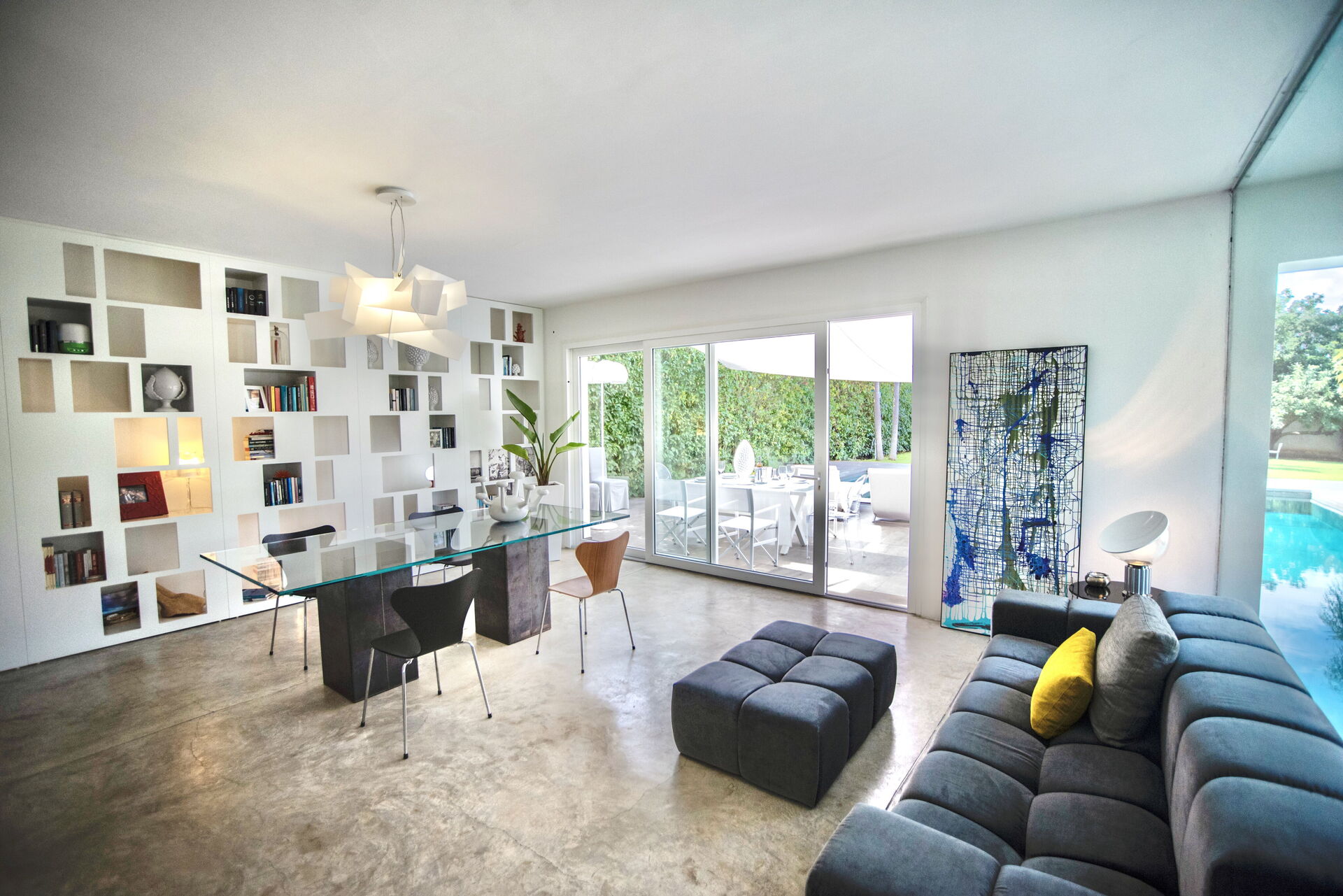 L’ampia zona giorno si articola in soggiorno, pranzo e cucina in una fluida continuità planimetrica, sottolineata dal pavimento in cemento naturale e dalle ampie vetrate che ridefiniscono lo spazio interno diventando un tutt’uno con l’esterno.