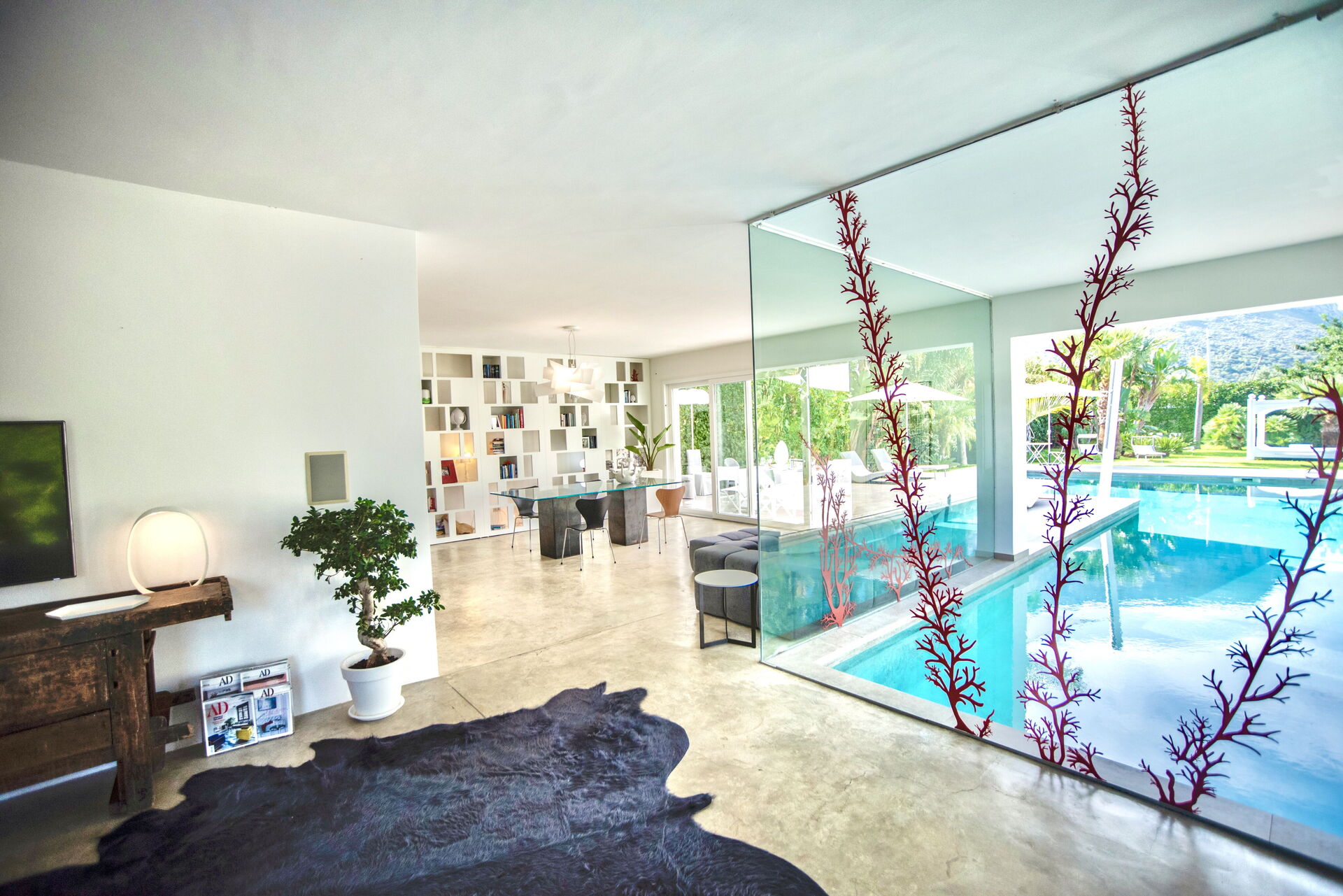 Ciò consente di godere della vista della piscina che si protende dal punto di vista ottico verso l’interno della zona giorno.
