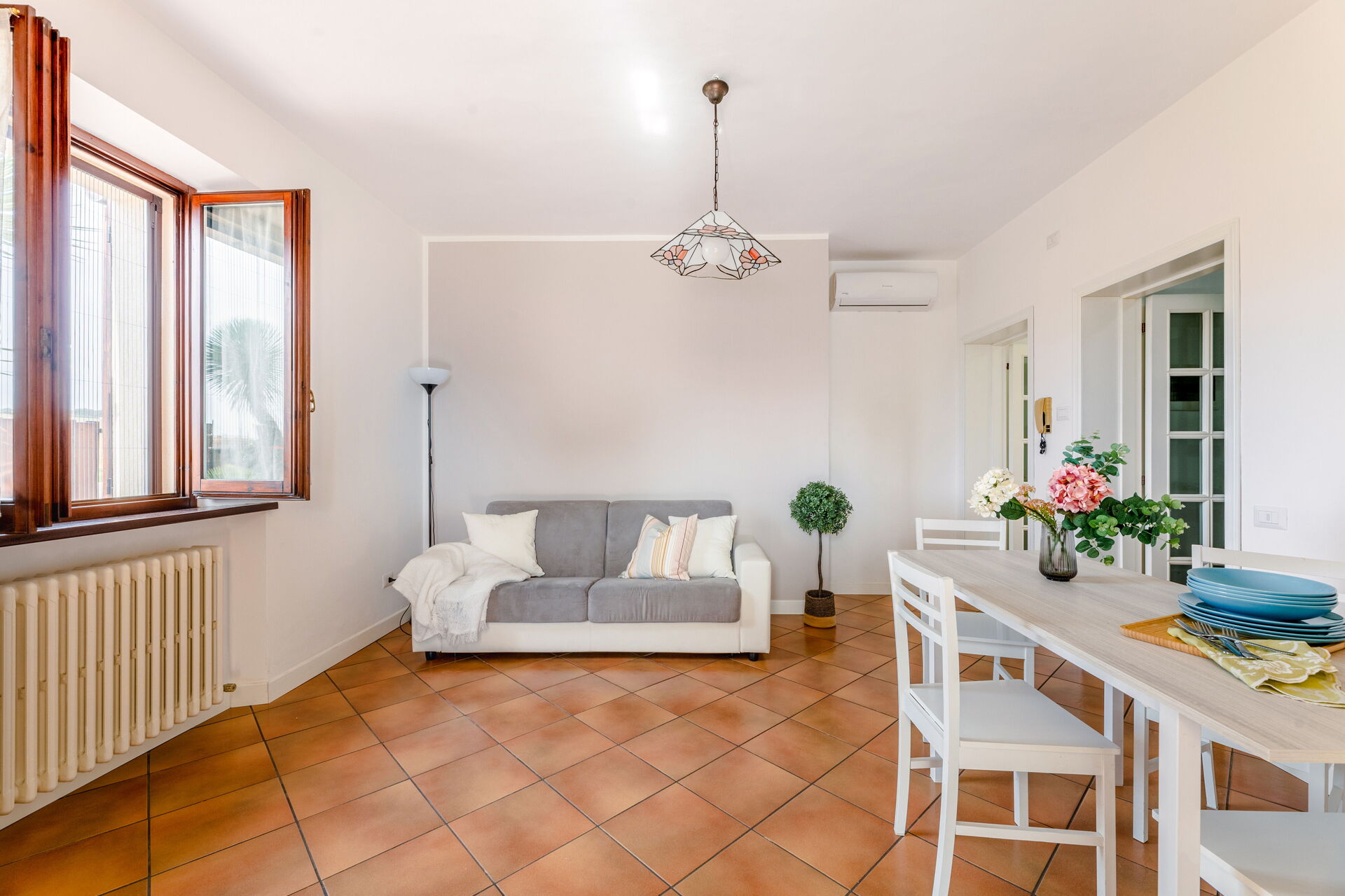Cucina - soggiorno: cucina ben attrezzata, frigo, freezer, forno, divano letto matrimoniale, internet WIFI, aria condizionata, uscita sul giardino.