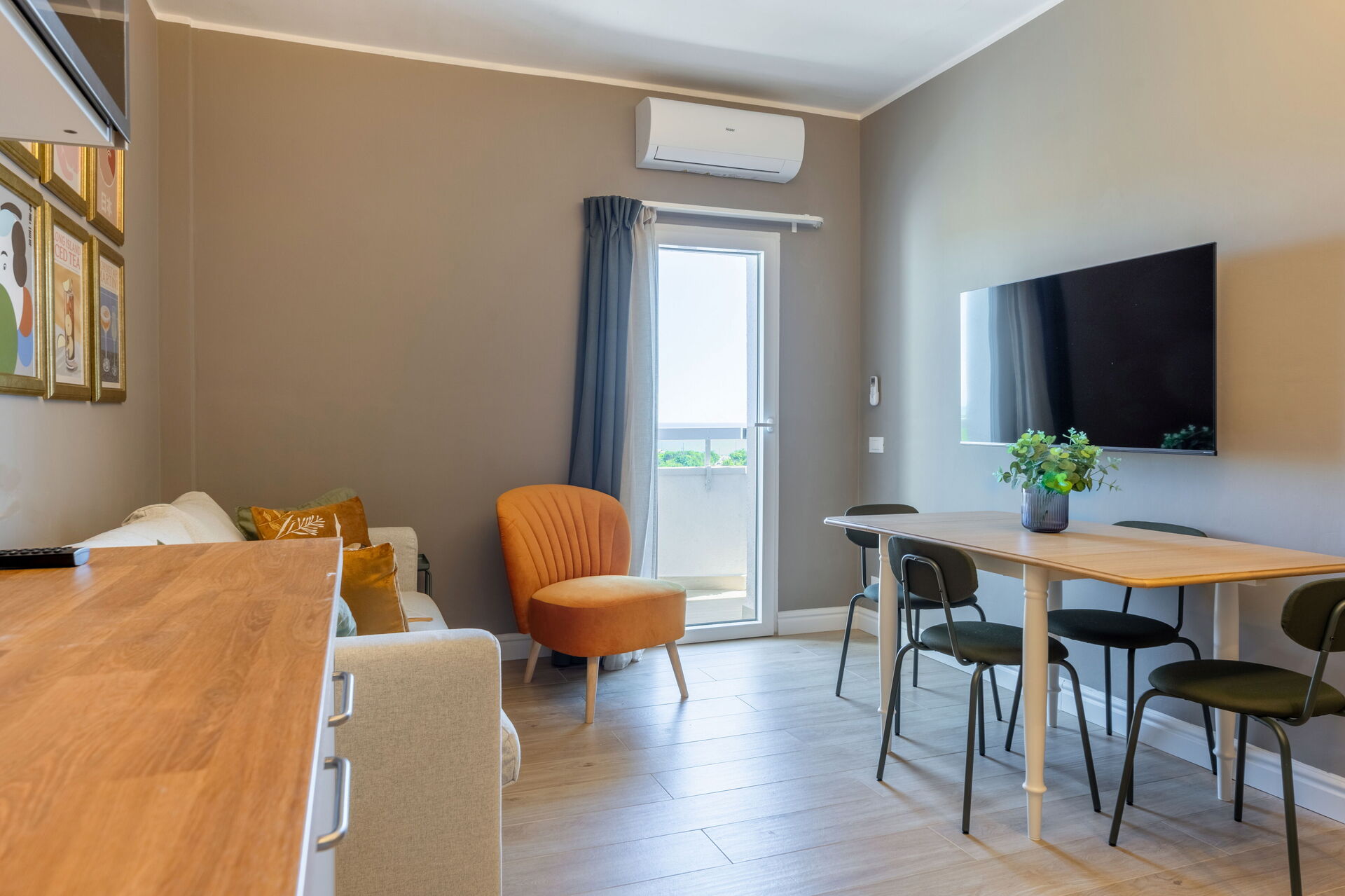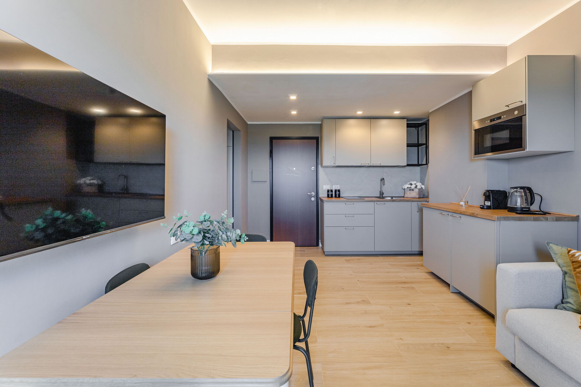 Cucina - soggiorno: cucina ben attrezzata, tavolo da pranzo, frigo, freezer, piano cottura, forno, ferro da stiro, macchina da caffè (italiana), poltrona, divano letto matrimoniale, internet WIFI, aria condizionata, tv satellitare.