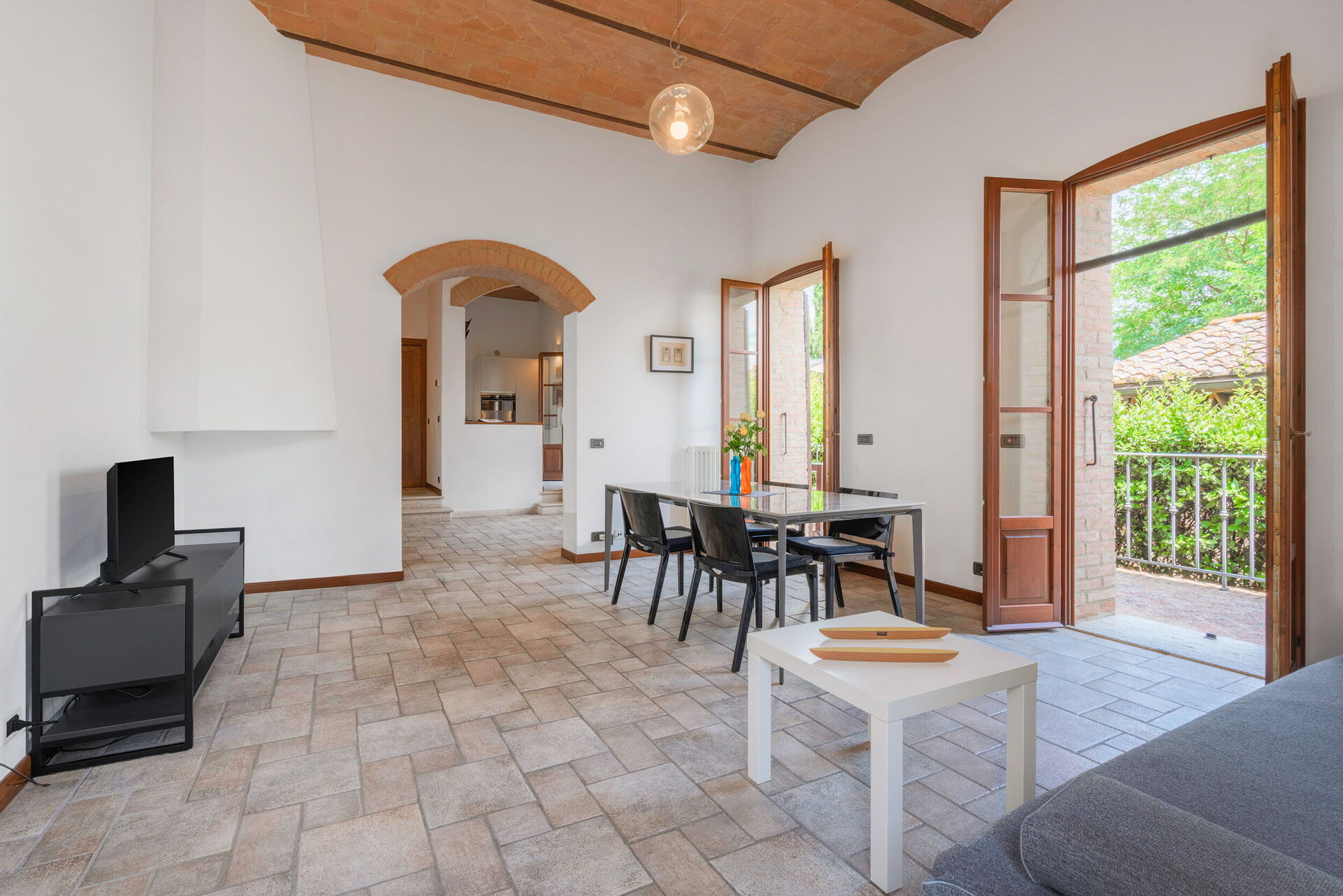 Soggiorno: divano (persone: 3), tavolo da pranzo (persone: 4), televisione, uscita sul giardino.