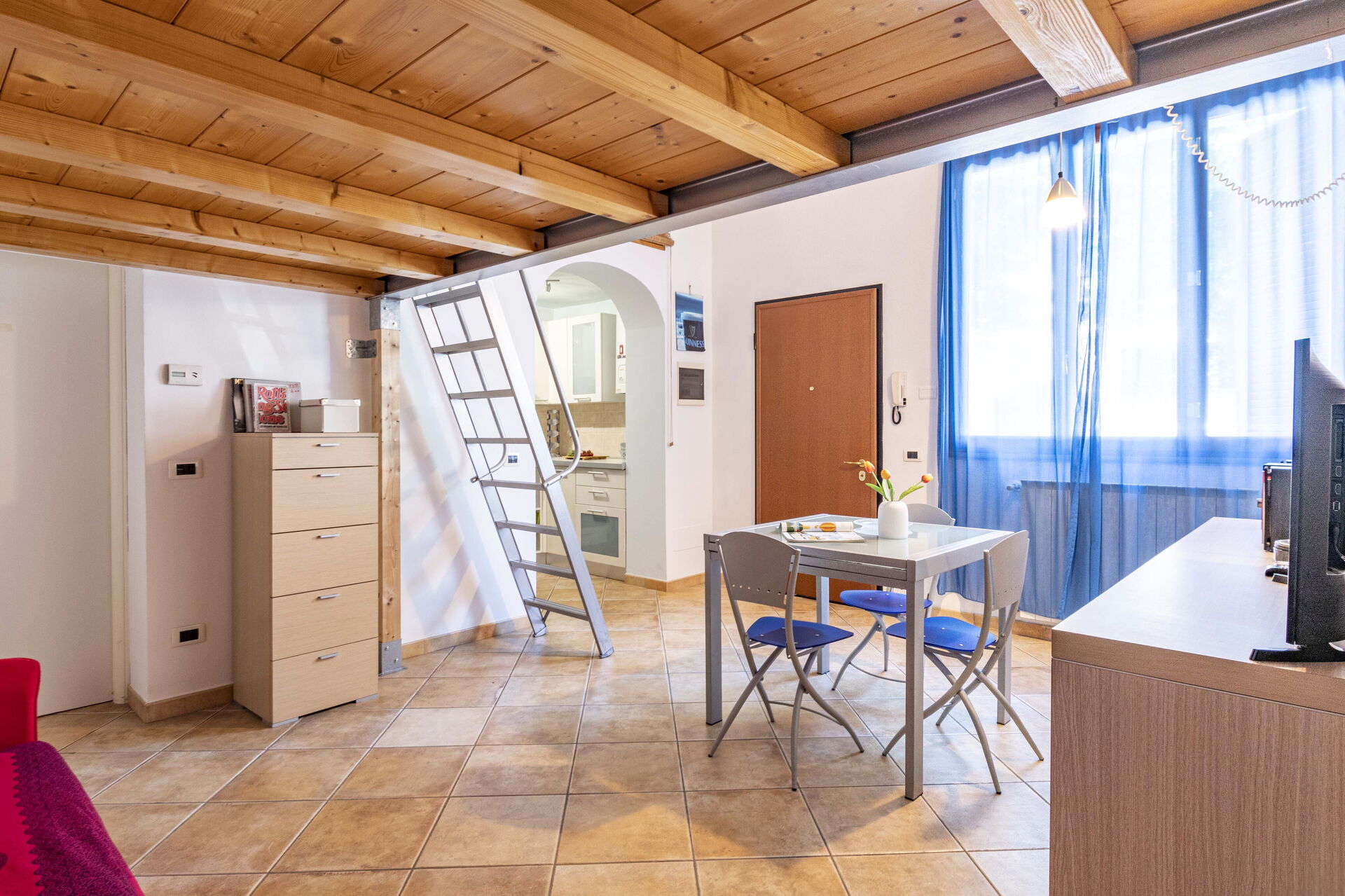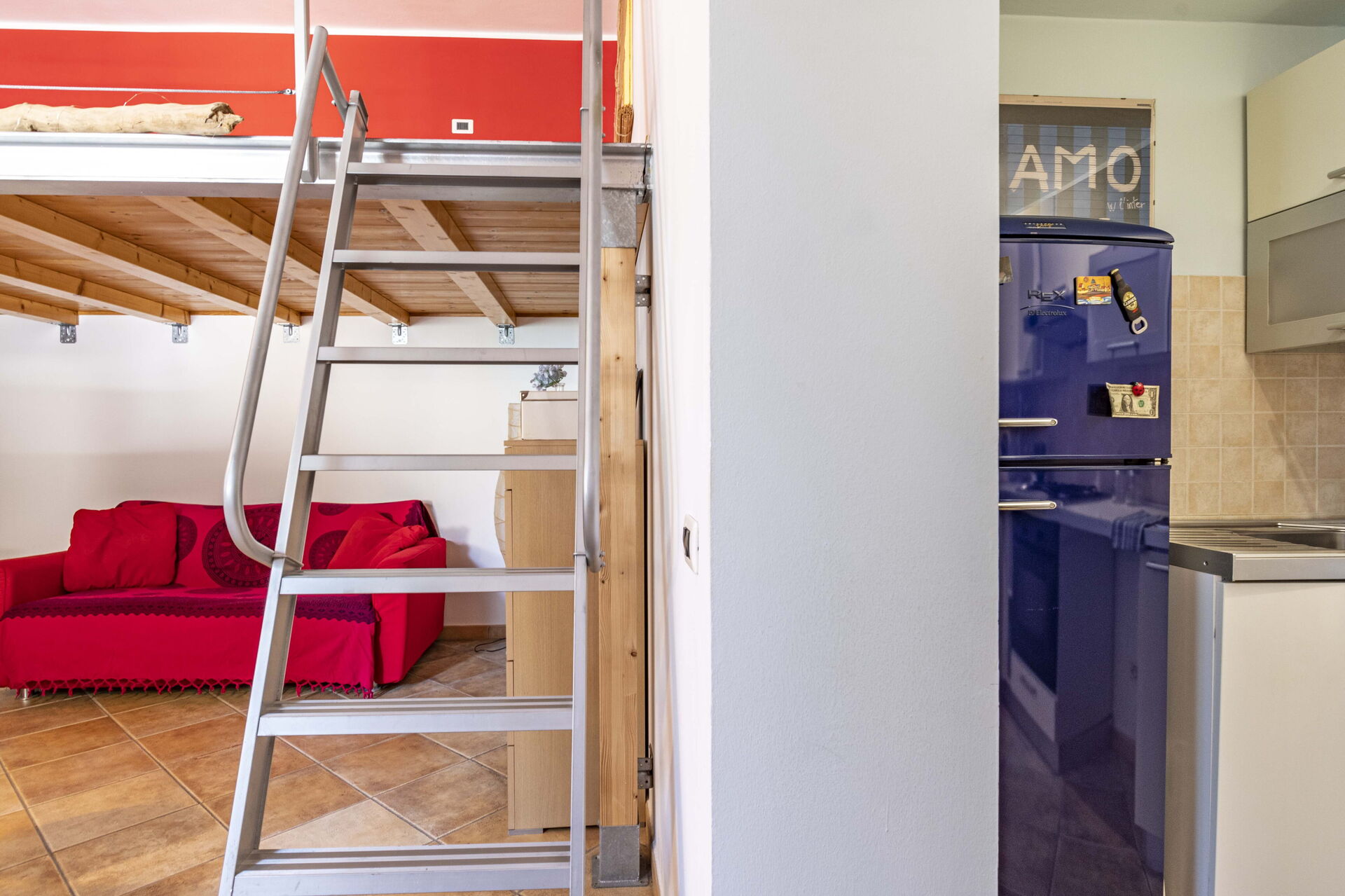 Cucina - soggiorno: cucina ben attrezzata, tavolo da pranzo, frigo, freezer, piano cottura, forno, tostapane, macchina da caffè (italiana), divano letto matrimoniale, internet WIFI, tv satellitare, soppalco.