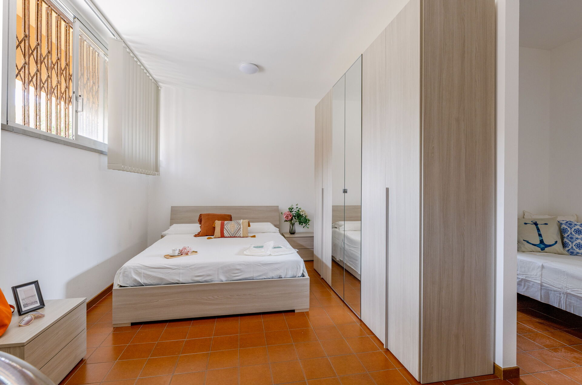 Cucina - soggiorno: cucina ben attrezzata, tavolo da pranzo, freezer, piano cottura, forno, macchina da caffè (italiana), divano letto matrimoniale, internet WIFI, tv satellitare, uscita sul balcone.