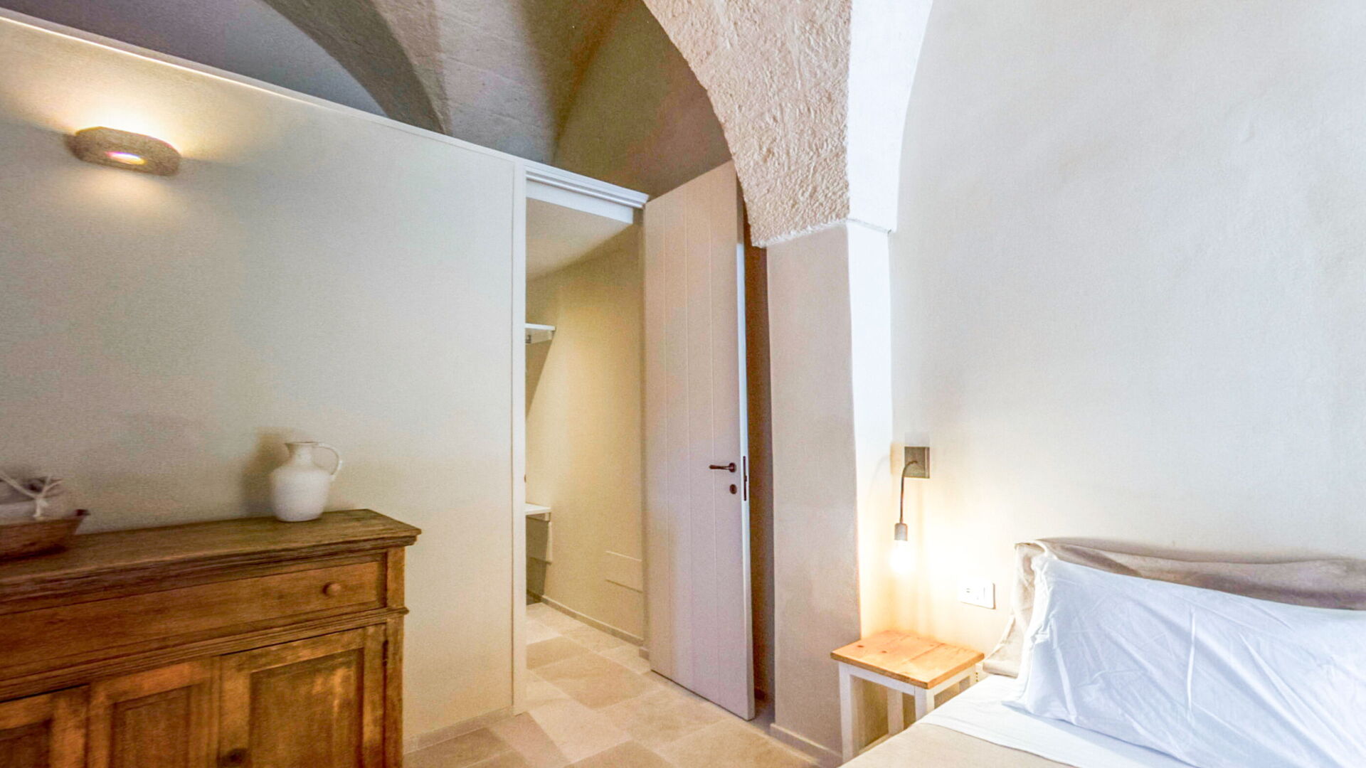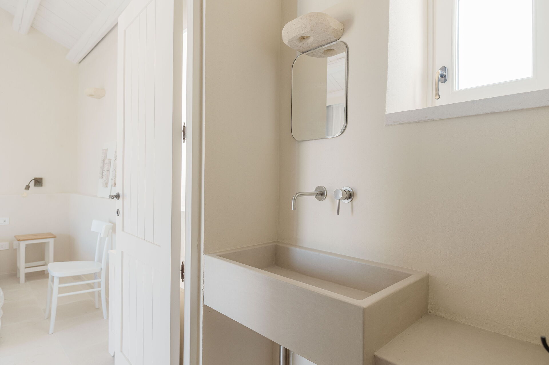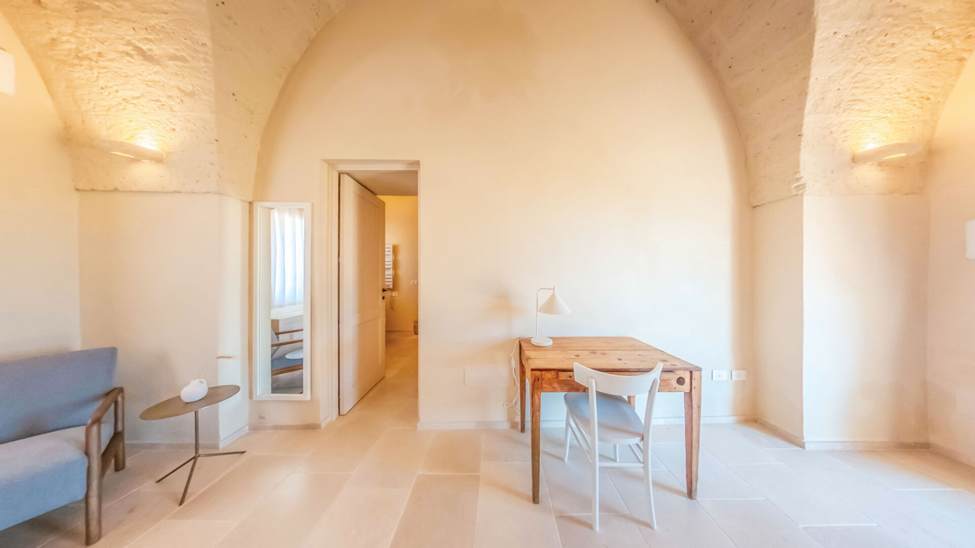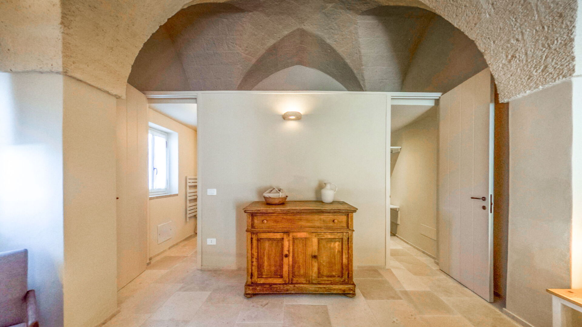 Gli arredi e i complementi sono stati realizzati su misura da artigiani locali, come fabbri e falegnami, per rispettare le forme irregolari delle pareti antiche e per garantire un’armonia estetica e funzionale. L'uso di materiali come l'ottone per i rubinetti, che invecchia naturalmente, aggiunge un fascino ulteriore agli ambienti, rievocando il passato con un tocco di modernità.
