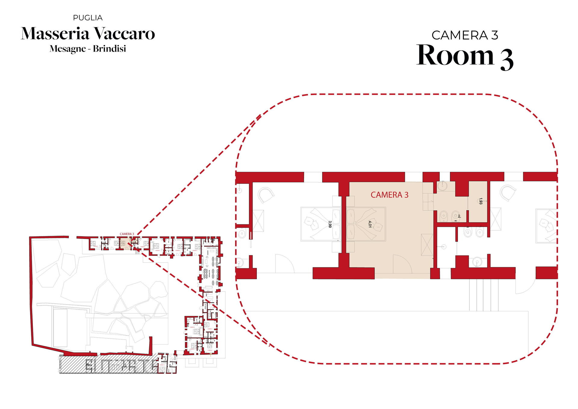 "Camera 3" è un'elegante camera matrimoniale con bagno privato e vista sul giardino nella storica Masseria Vaccaro.