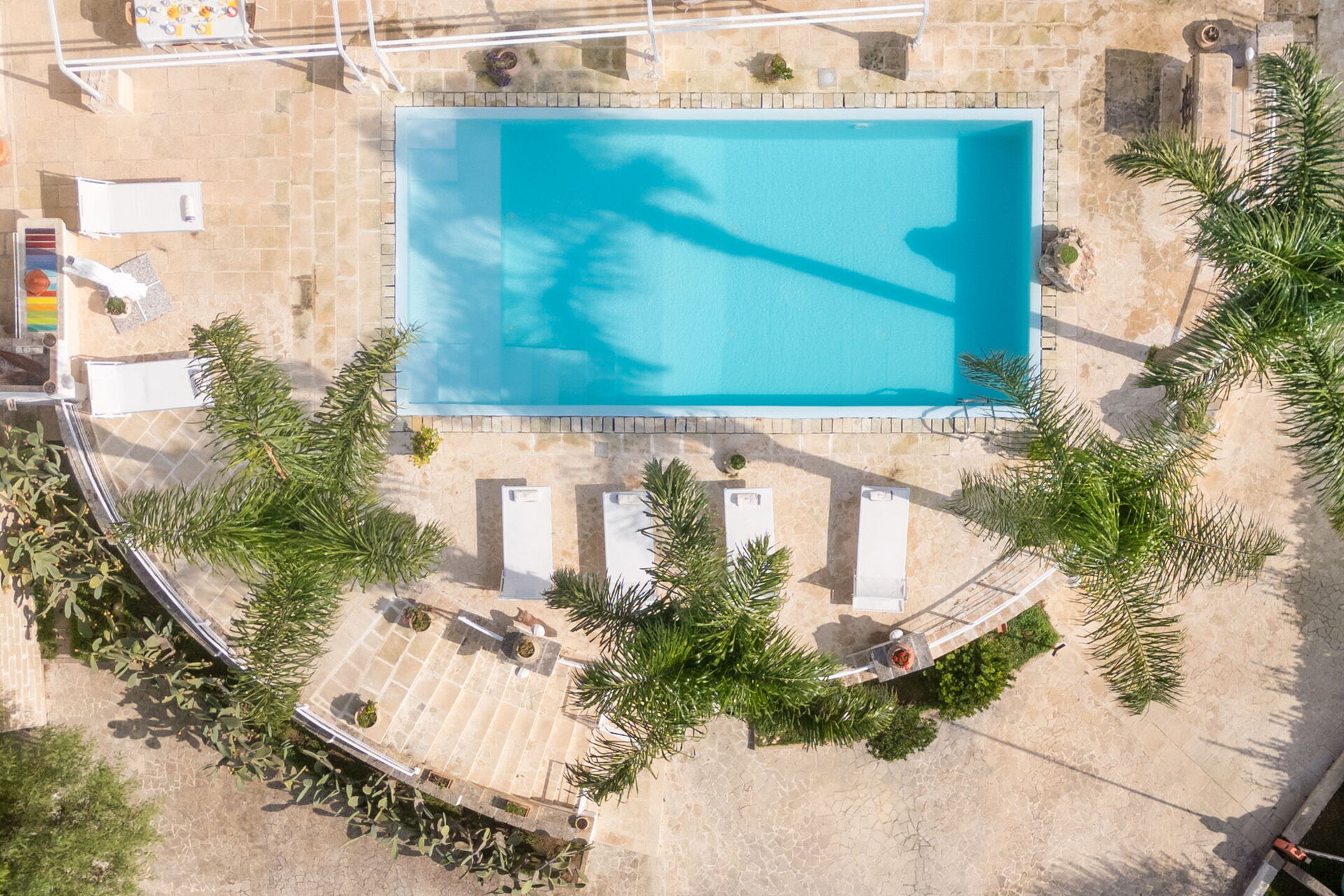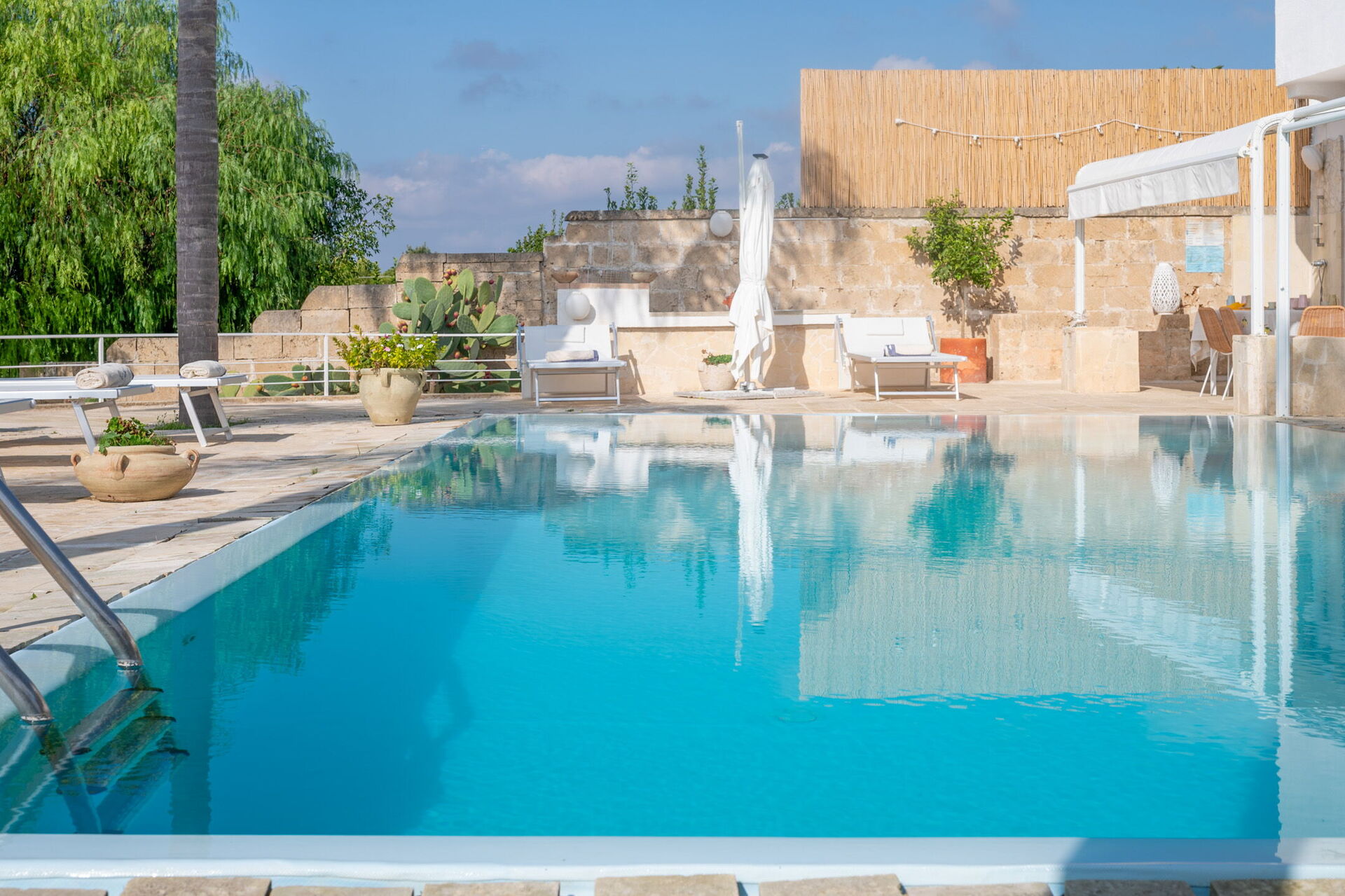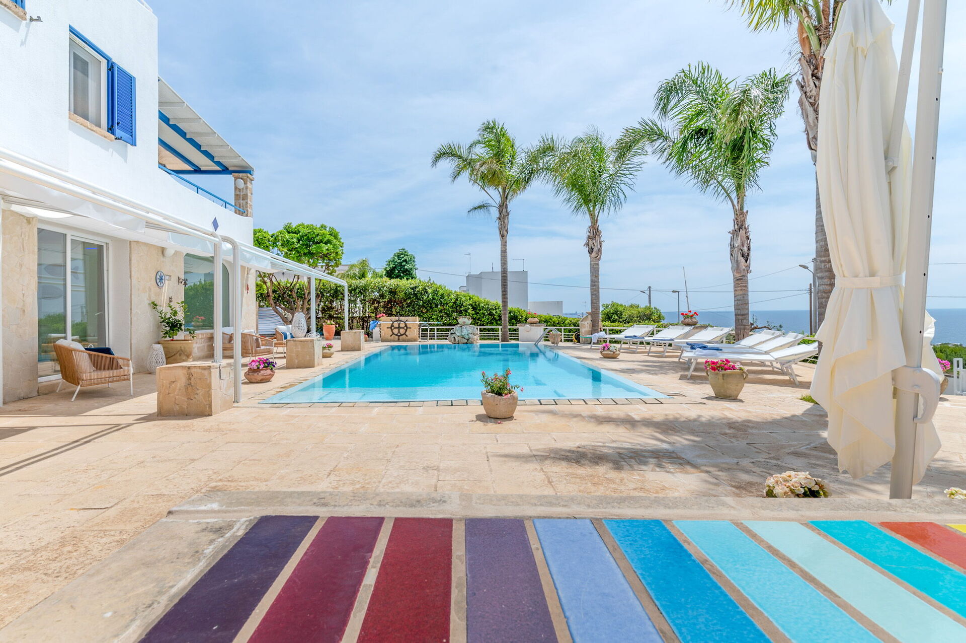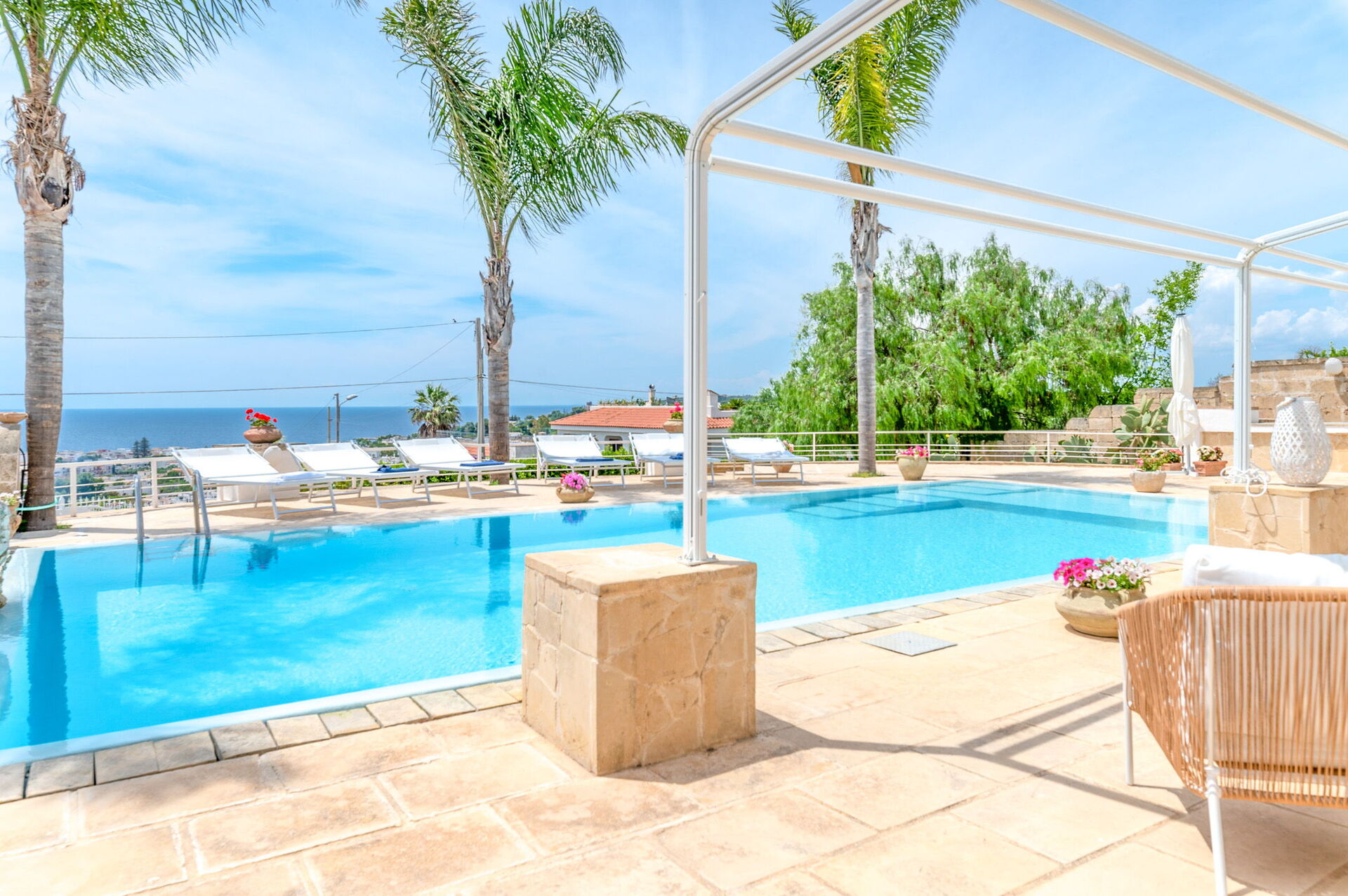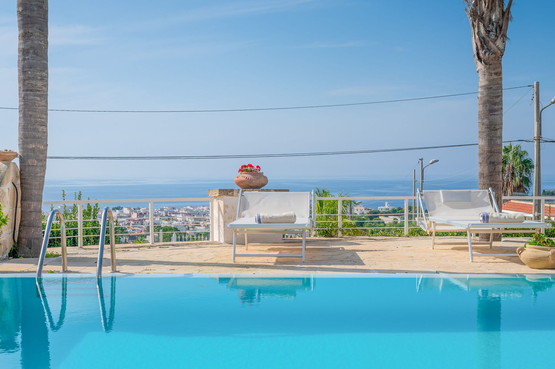 Una splendida piscina privata domina il paesaggio circostante, regalando una vista mozzafiato sul litorale di Santa Maria al Bagno. Circondata da lettini prendisole, ombrelloni e palme, è il luogo perfetto per rilassarti e goderti il sole.