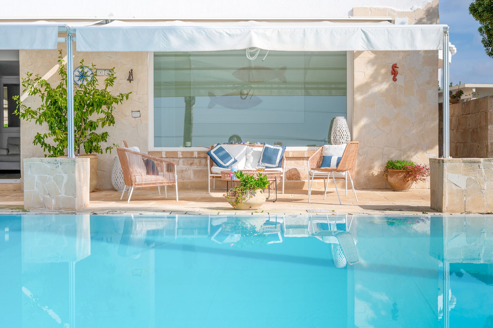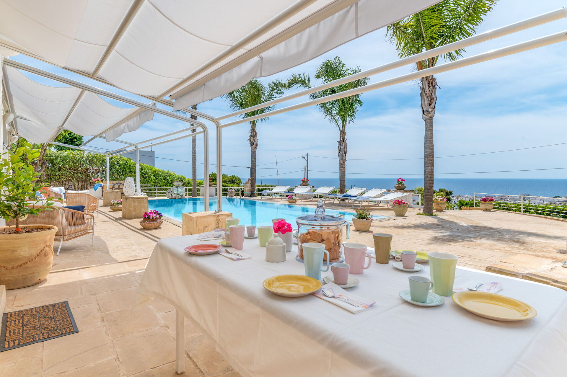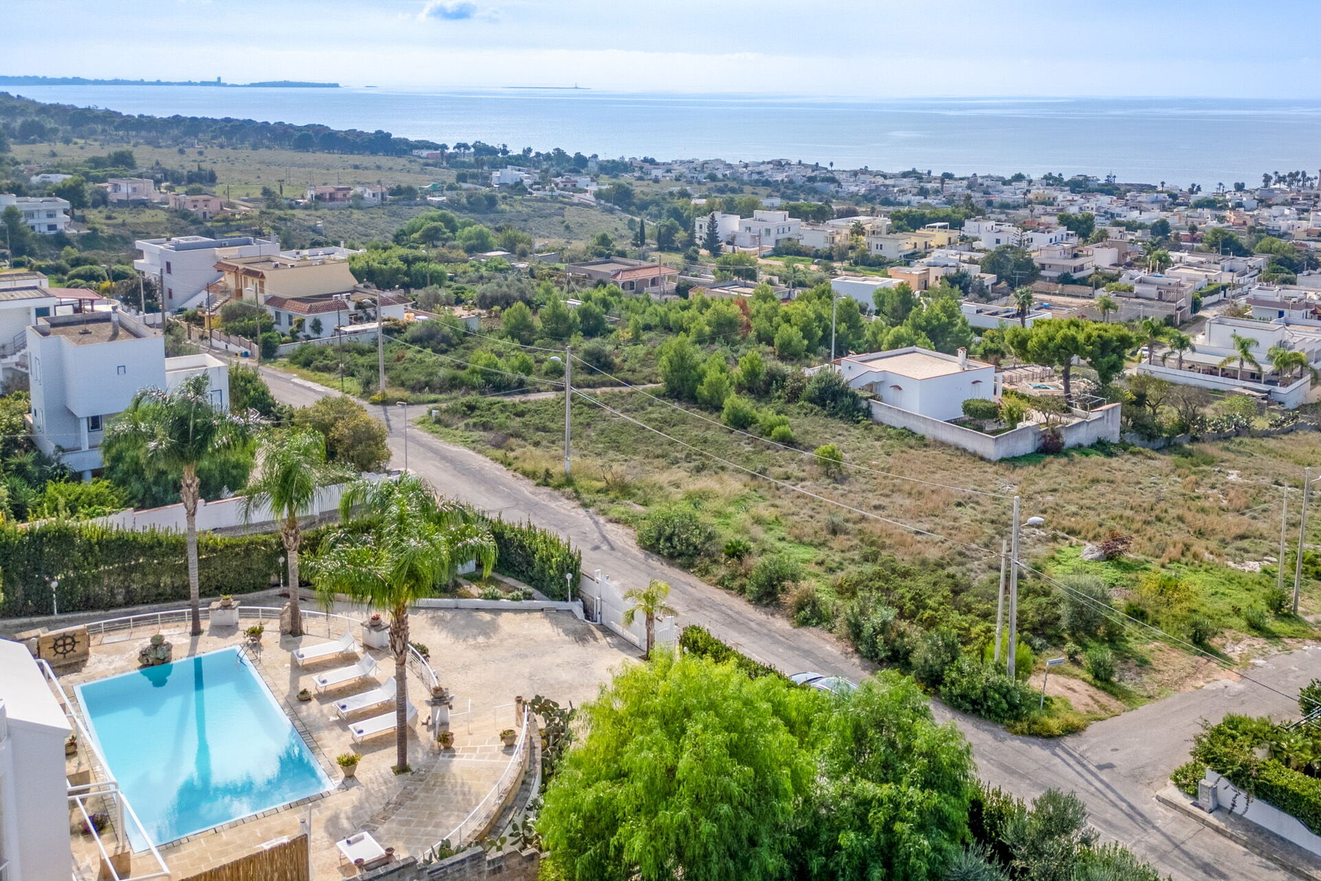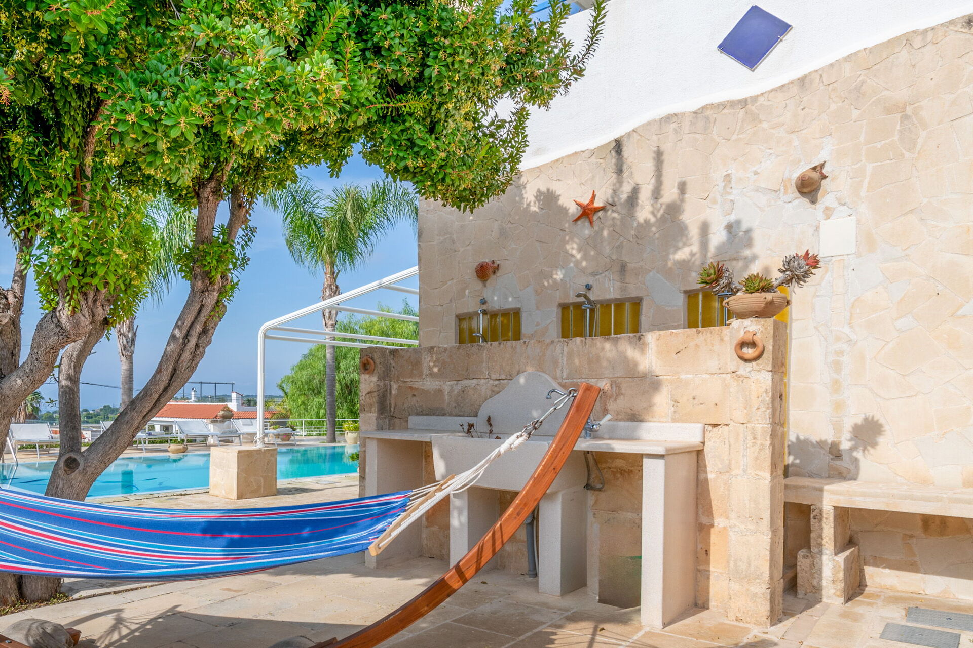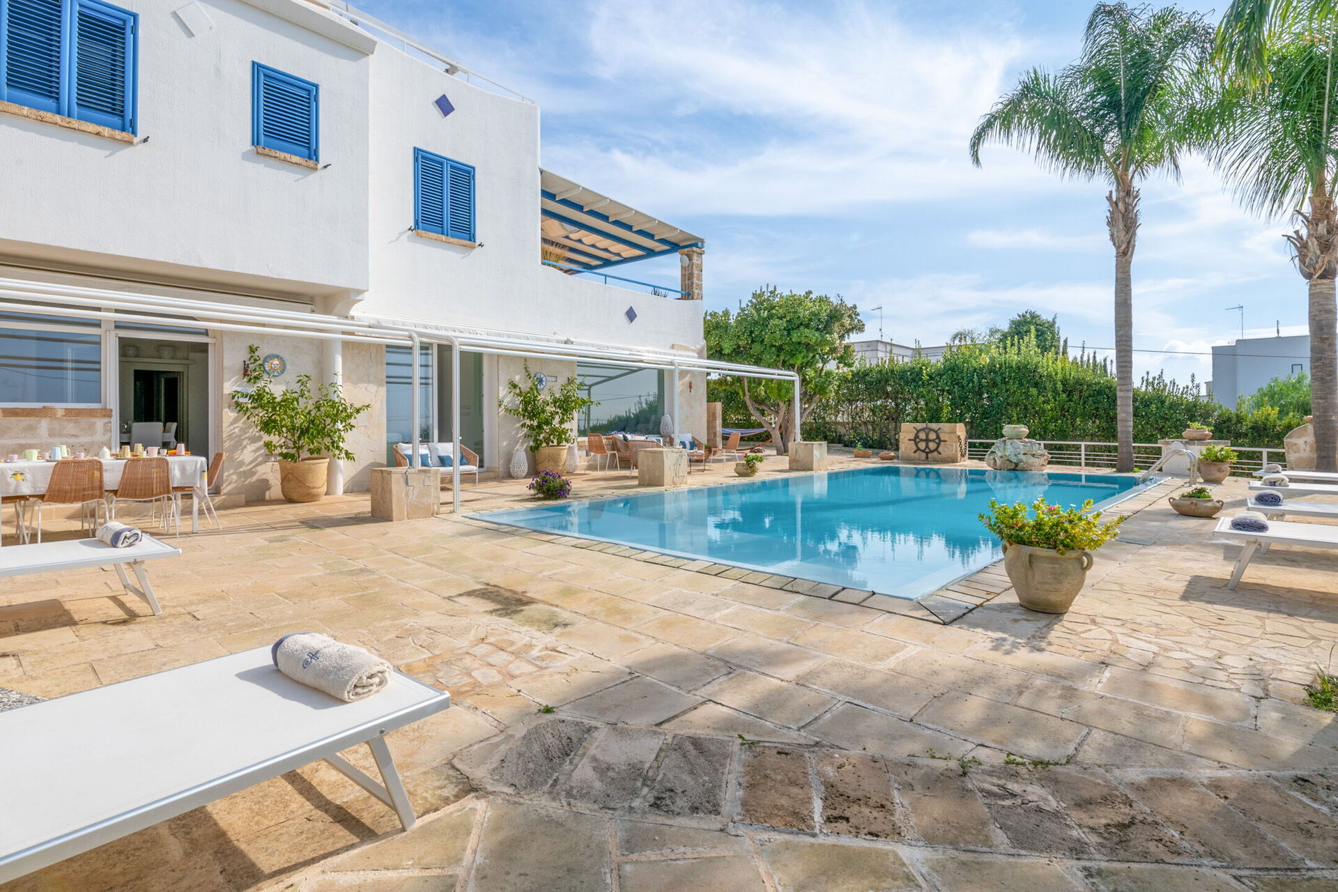Una splendida piscina privata domina il paesaggio circostante, regalando una vista mozzafiato sul litorale di Santa Maria al Bagno. Circondata da lettini prendisole, ombrelloni e palme, è il luogo perfetto per rilassarti e goderti il sole.