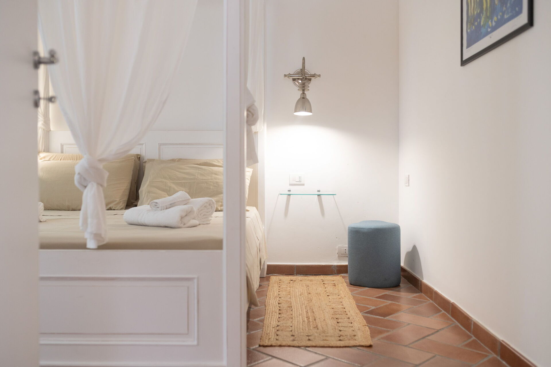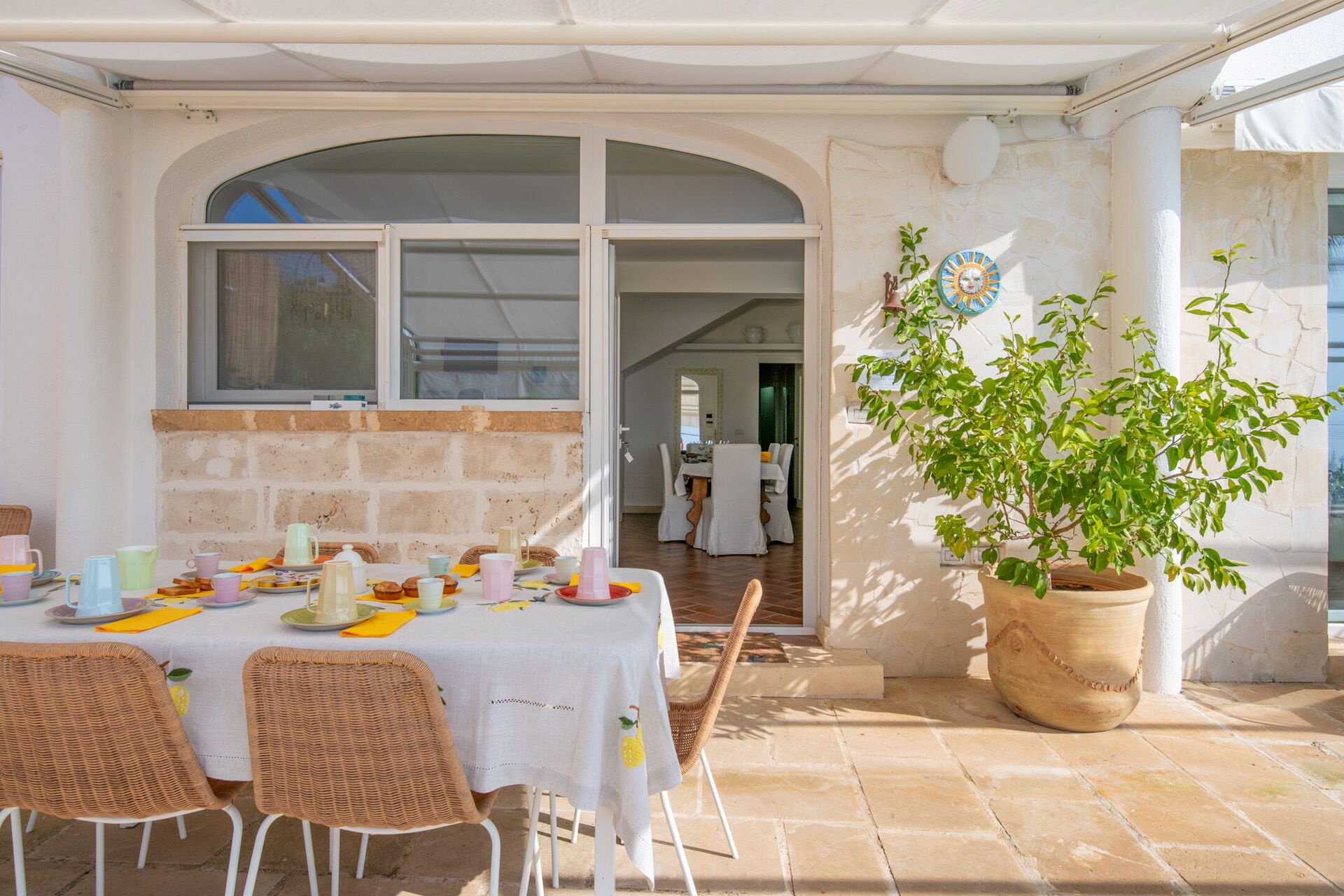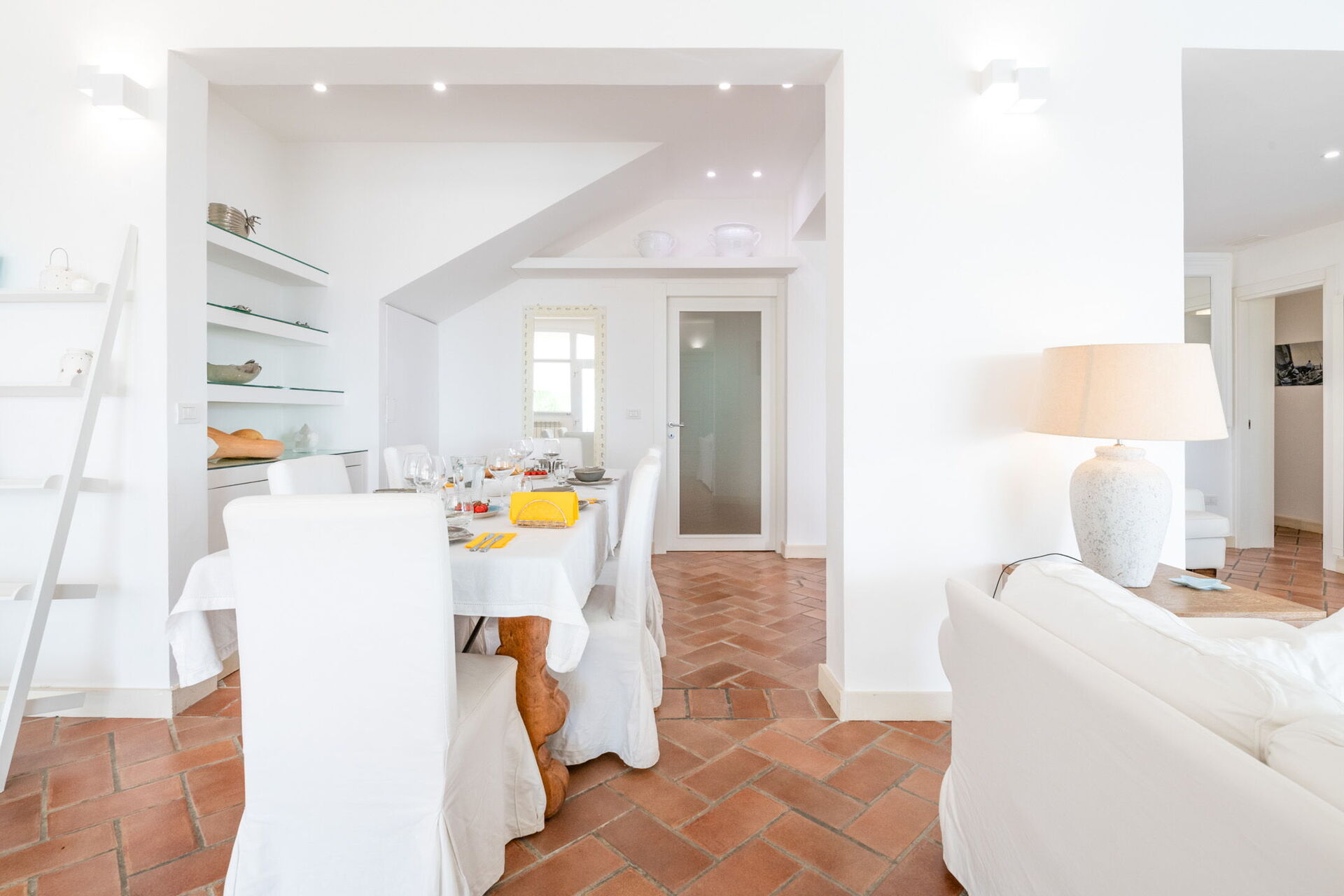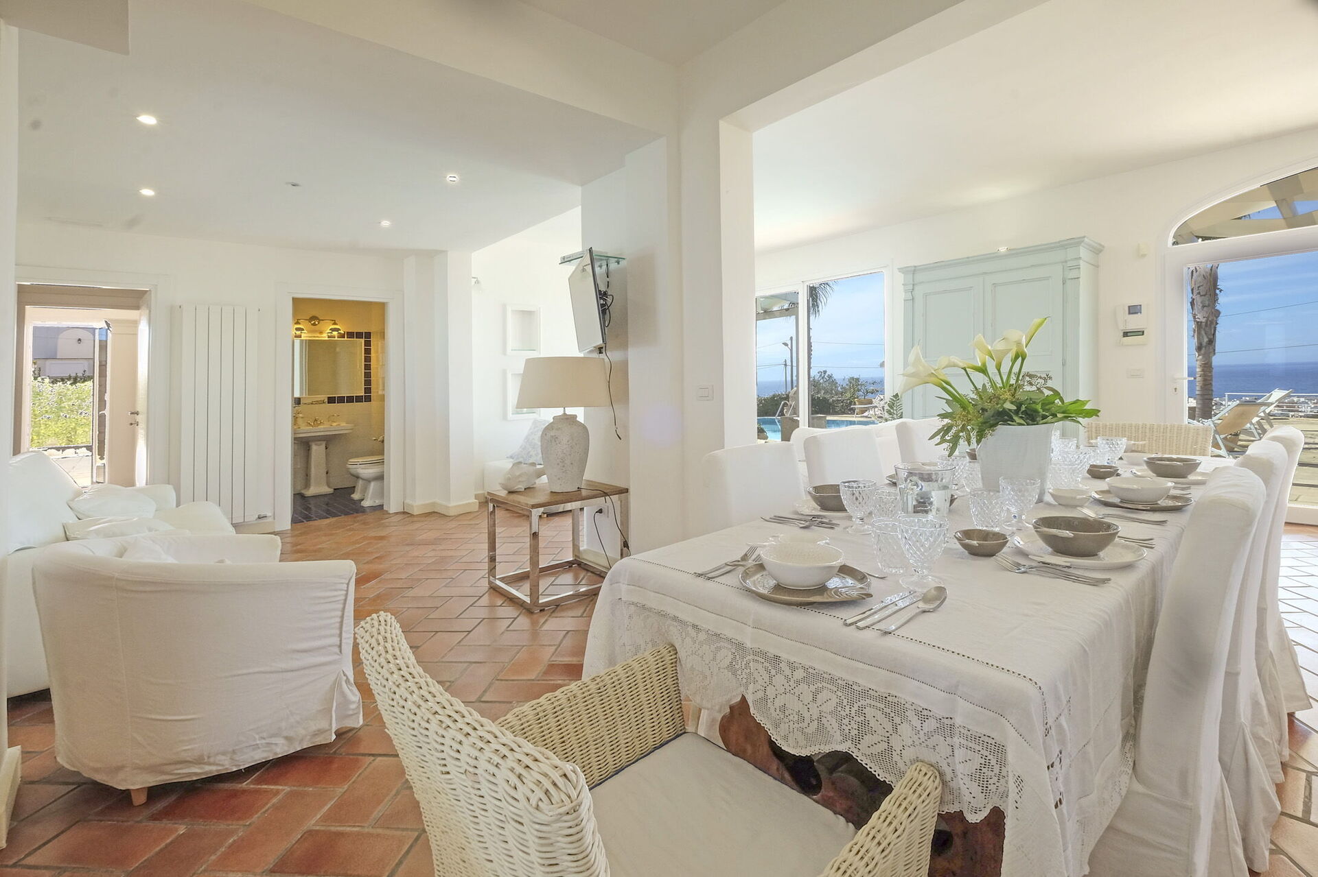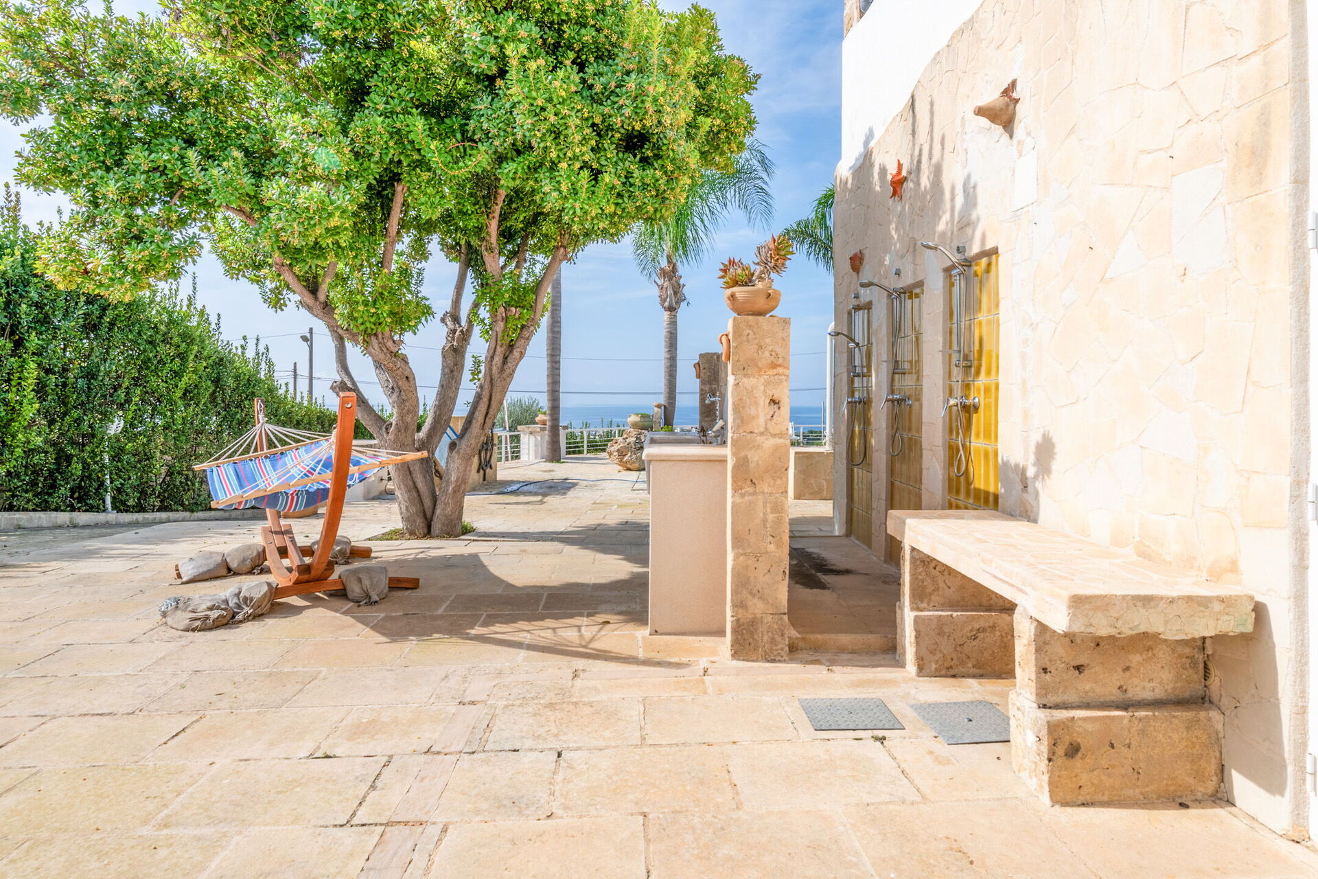 Il giardino è un’oasi di verde, arricchito da palme e vegetazione mediterranea che creano un’atmosfera tranquilla e riservata. Ti regala inoltre viste spettacolari sul mare e sui dintorni, rendendola ideale per aperitivi al tramonto o momenti di relax serale sotto le stelle.