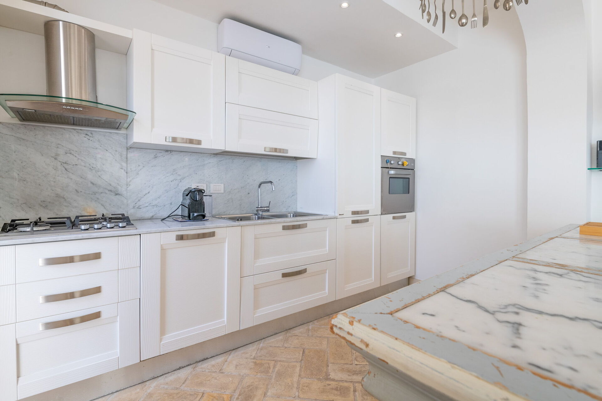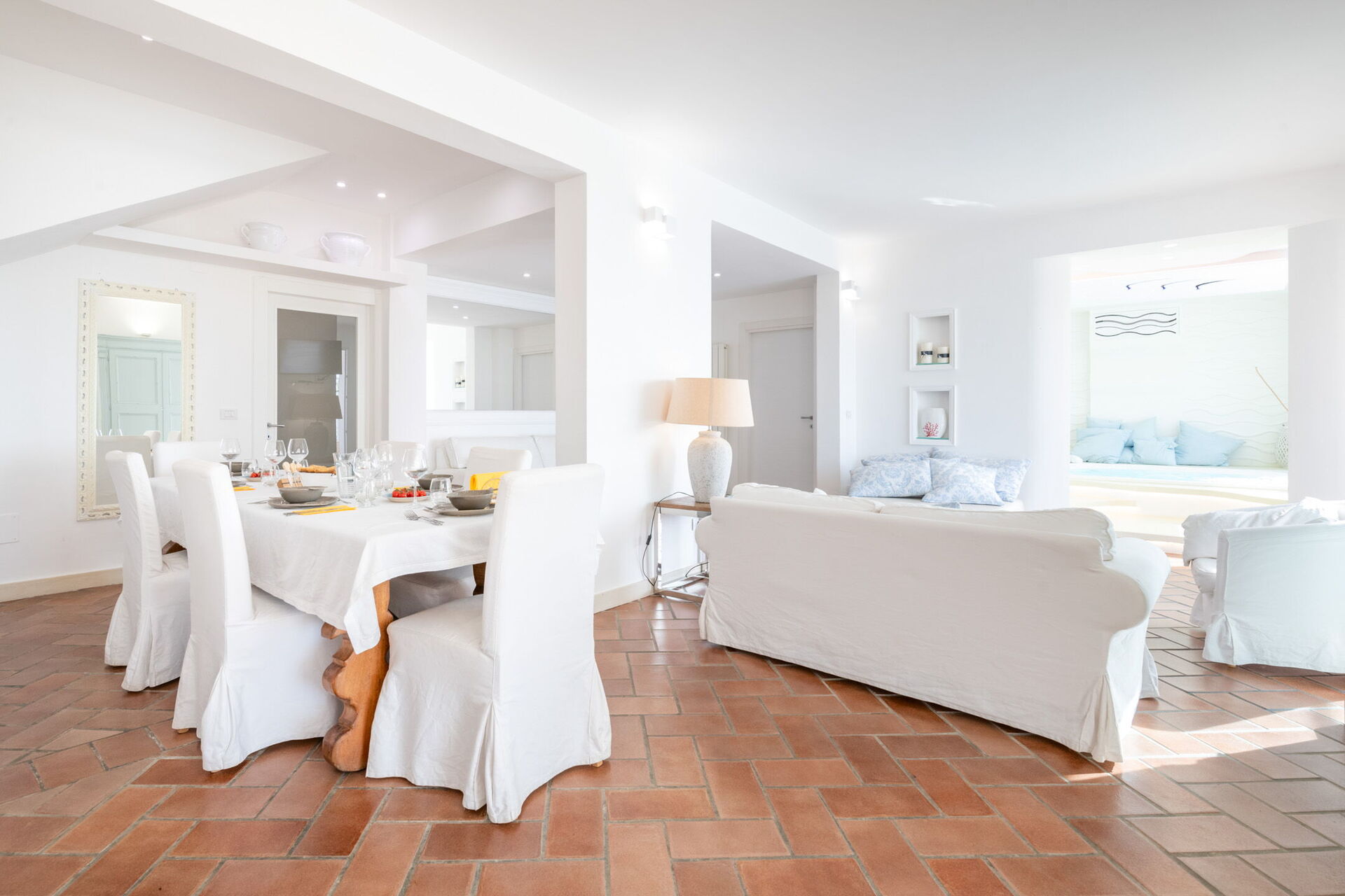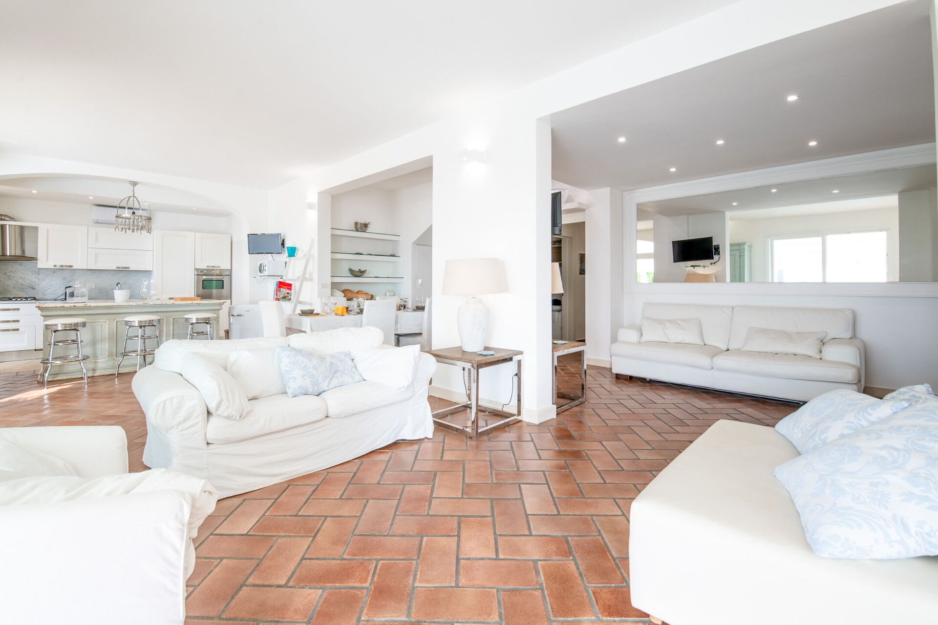 Alloggiamento spazioso: 5 camere da letto (3 matrimoniali, 1 con letto alla francese, 1 con due letti singoli), 4 bagni, soggiorno con sala da pranzo e bagno di servizio.